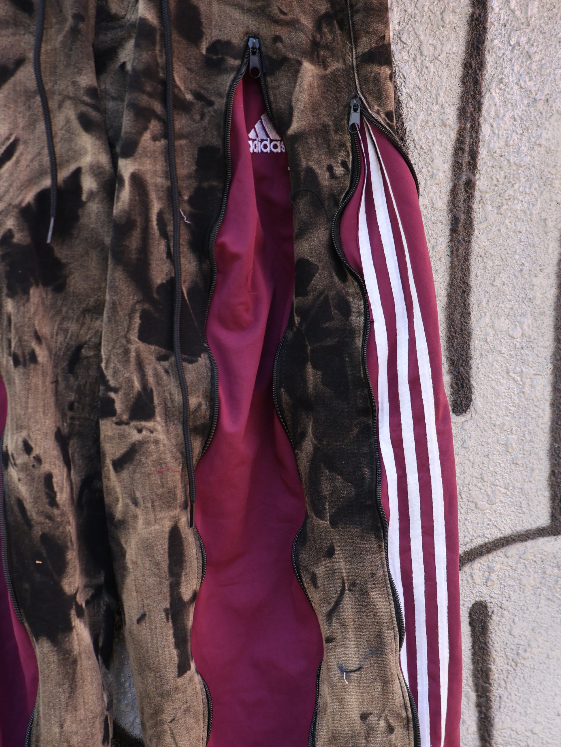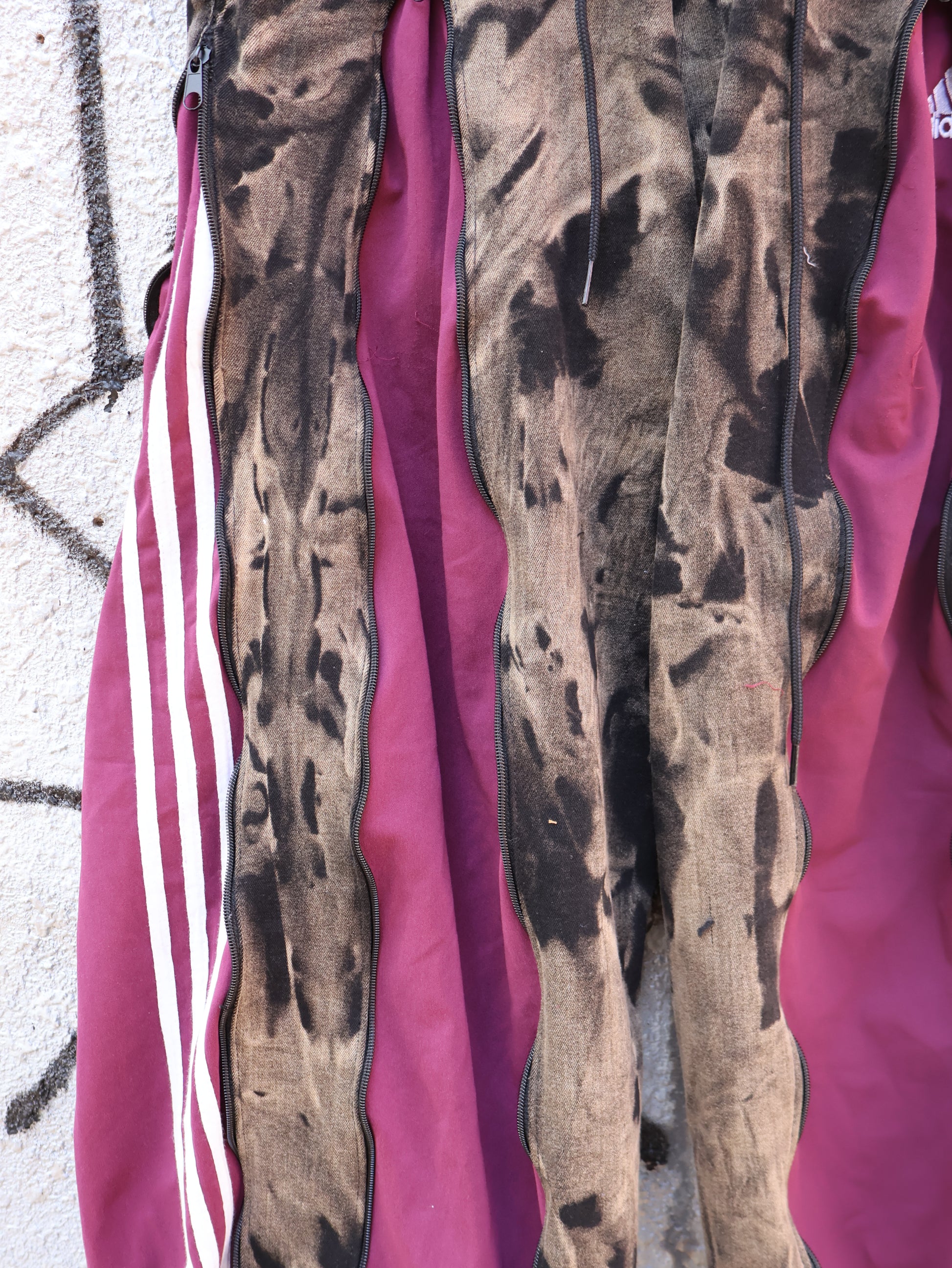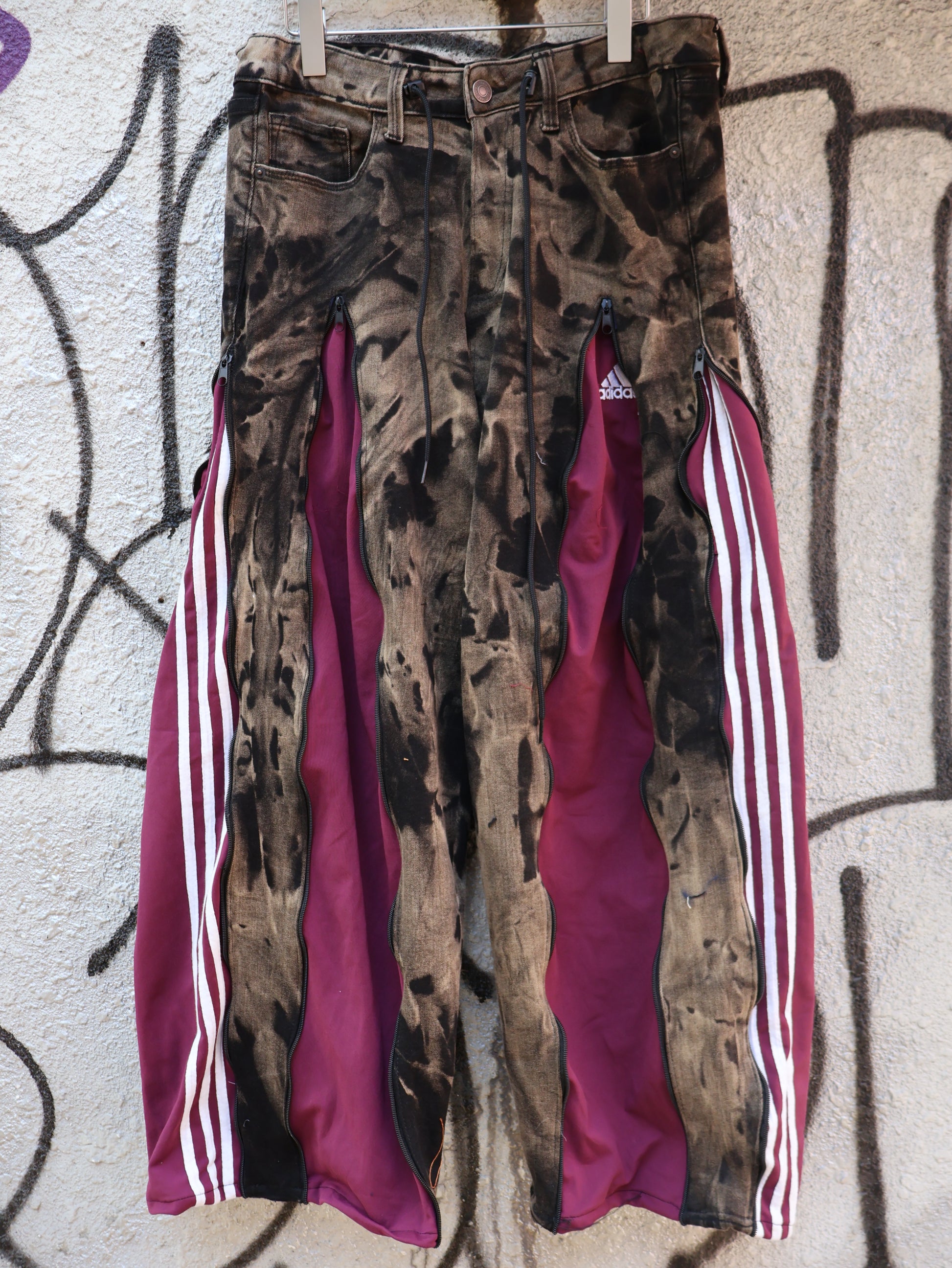 古着のデニムとジャージでリメイクされた1点もののパンツ。