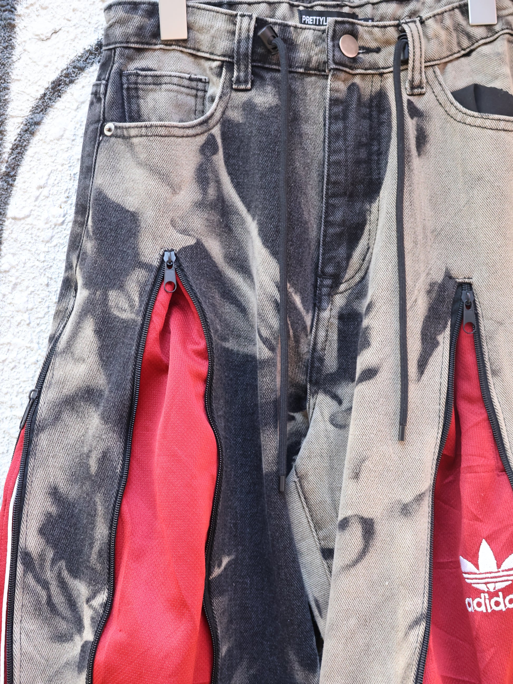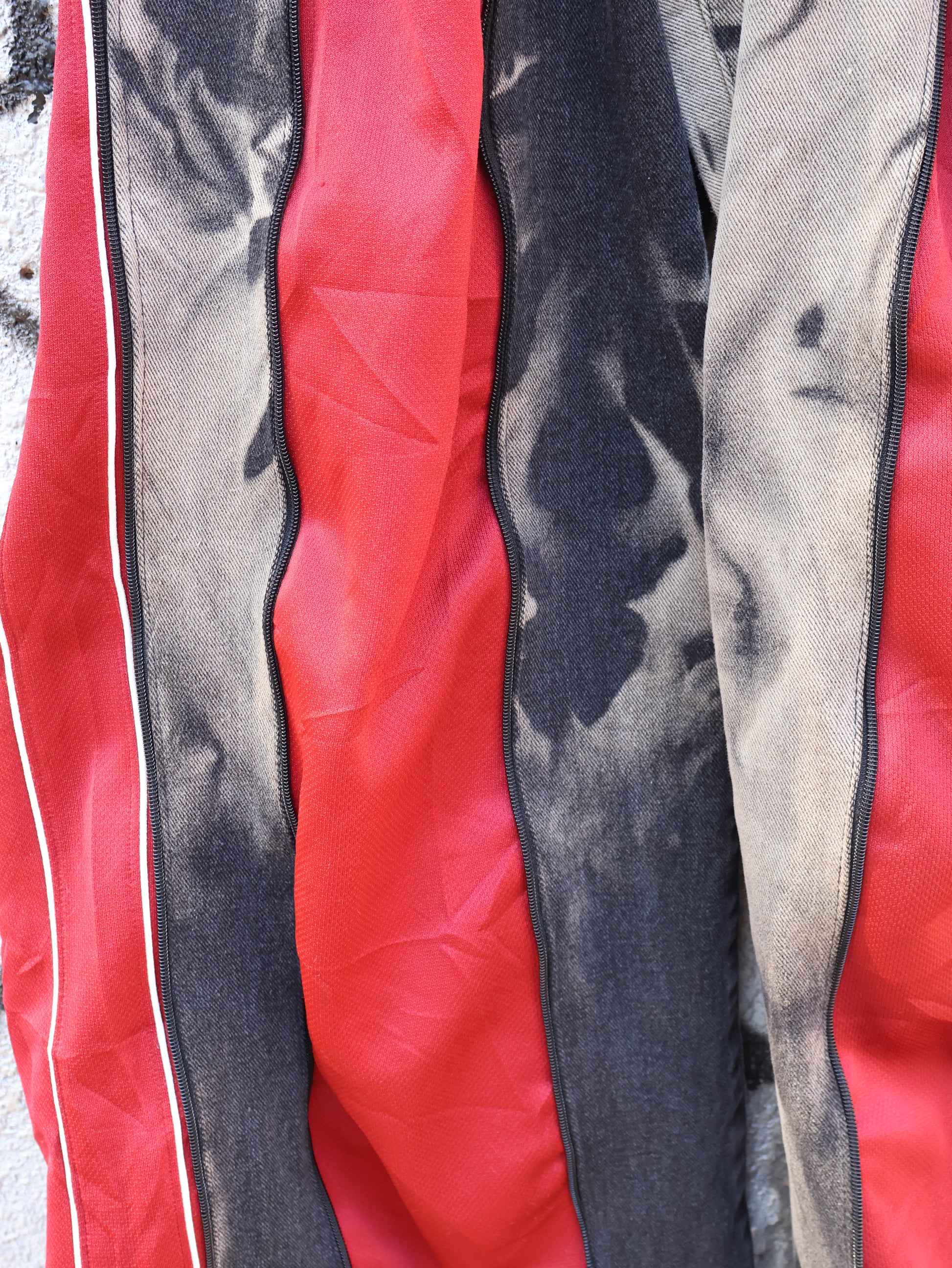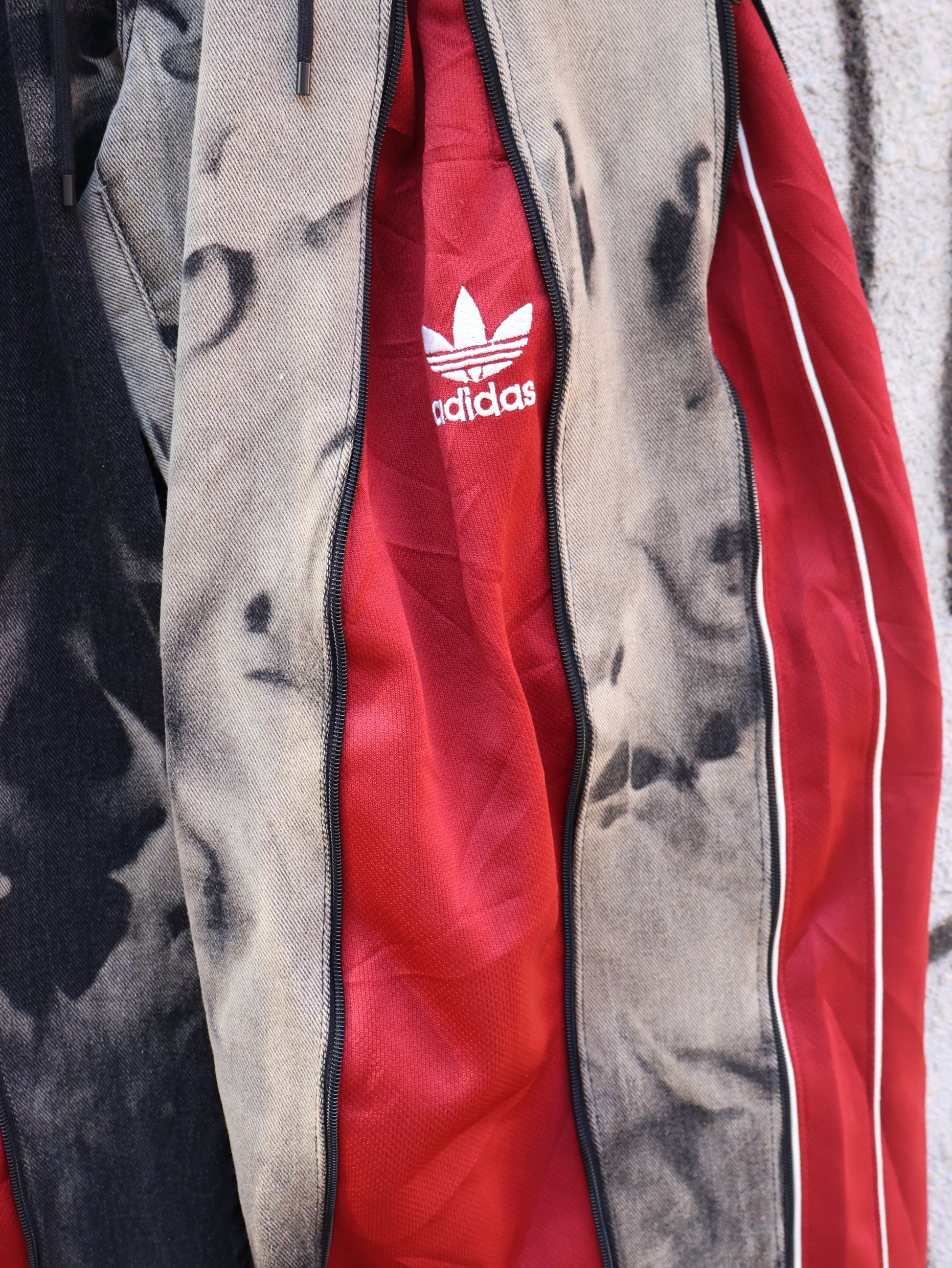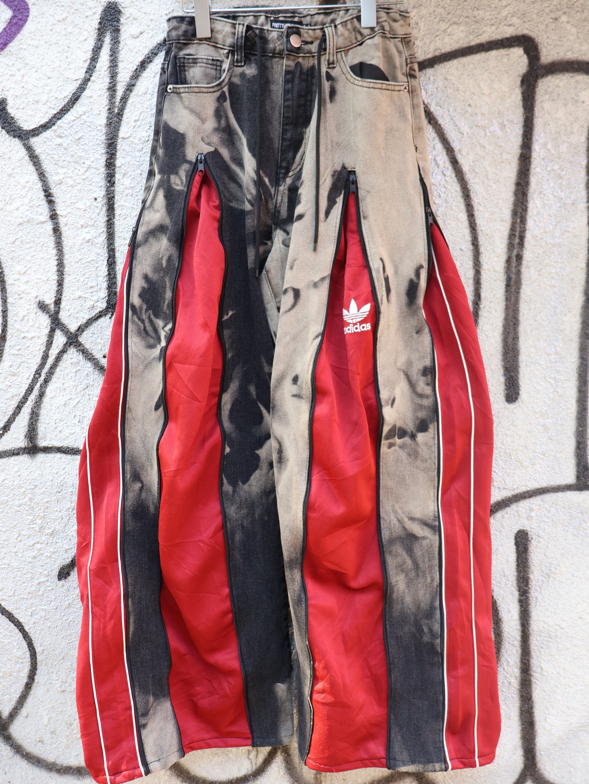 古着のデニムとジャージでリメイクされた1点もののパンツ。