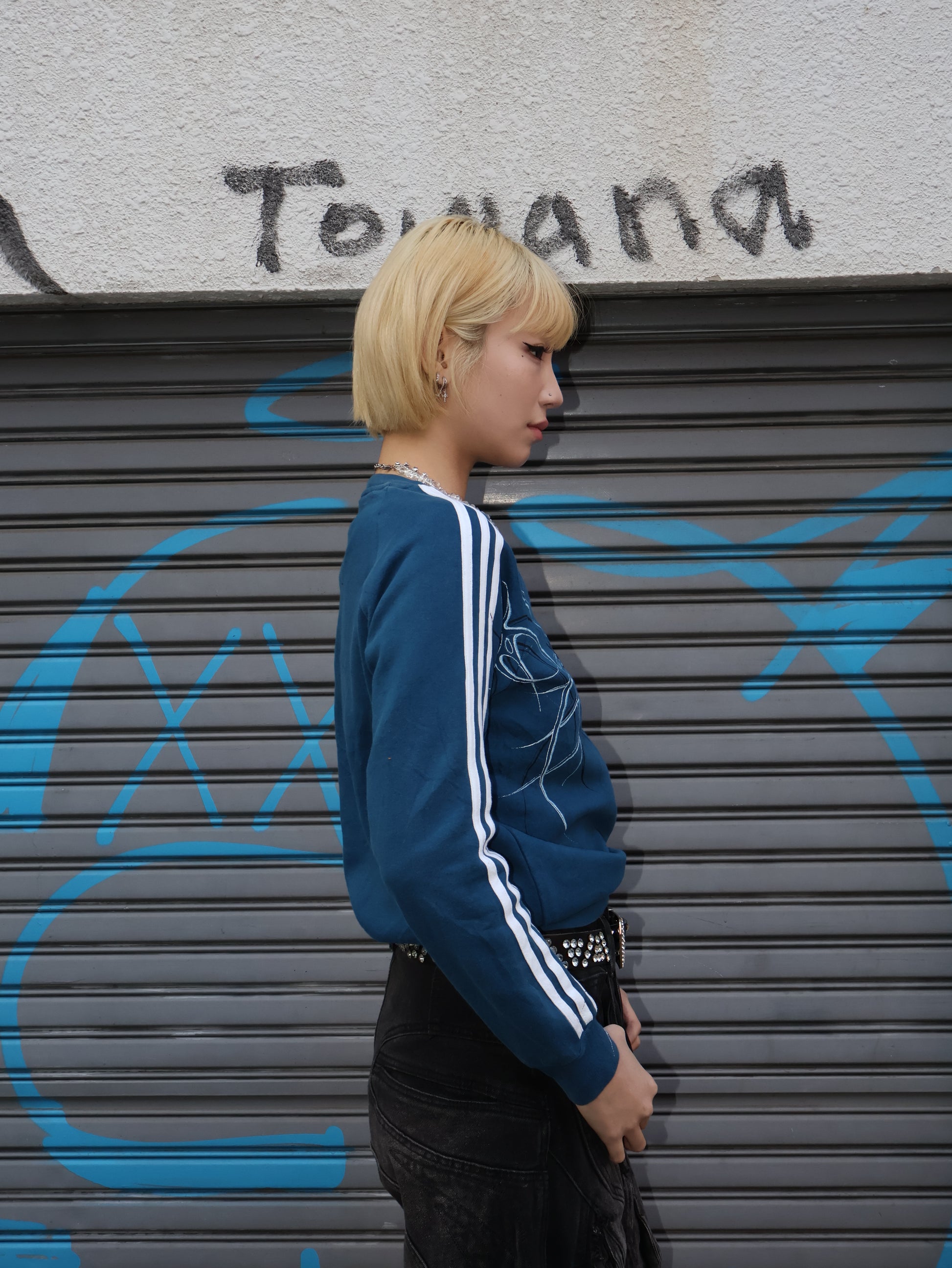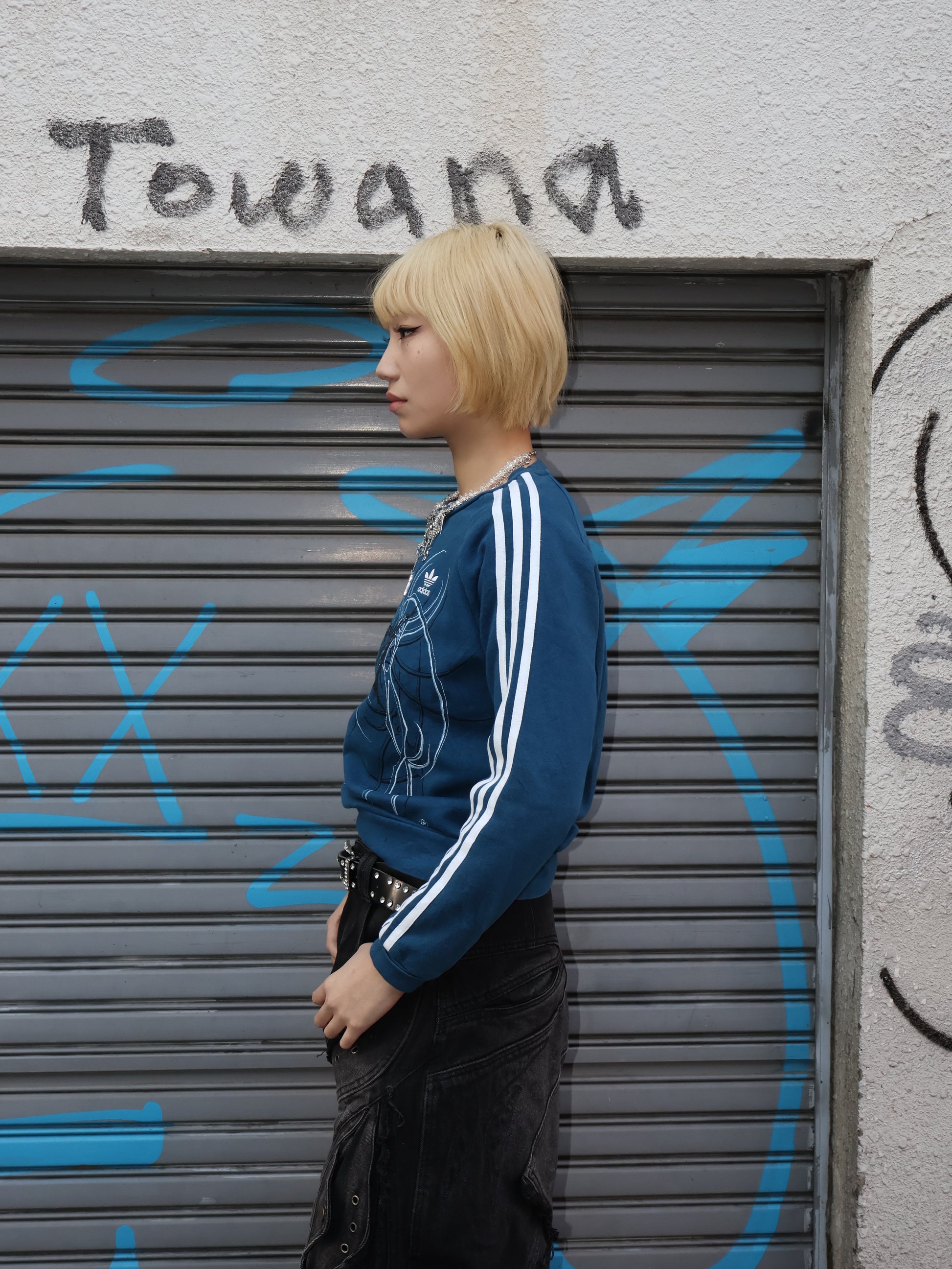 ヒップ上あたりの丈感で、トップスが主役になるバランス。Y2Kストリート寄りの雰囲気に。