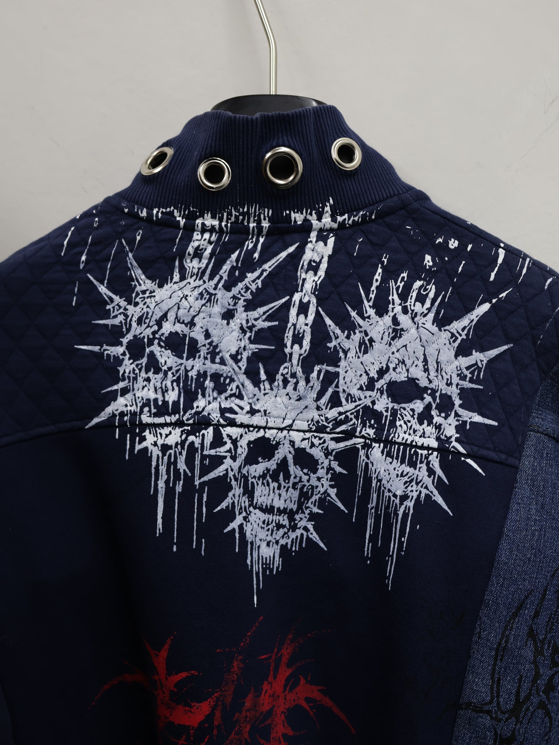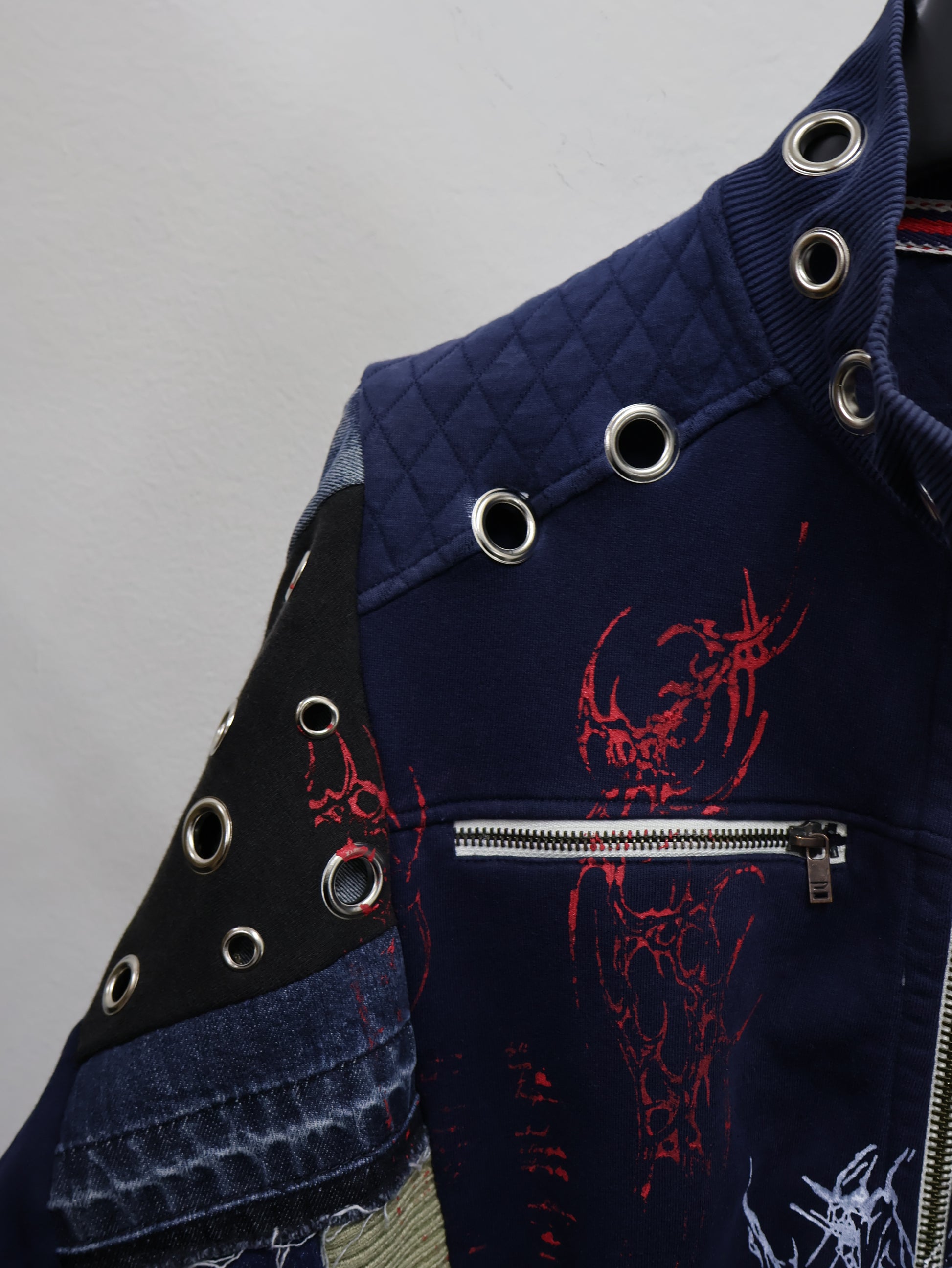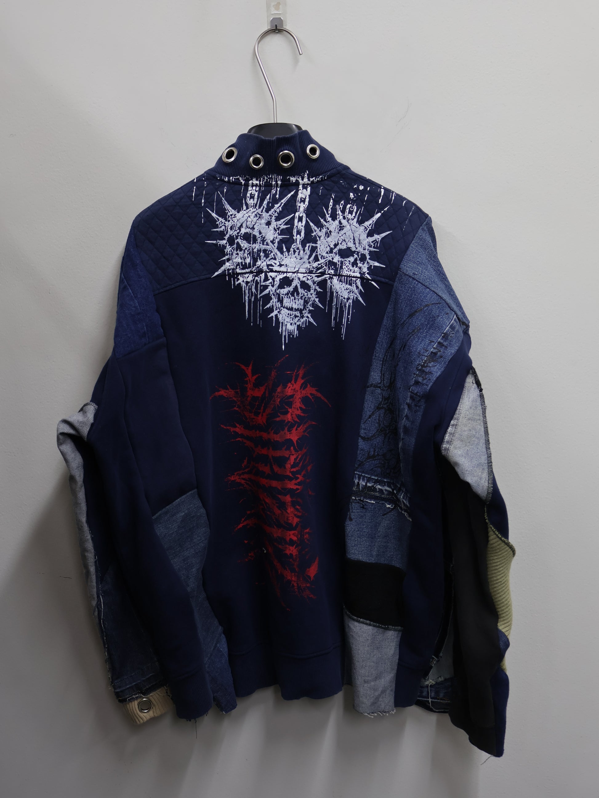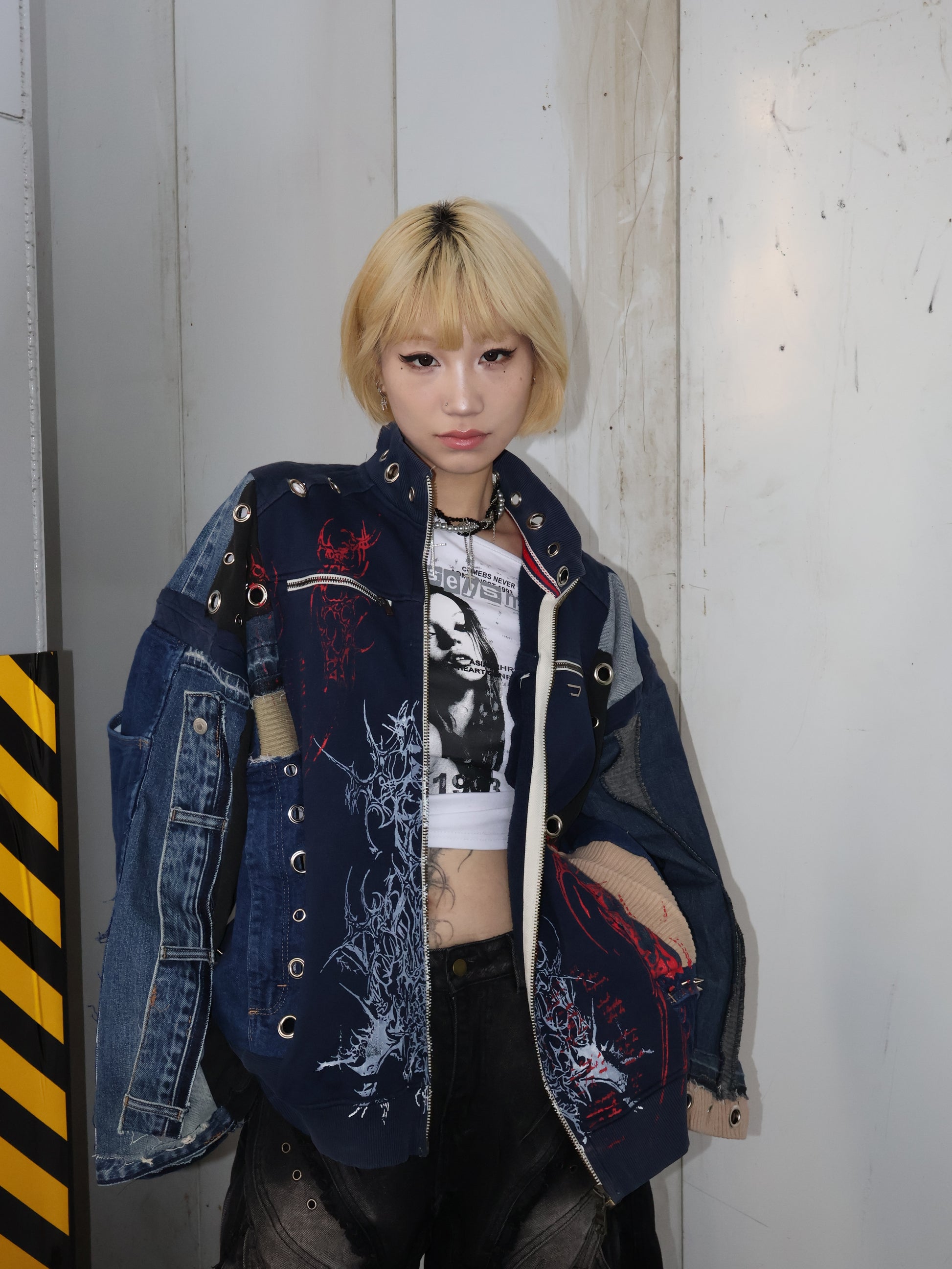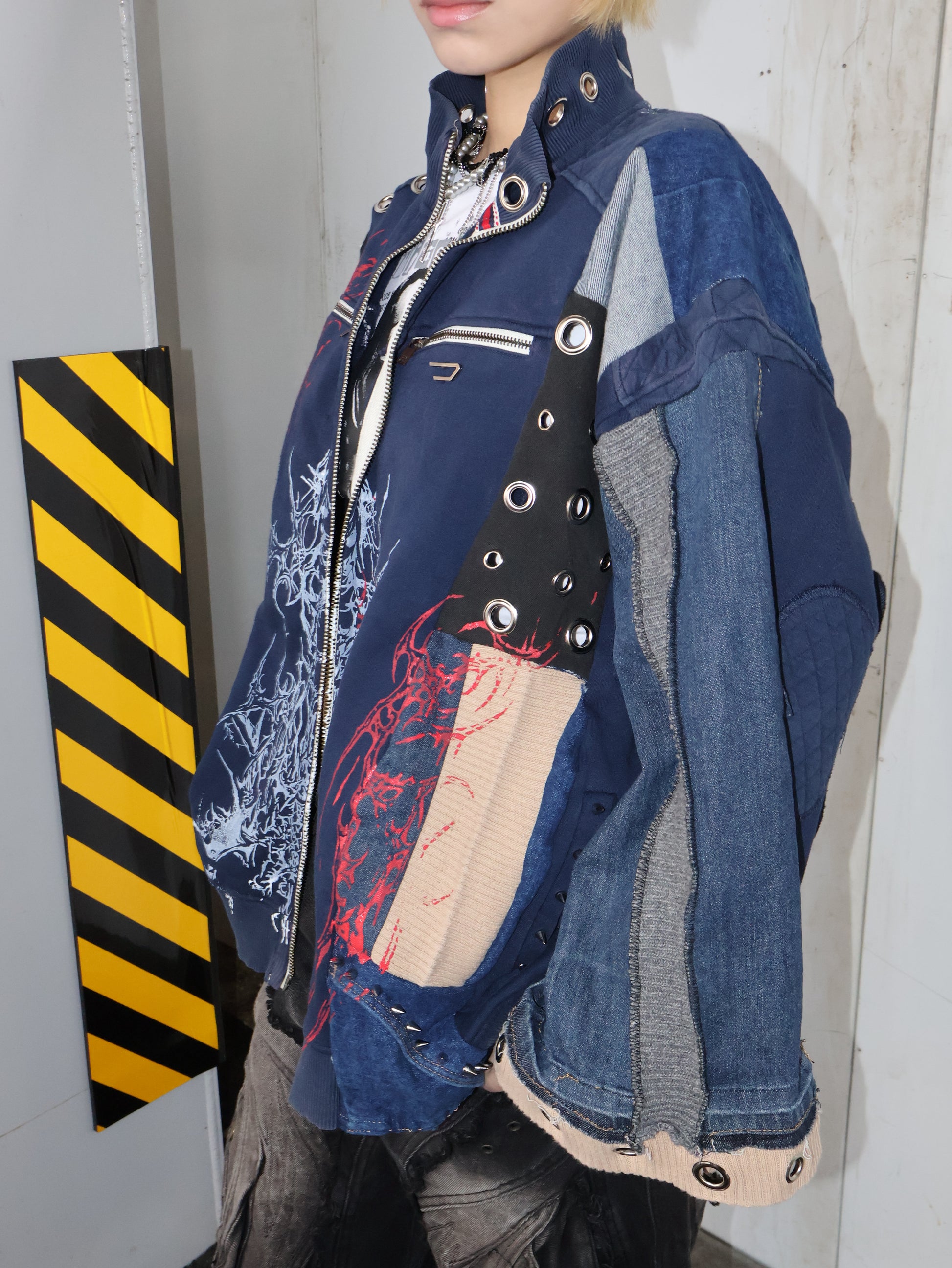 異素材デニムとスウェットを再構築し、グラフィックプリントとハトメディテールを重ねたリメイクブルゾン。