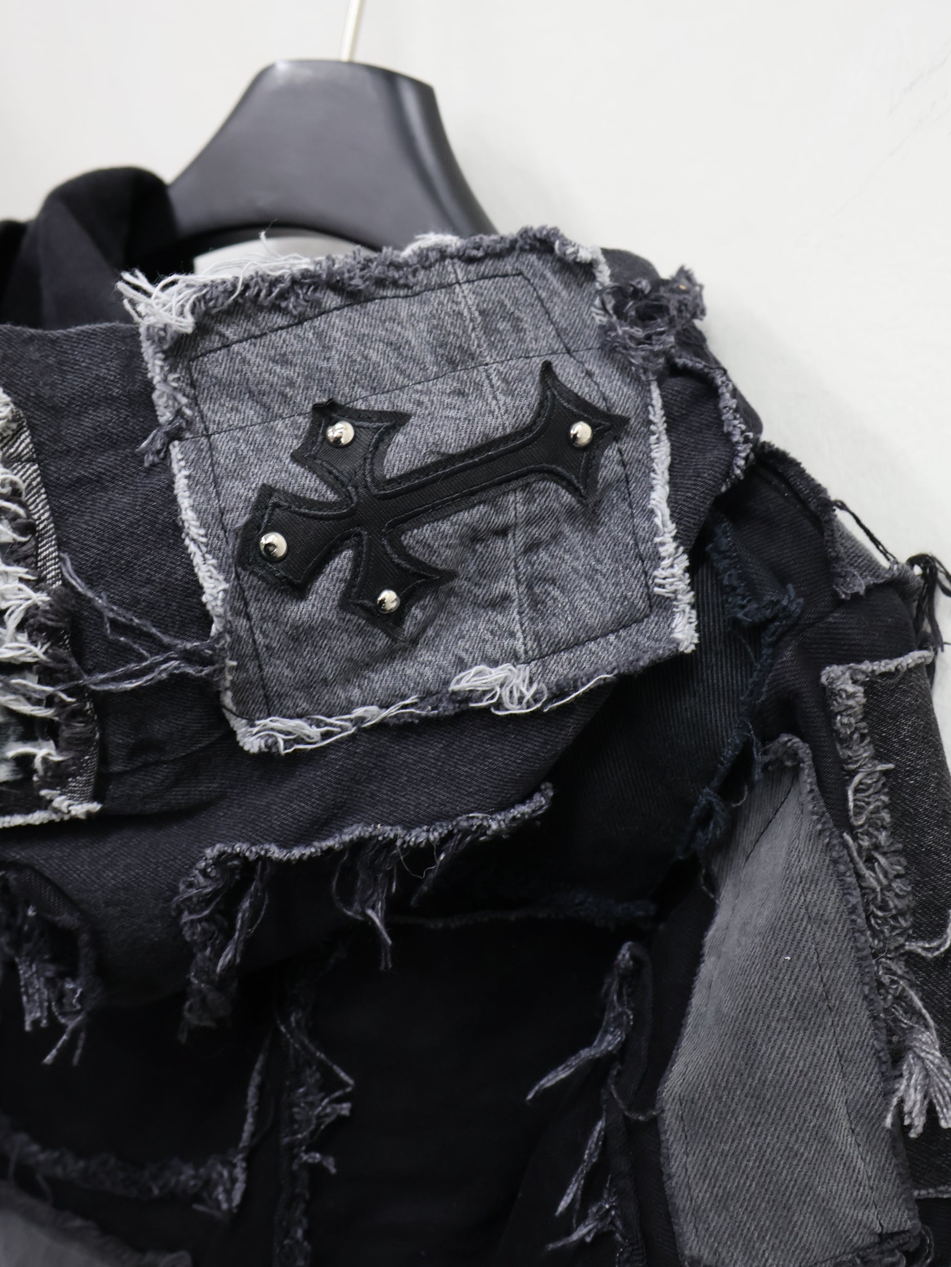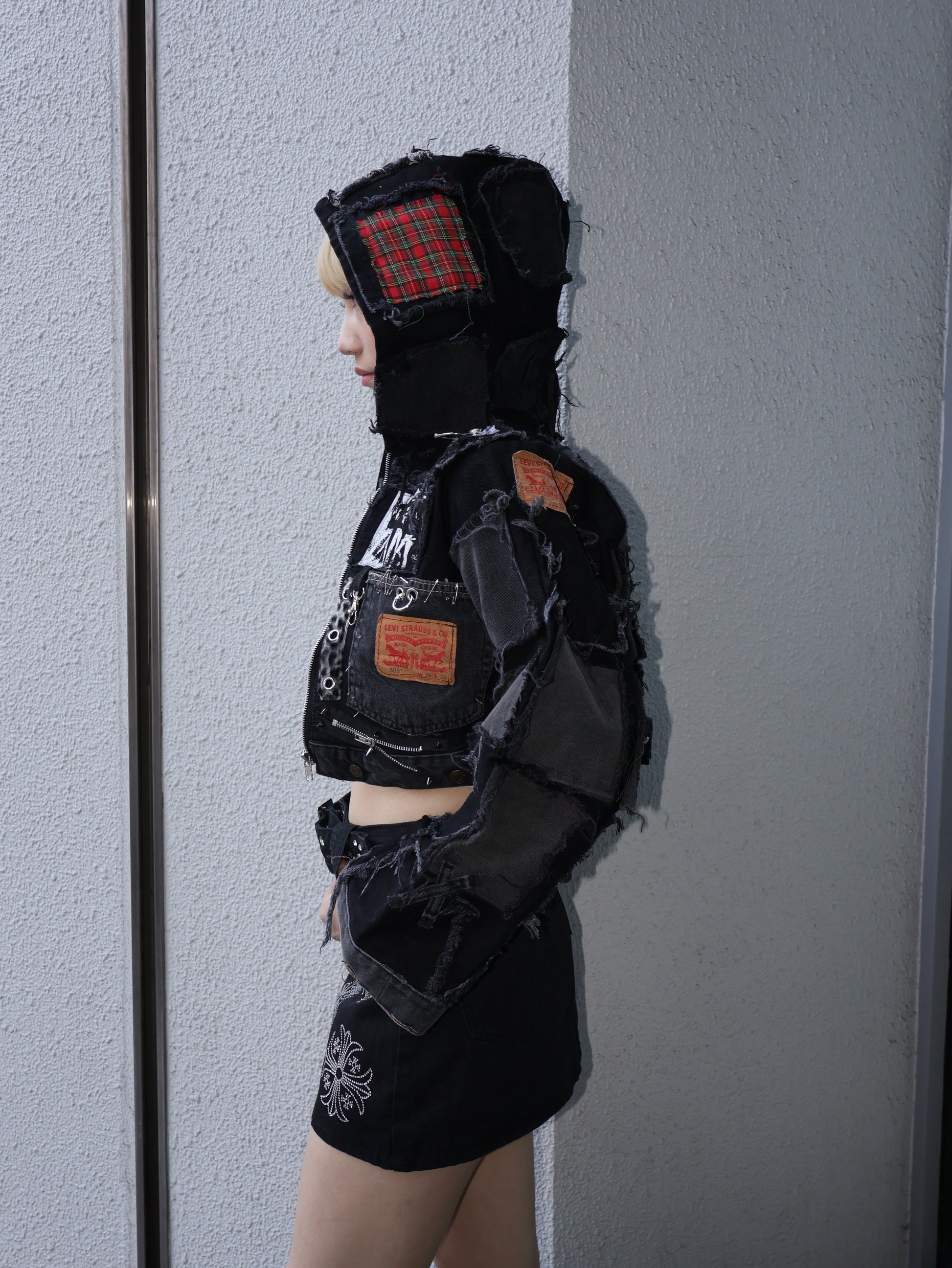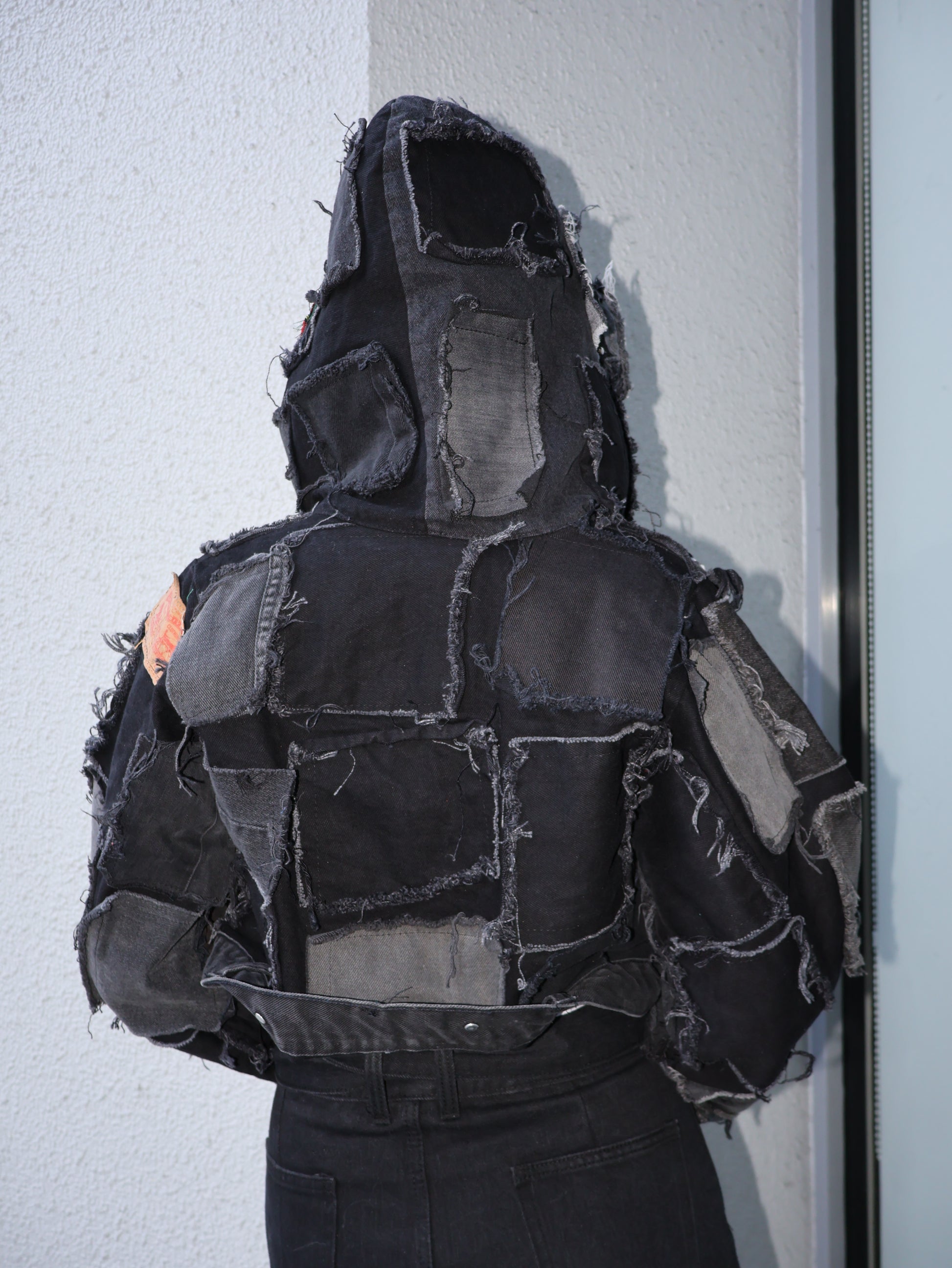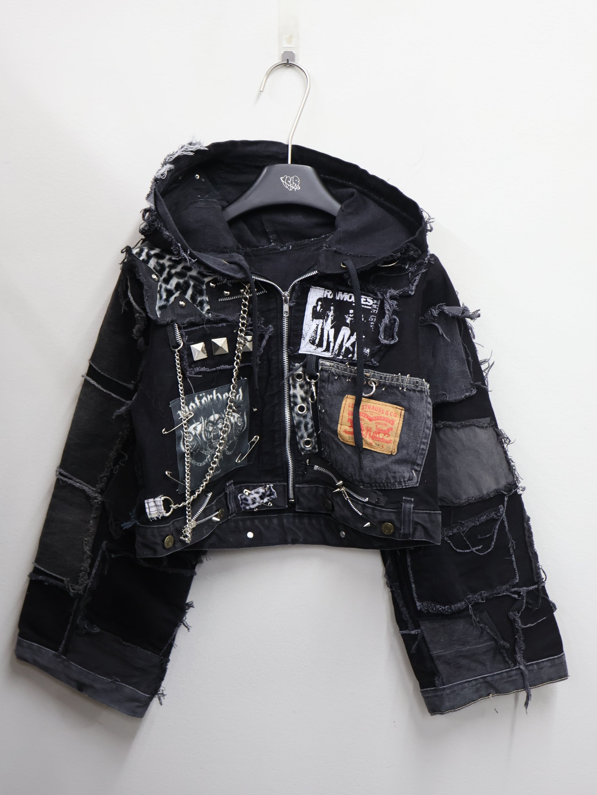 ブラックベースにリメイクディテールを重ねた、存在感抜群のショート丈フーディージャケット。