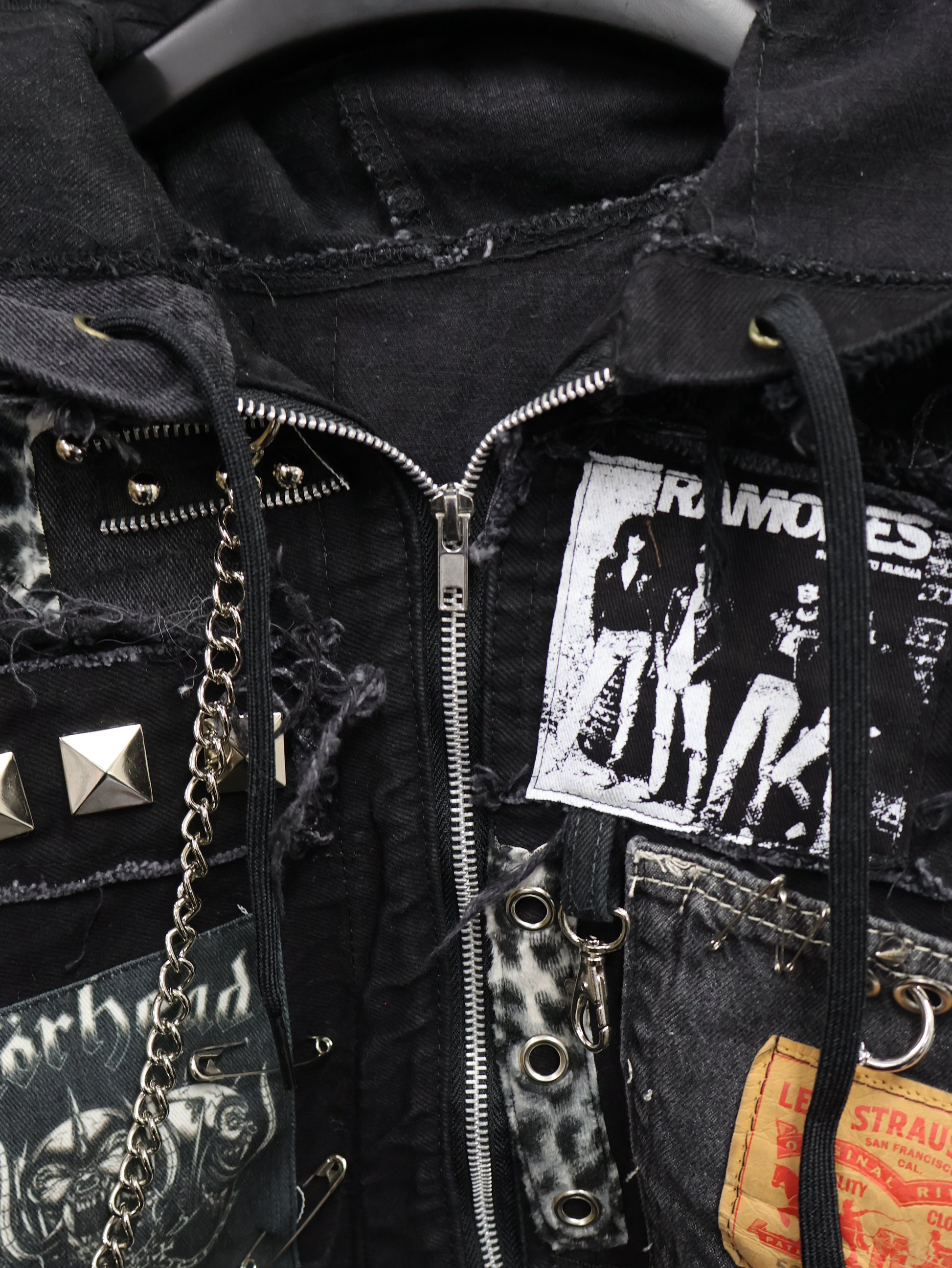 ダメージ加工、チェーン、ピン、パッチを効かせたデザインで、羽織るだけで即ストリート×海外ガール感が完成。