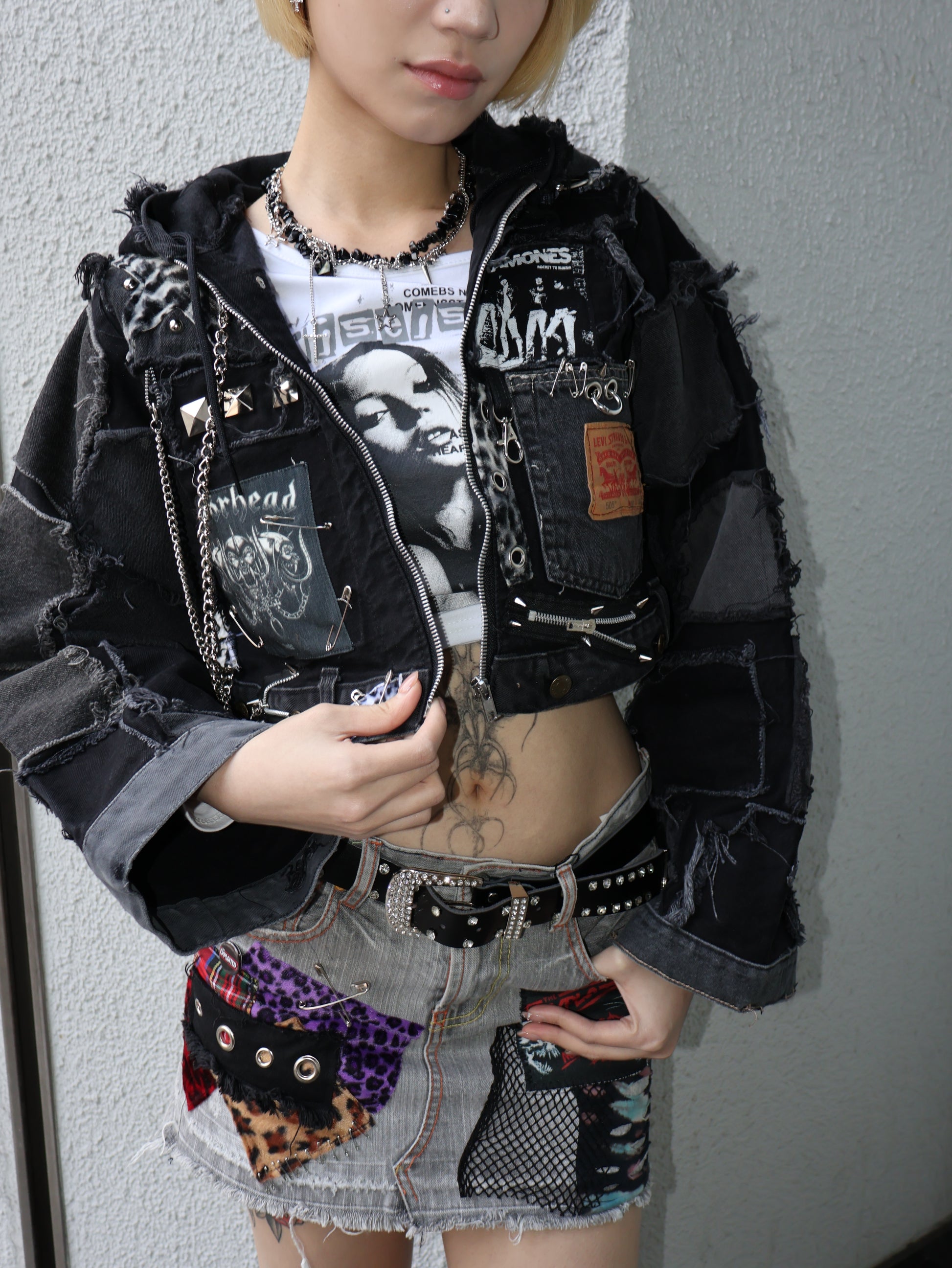 パッチワークや安全ピン、ハトメのディテールがY2K×ストリートのムードを強く引き出し、シンプルなトップスでも即コーデが決まります。
