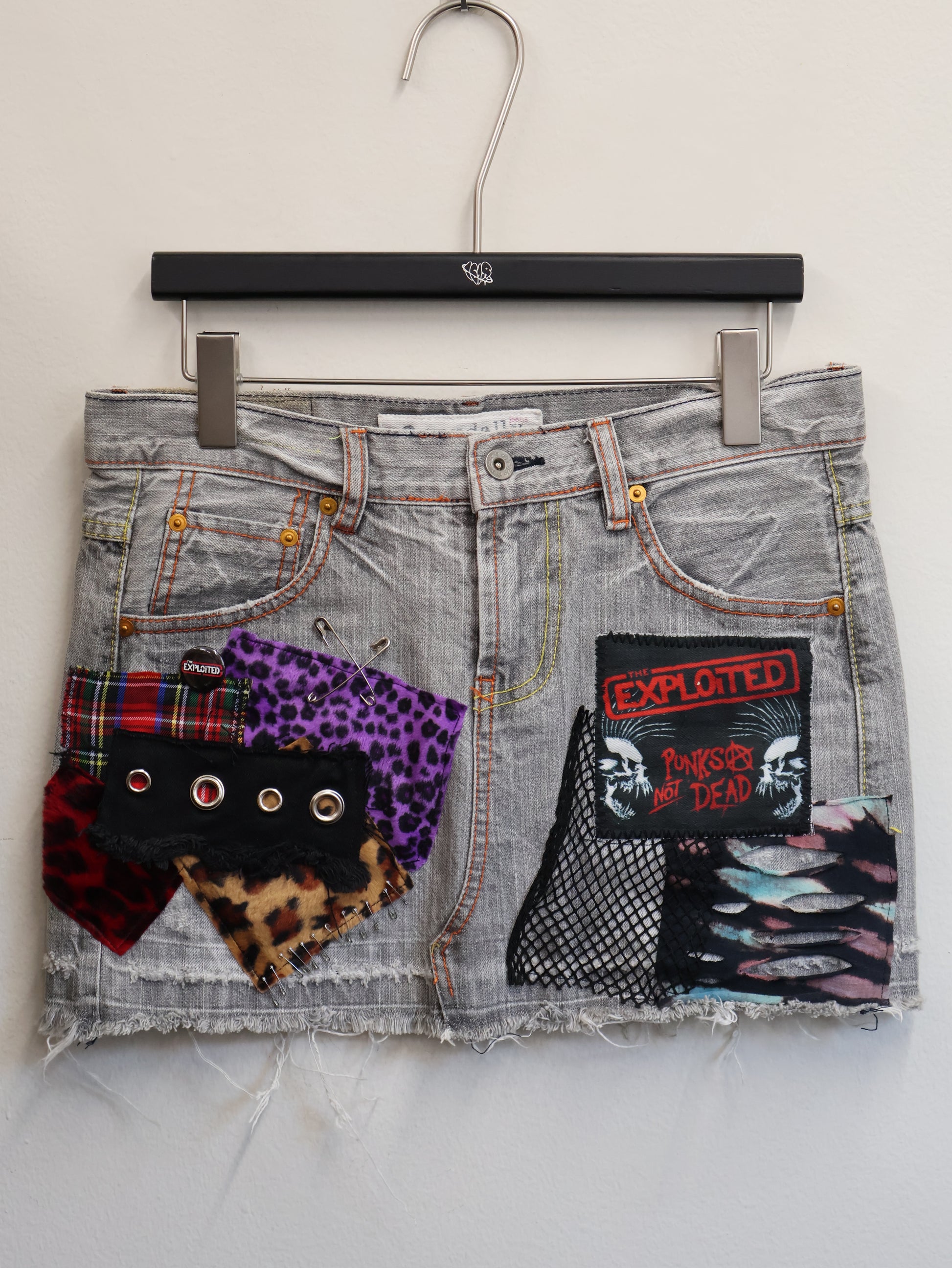 ヴィンテージライクなグレーデニムをベースに、レオパード・チェック・メッシュ・スタッズなど異素材を大胆に重ねたリメイクデニムミニ。
