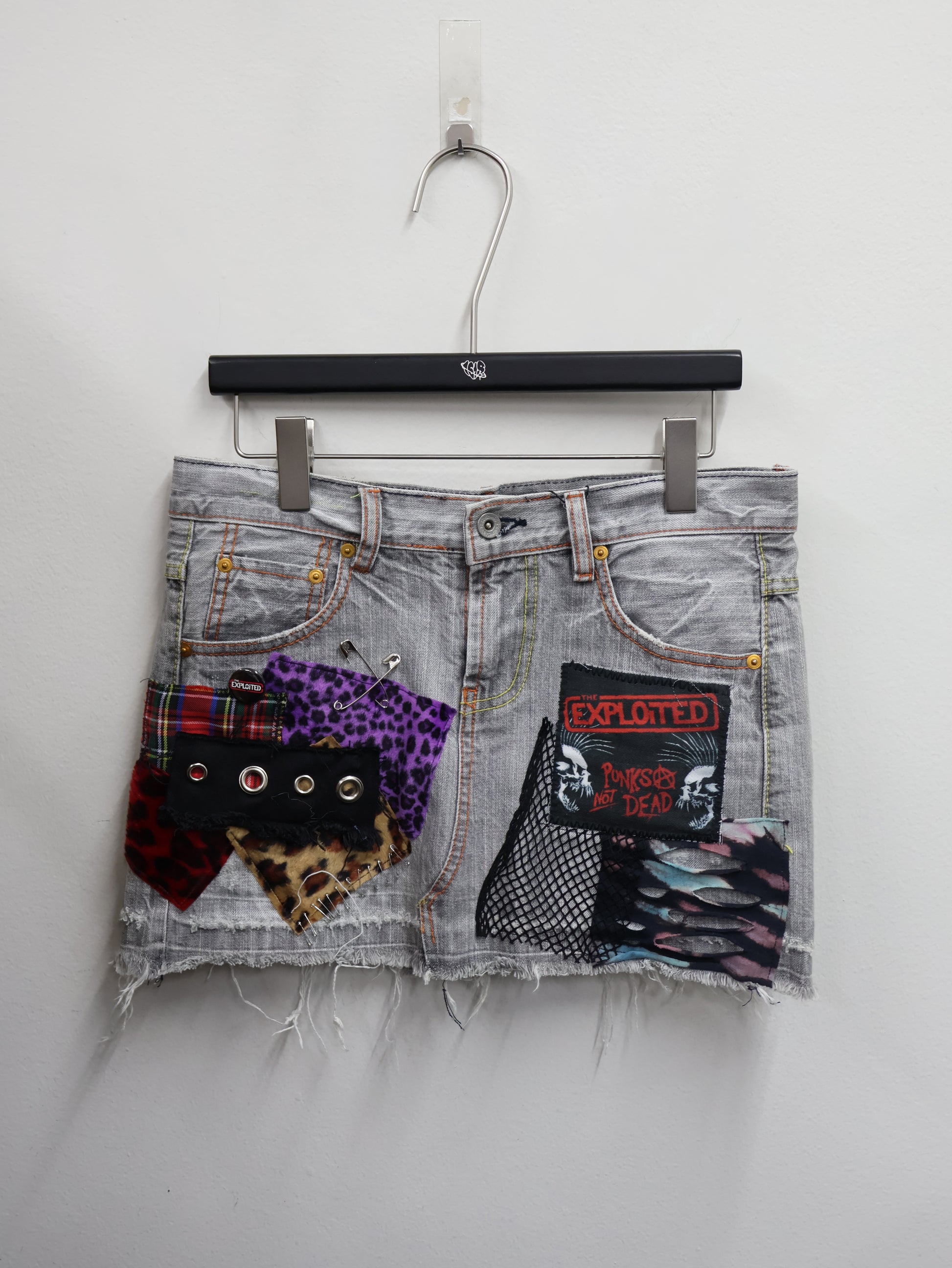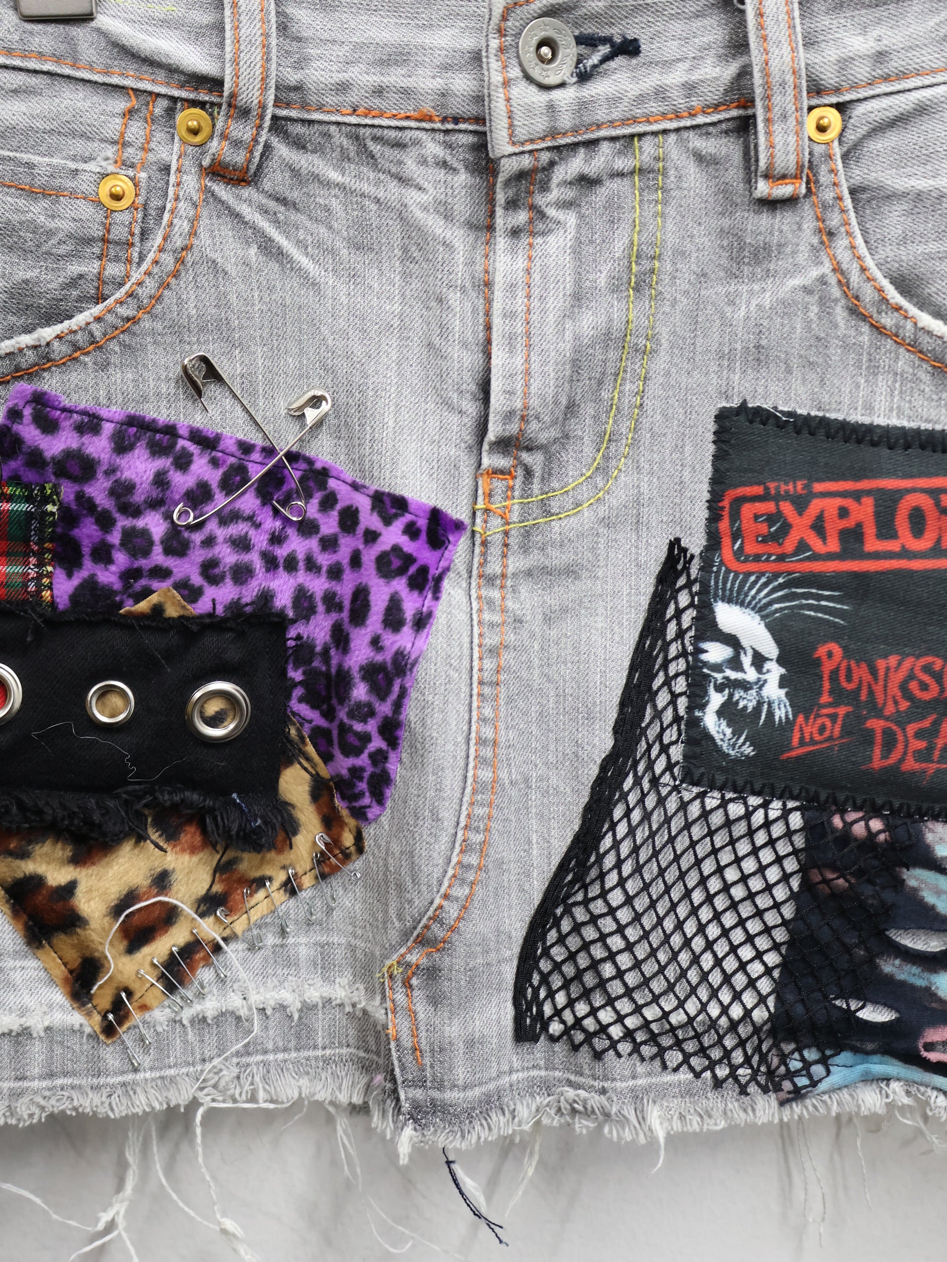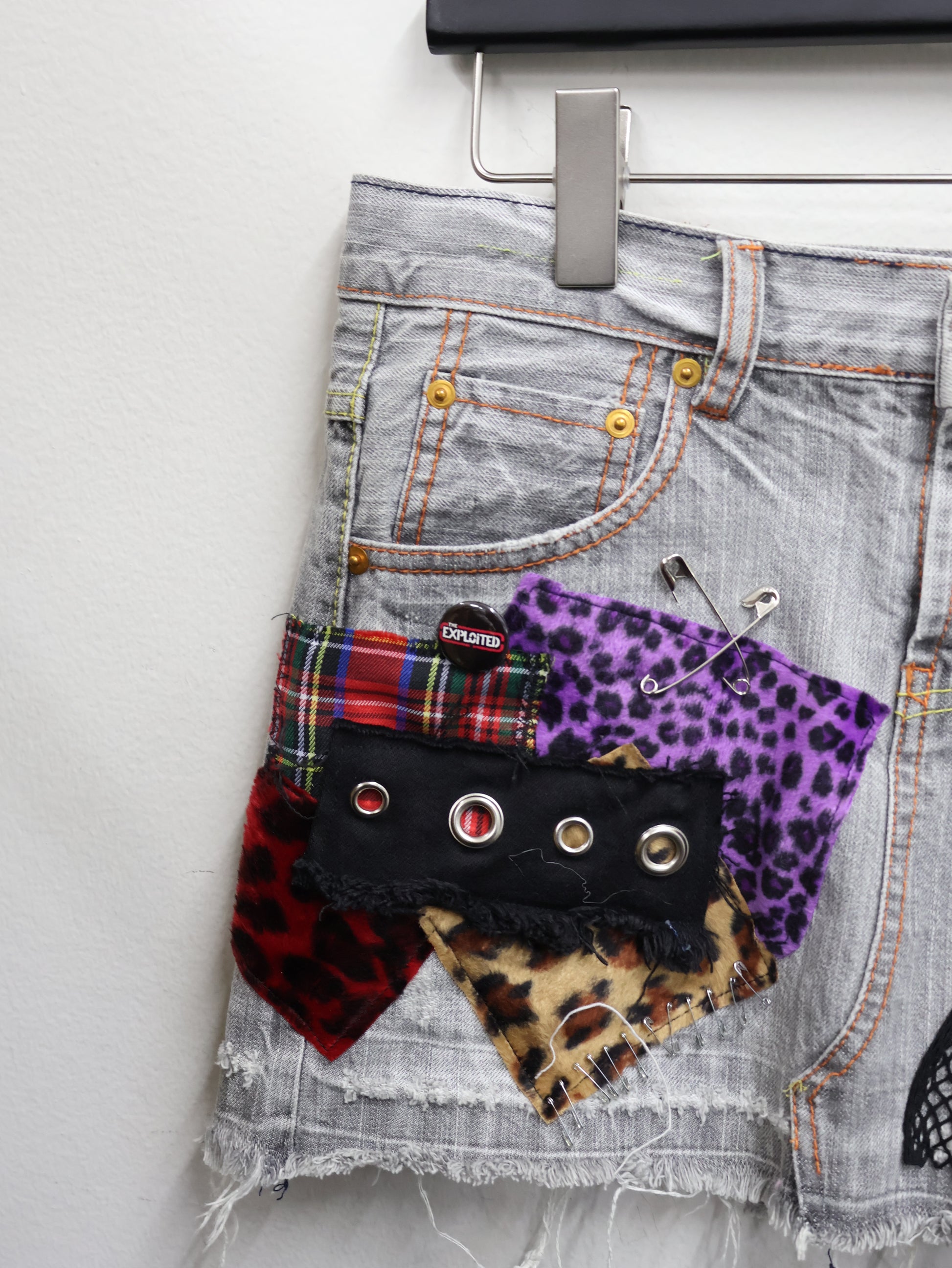 ヴィンテージライクなグレーデニムをベースに、レオパード・チェック・メッシュ・スタッズを重ねたリメイクデニムミニ。