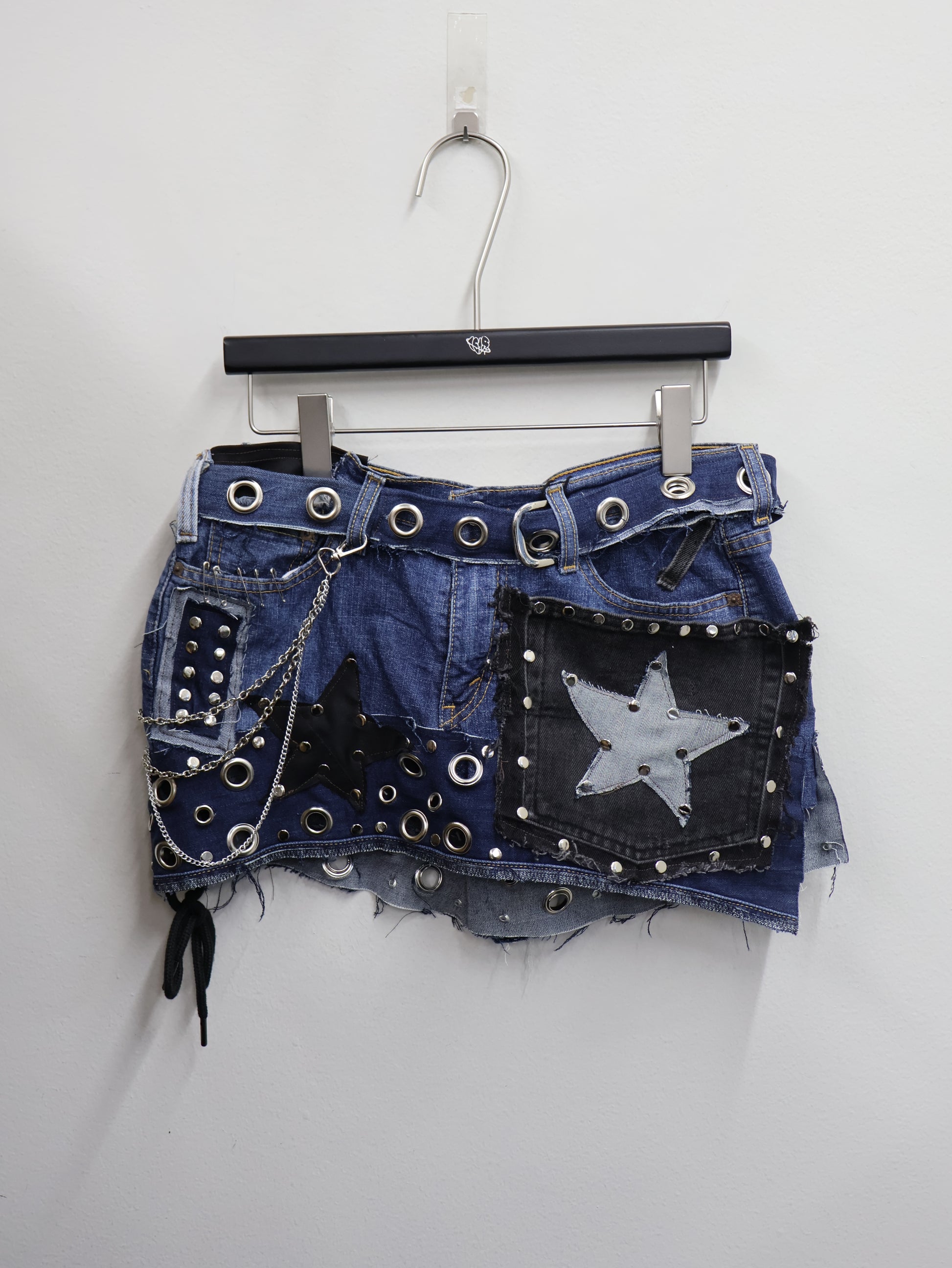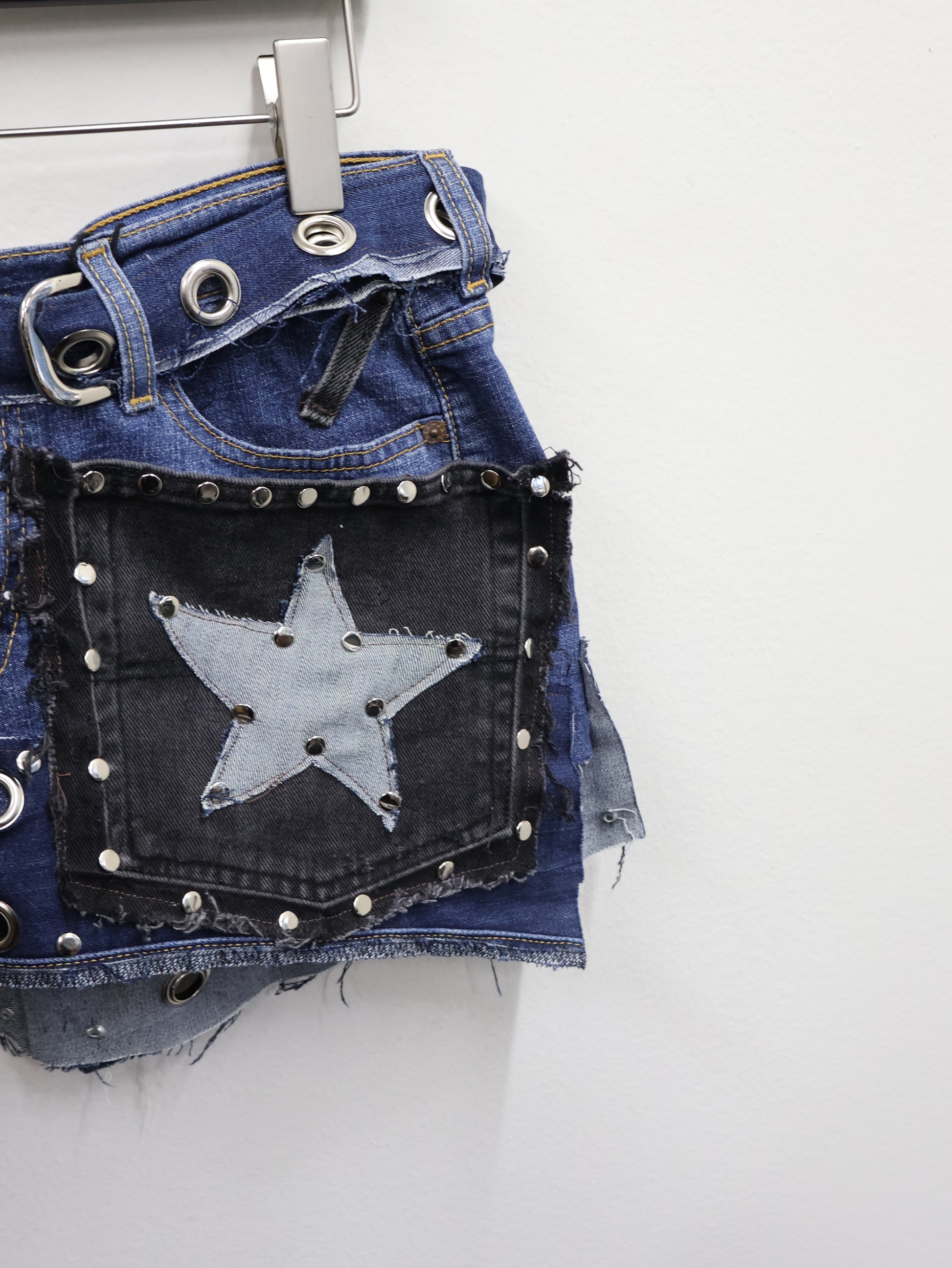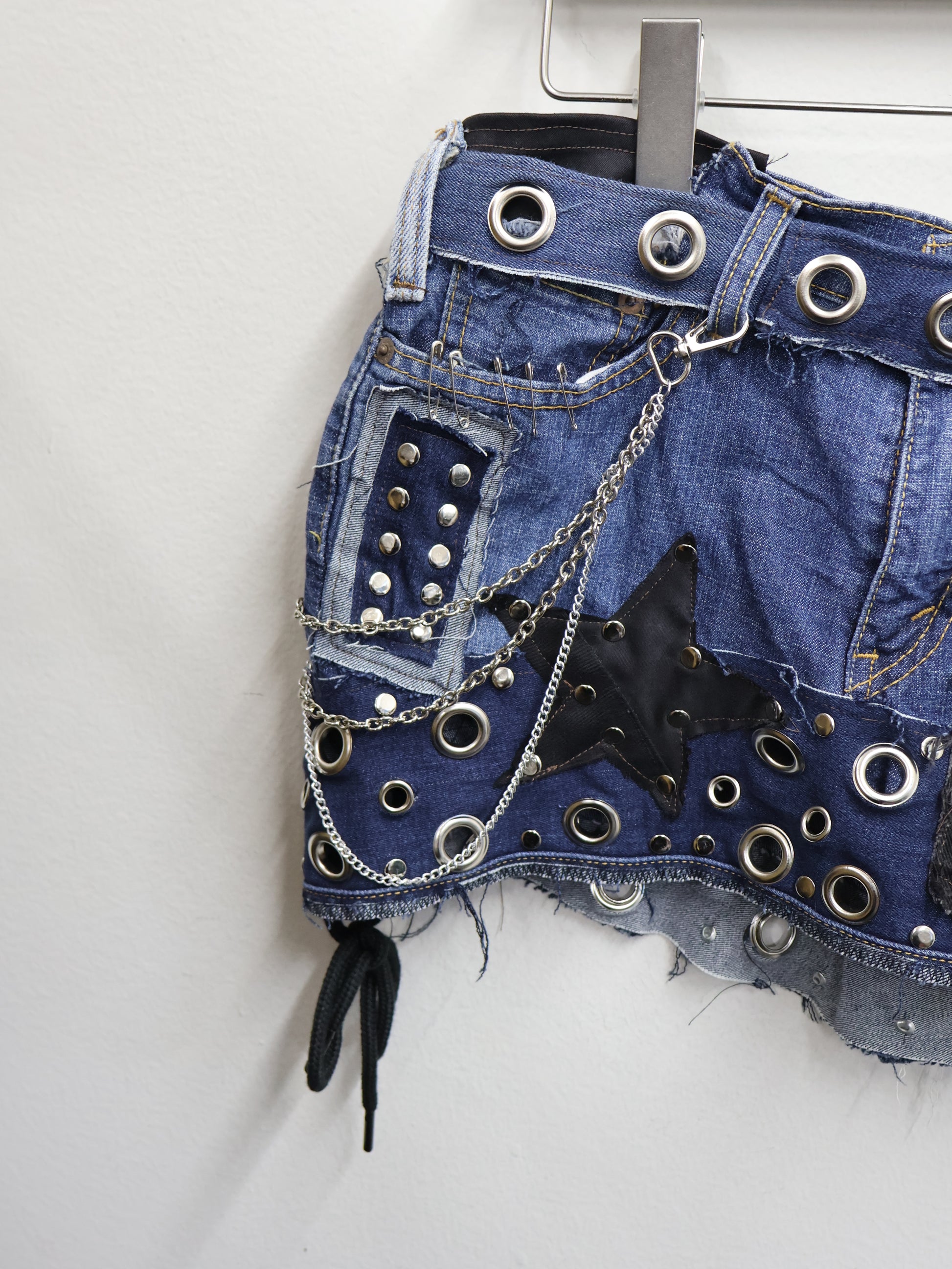 ヴィンテージデニムをベースに、スタッズ・ハトメ・チェーン・スター型パッチを大胆に配置したリメイクデニムミニ。