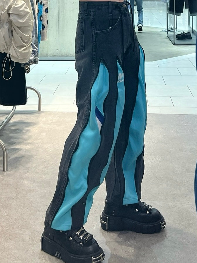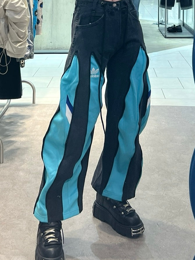 古着のデニムとジャージでリメイクされた1点もののパンツ。