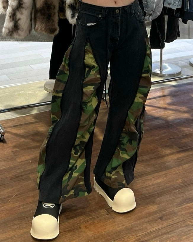 古着のデニムとジャージでリメイクされた1点もののパンツ。