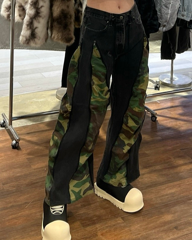 古着のデニムとジャージでリメイクされた1点もののパンツ。