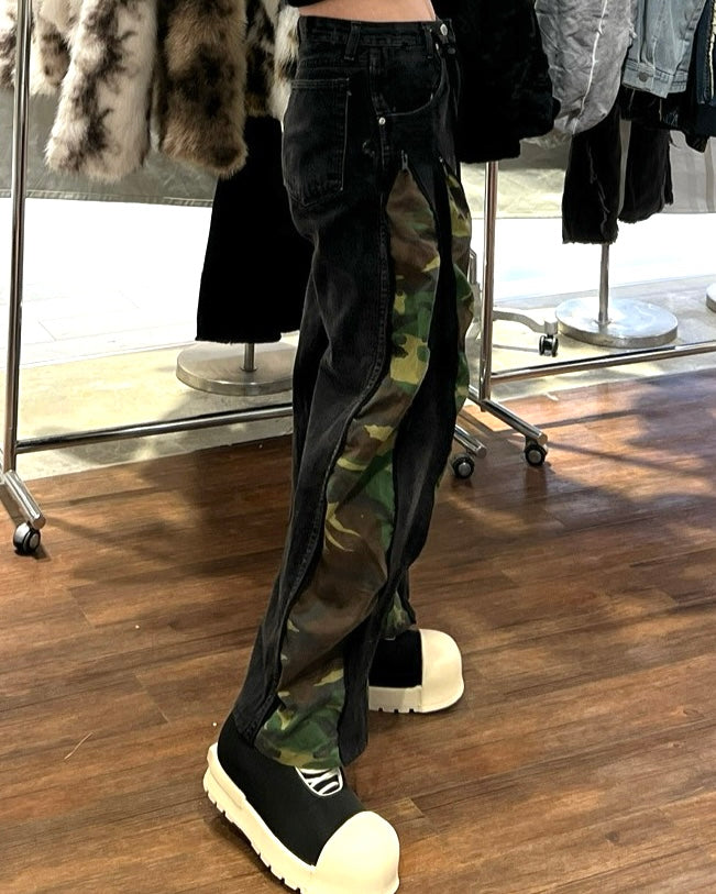 古着のデニムとジャージでリメイクされた1点もののパンツ。