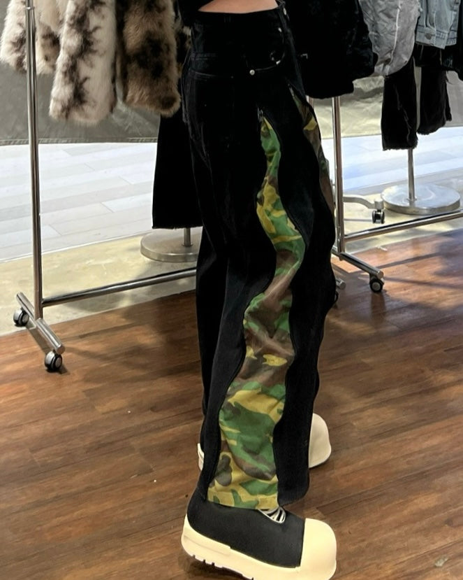 古着のデニムとジャージでリメイクされた1点もののパンツ。