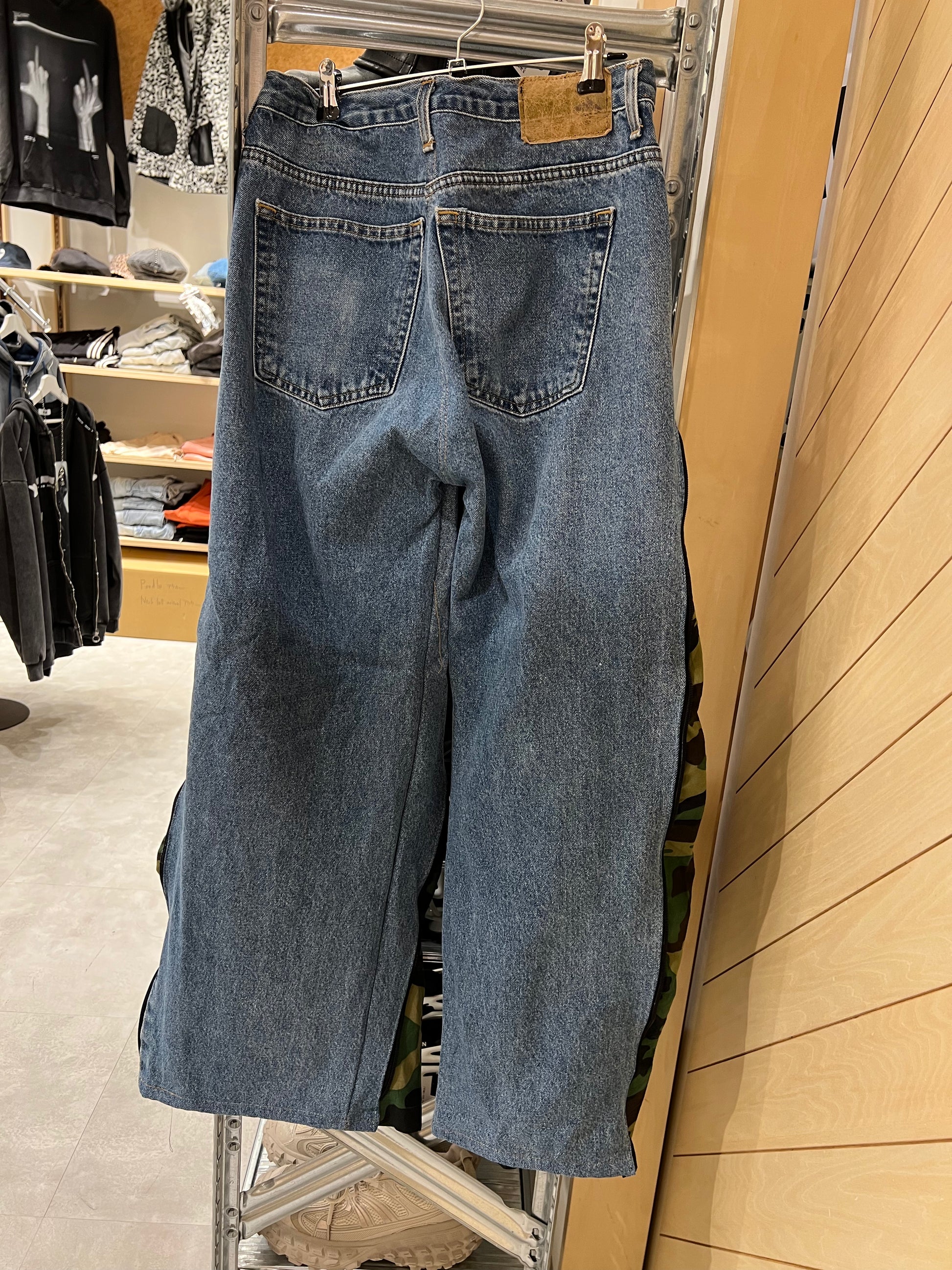 古着のデニムとジャージでリメイクされた1点もののパンツ。