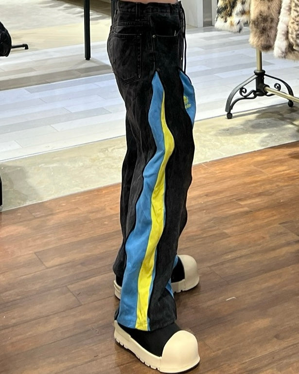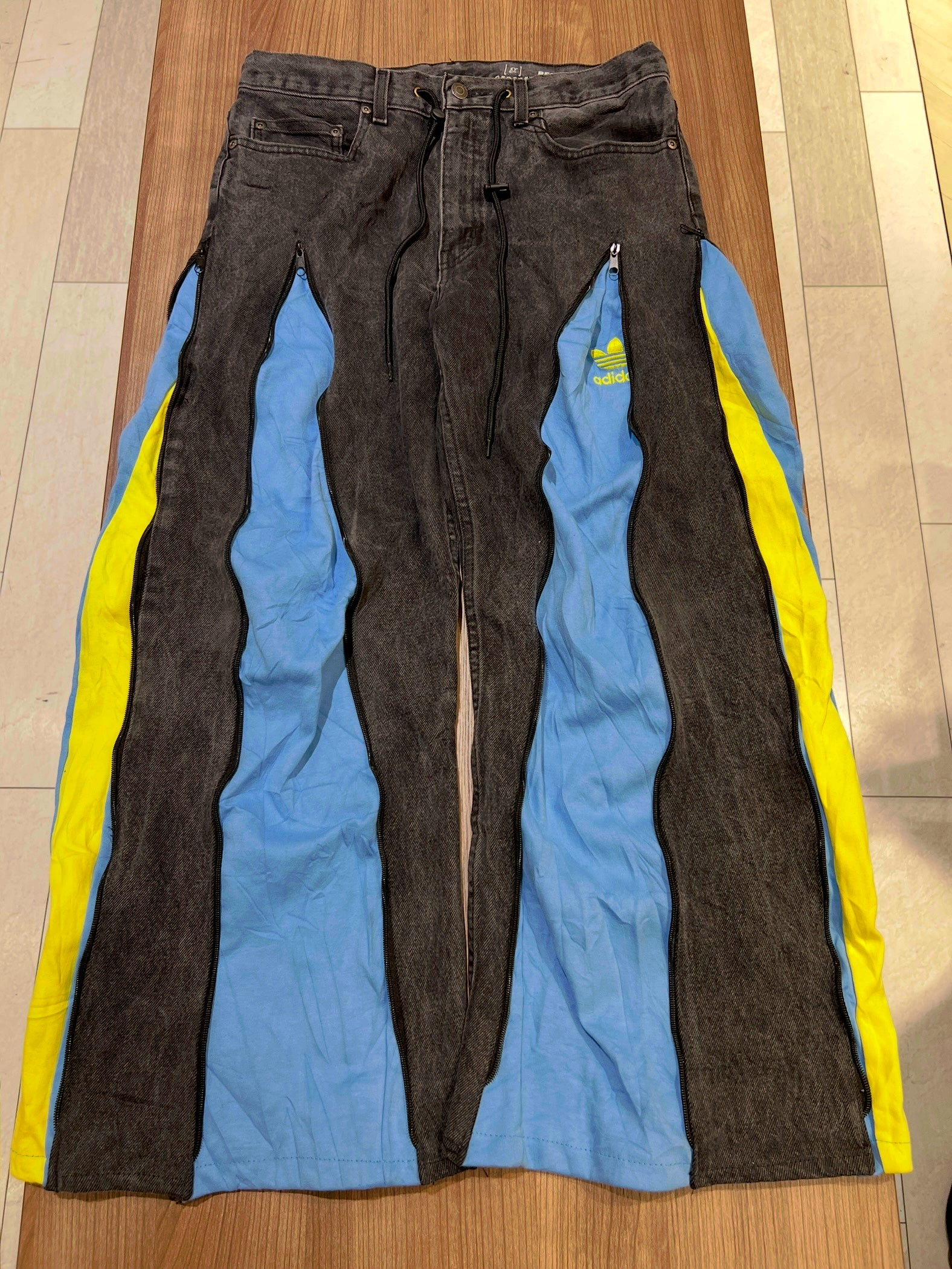 古着のデニムとジャージでリメイクされた1点もののパンツ。