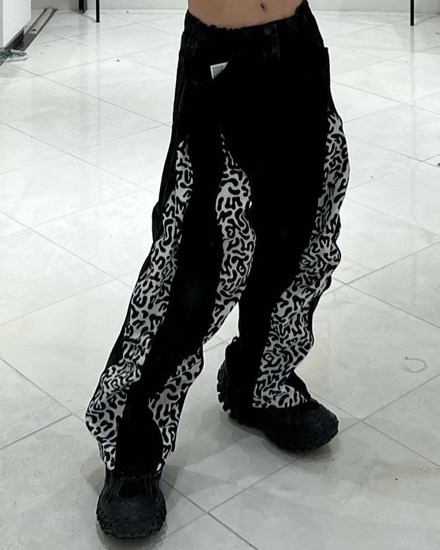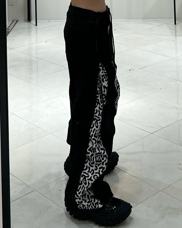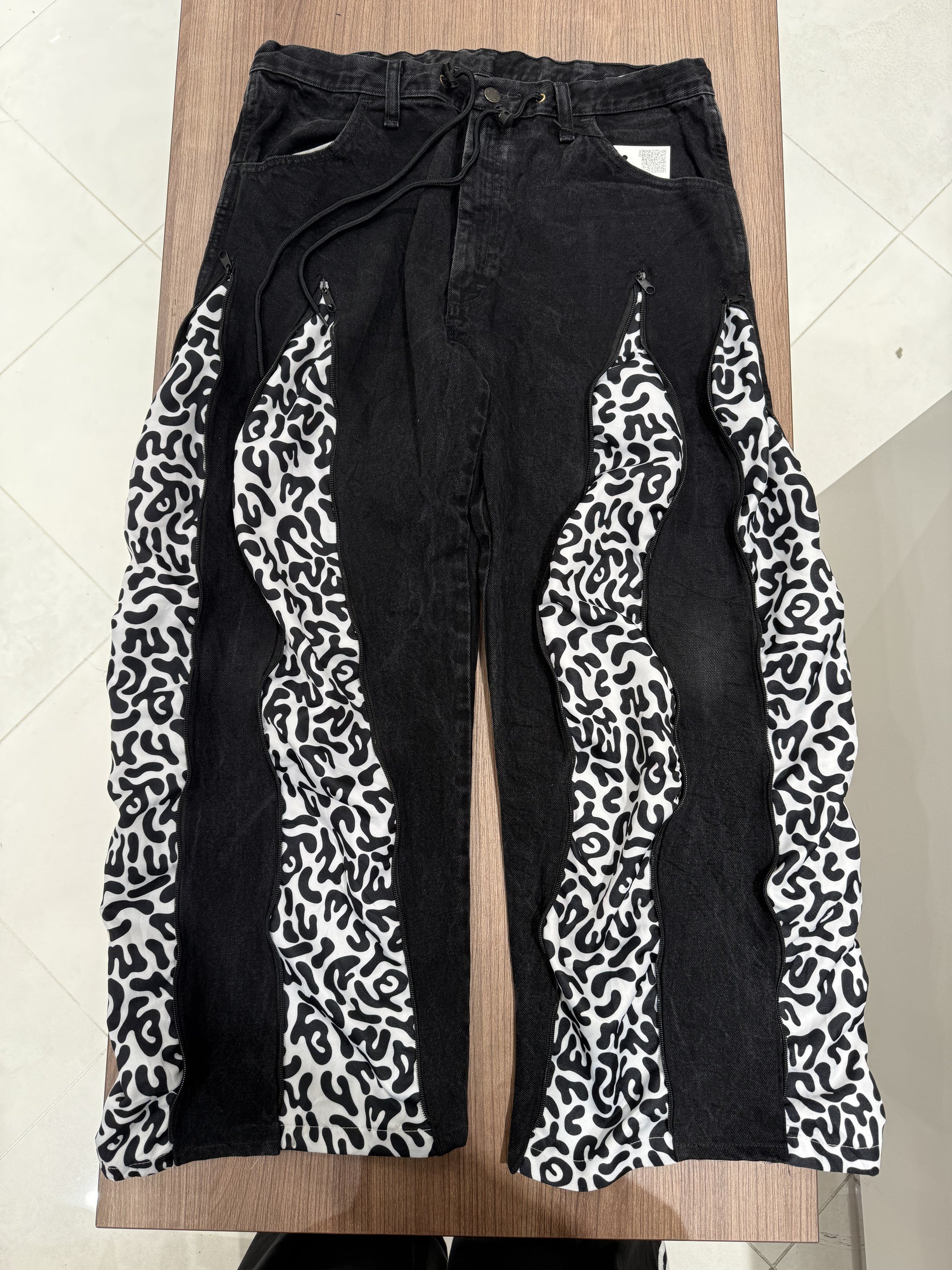 古着のデニムとジャージでリメイクされた1点もののパンツ。