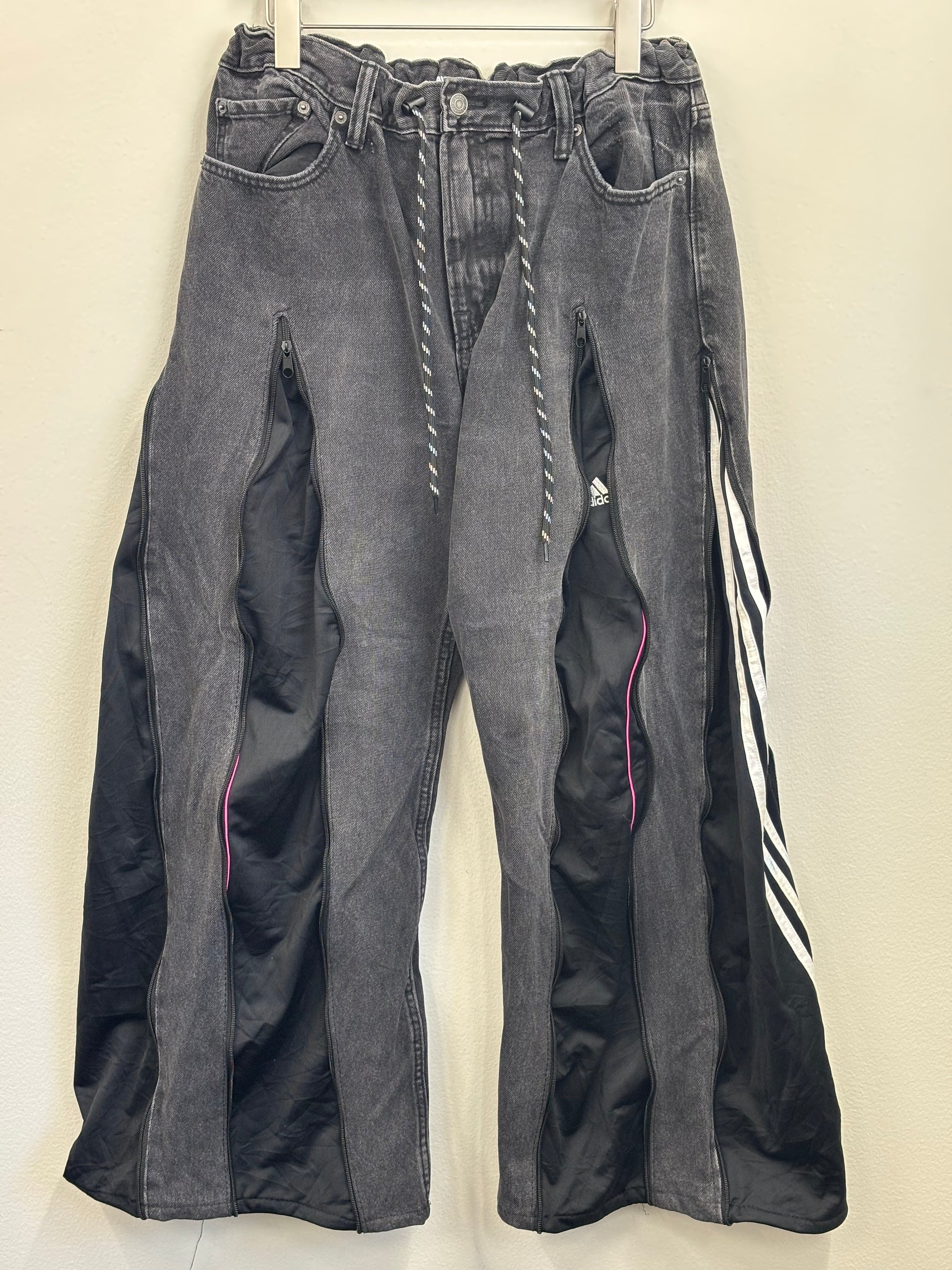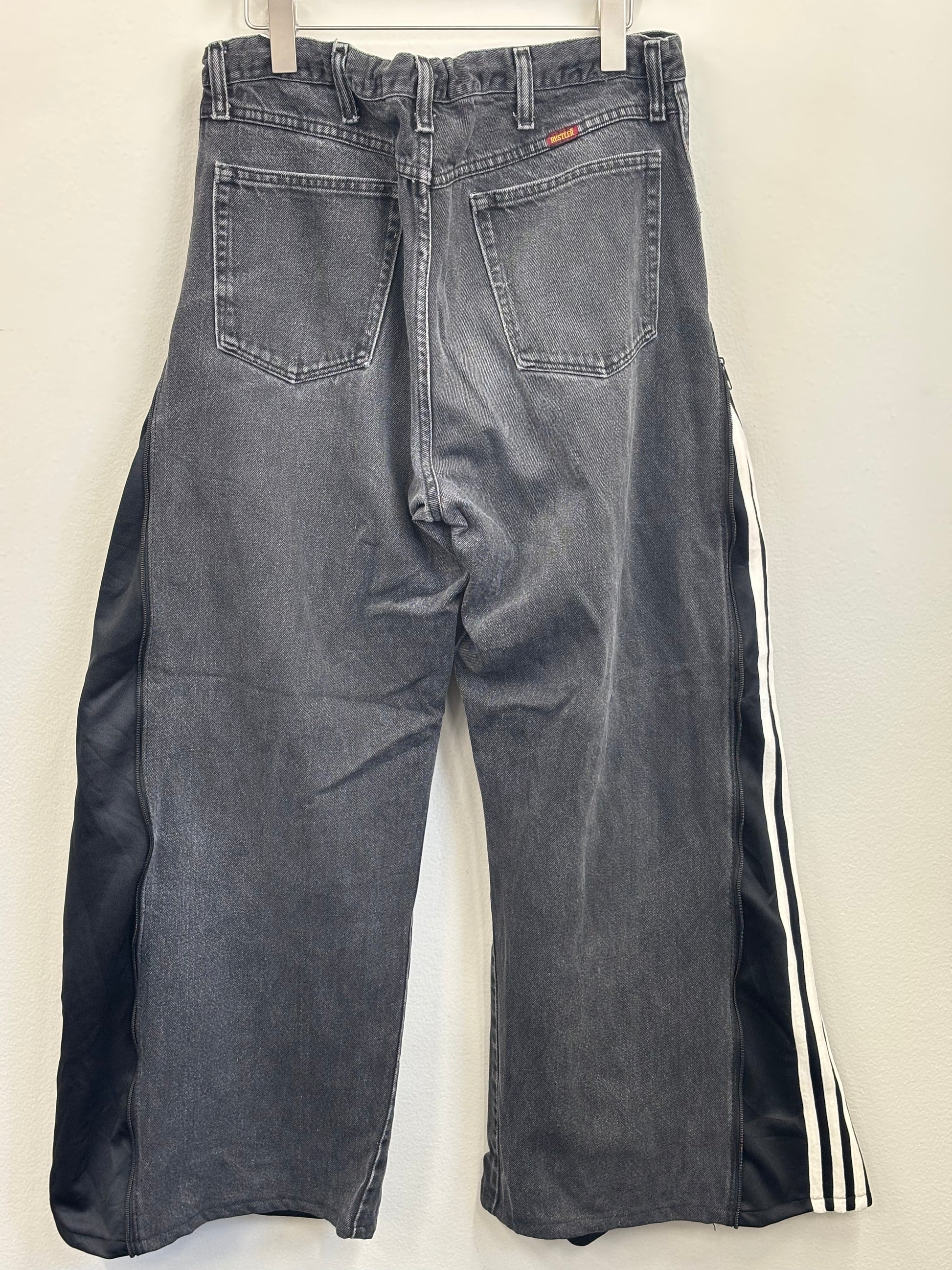 古着のデニムとジャージでリメイクされた1点もののパンツ。