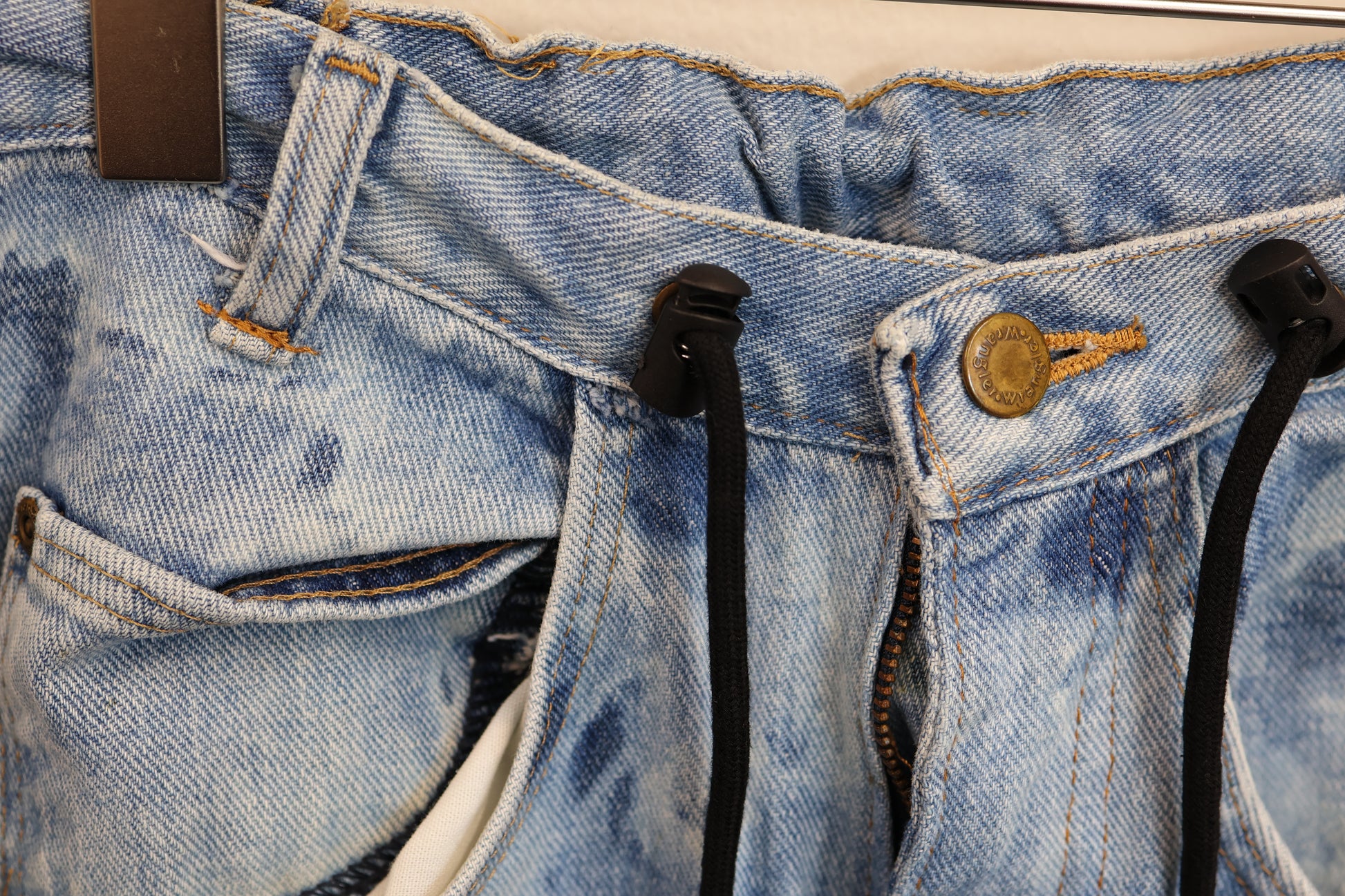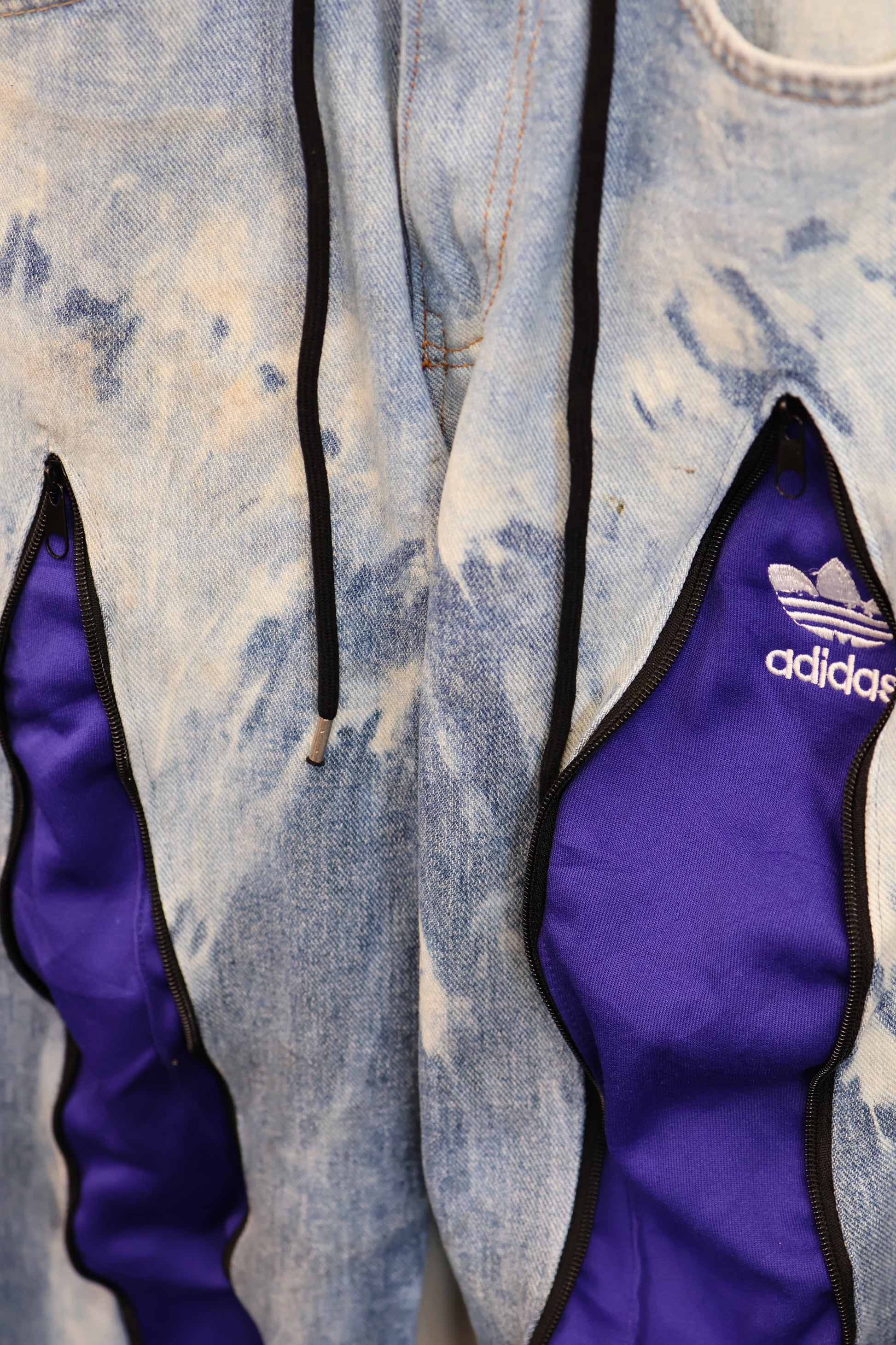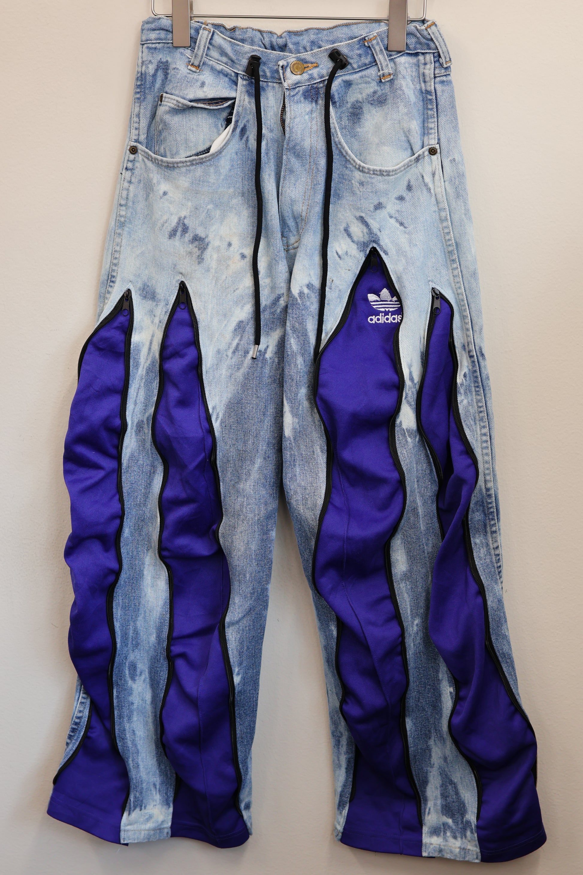 古着のデニムとジャージでリメイクされた1点もののパンツ。