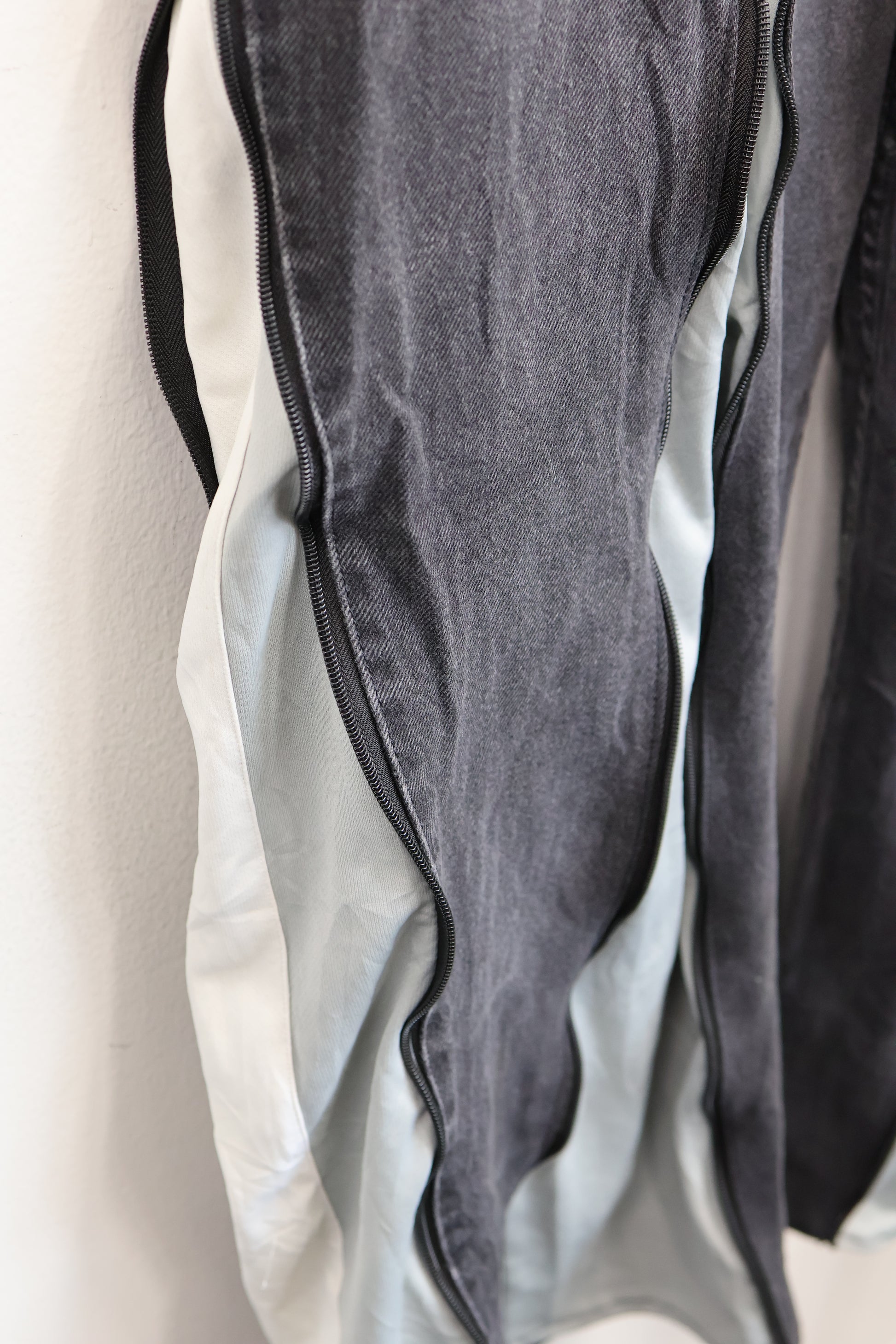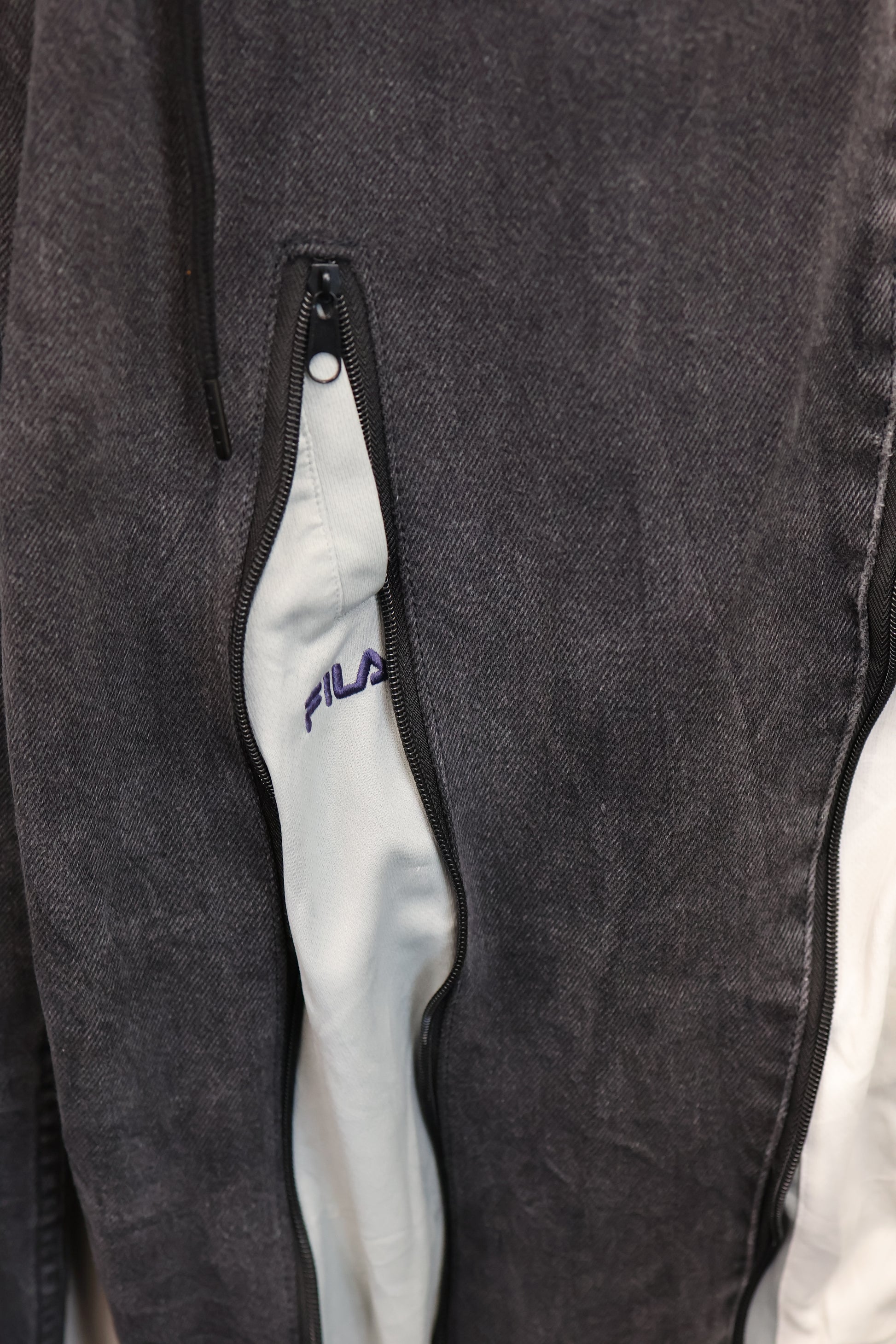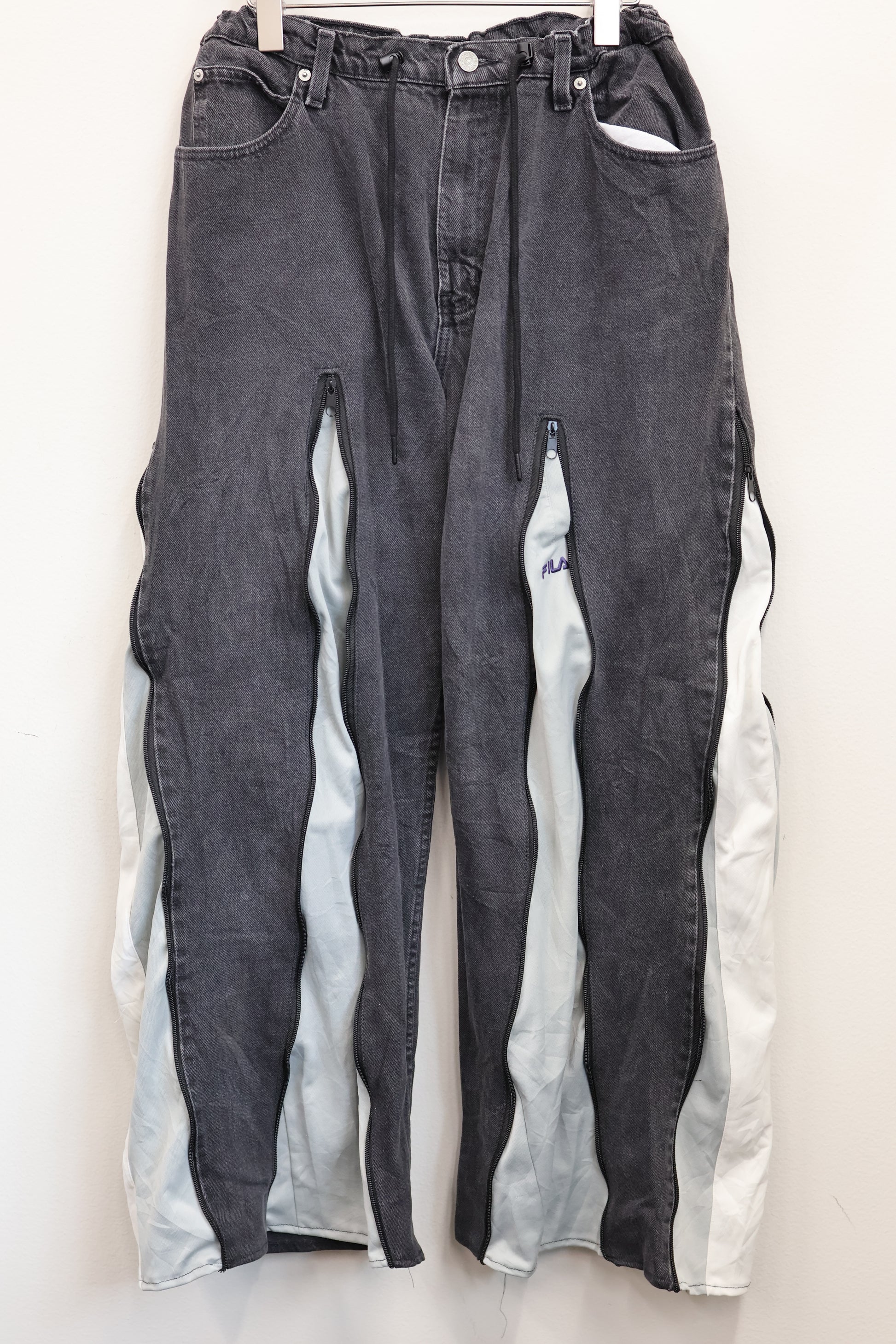 古着のデニムとジャージでリメイクされた1点もののパンツ。