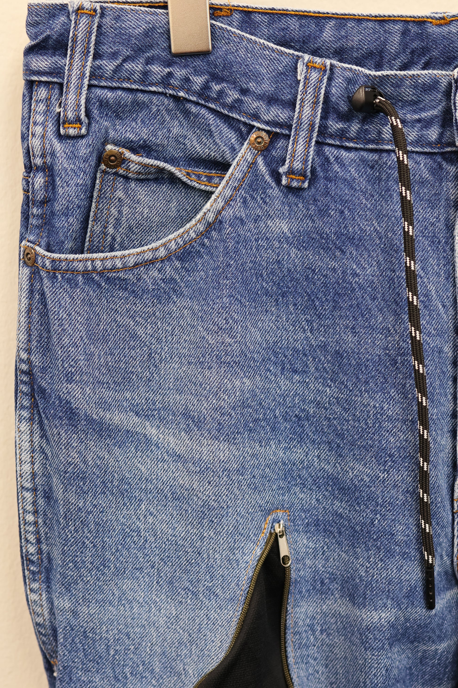 古着のデニムとジャージでリメイクされた1点もののパンツ。