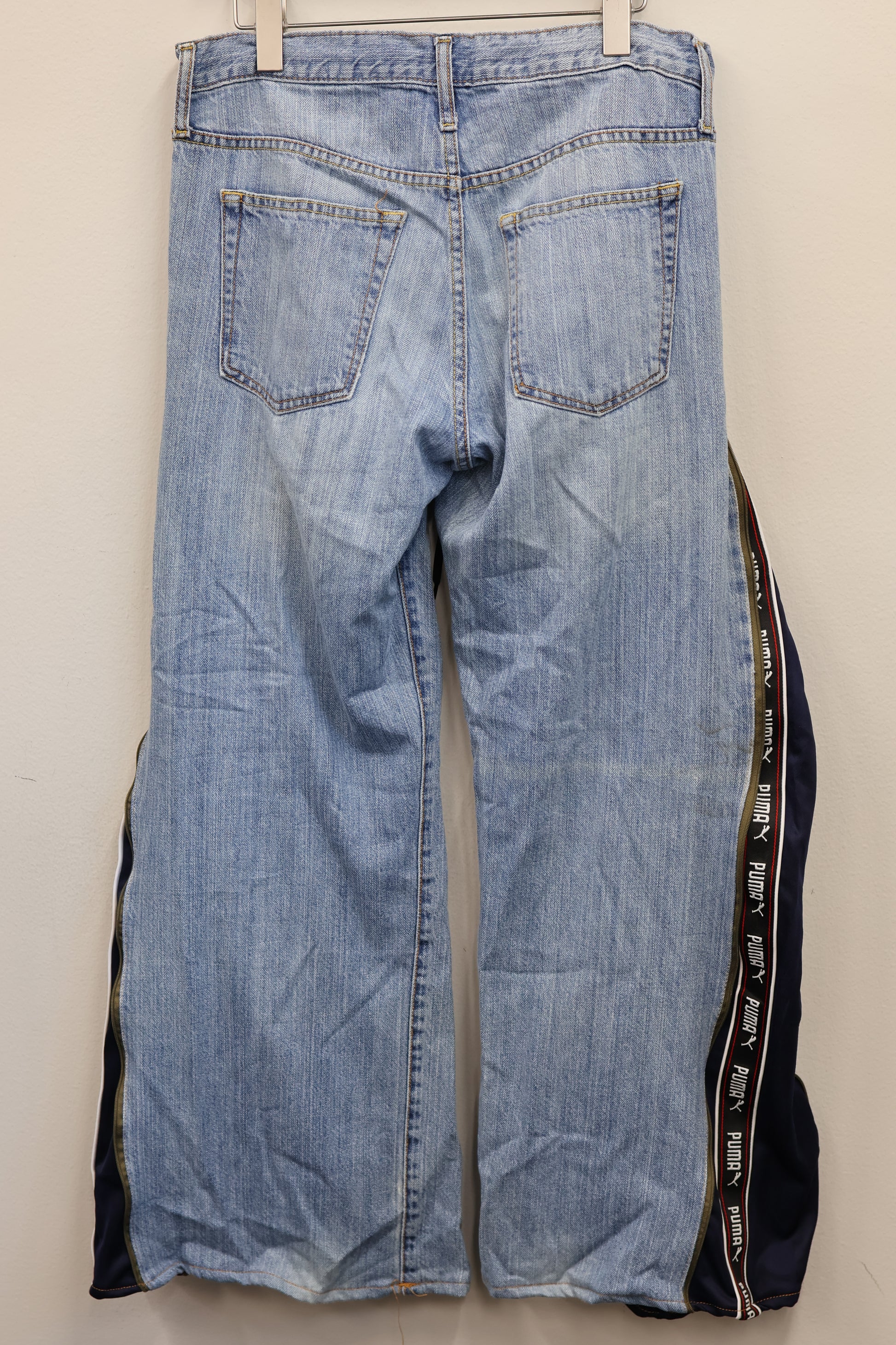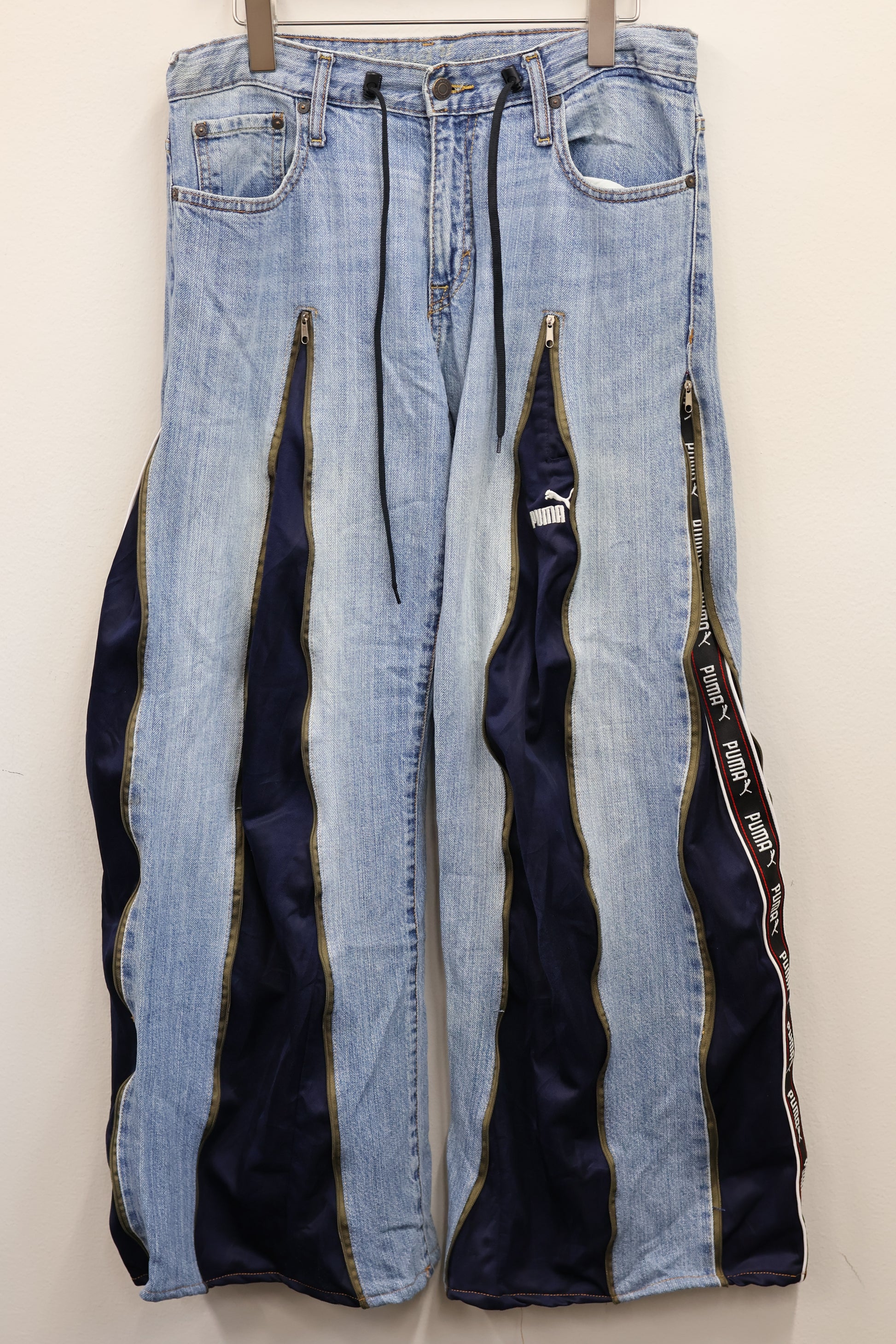 古着のデニムとジャージでリメイクされた1点もののパンツ。