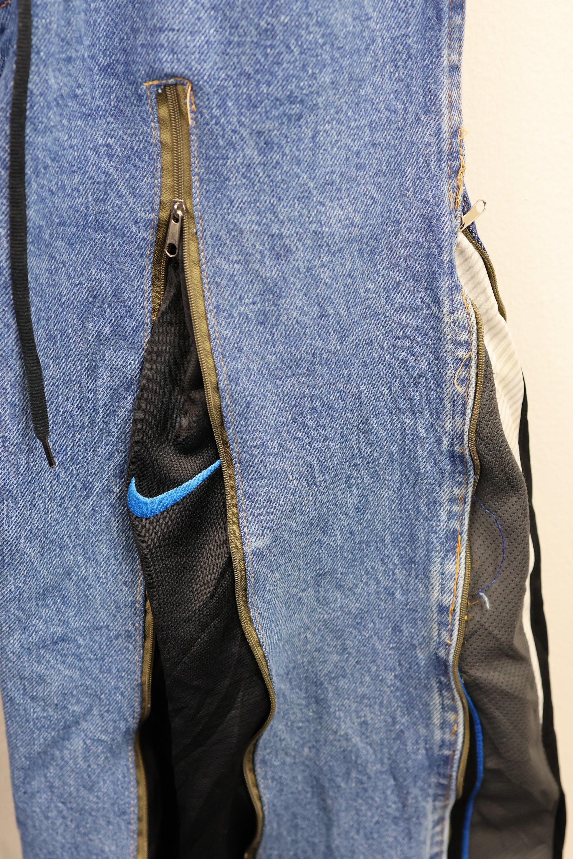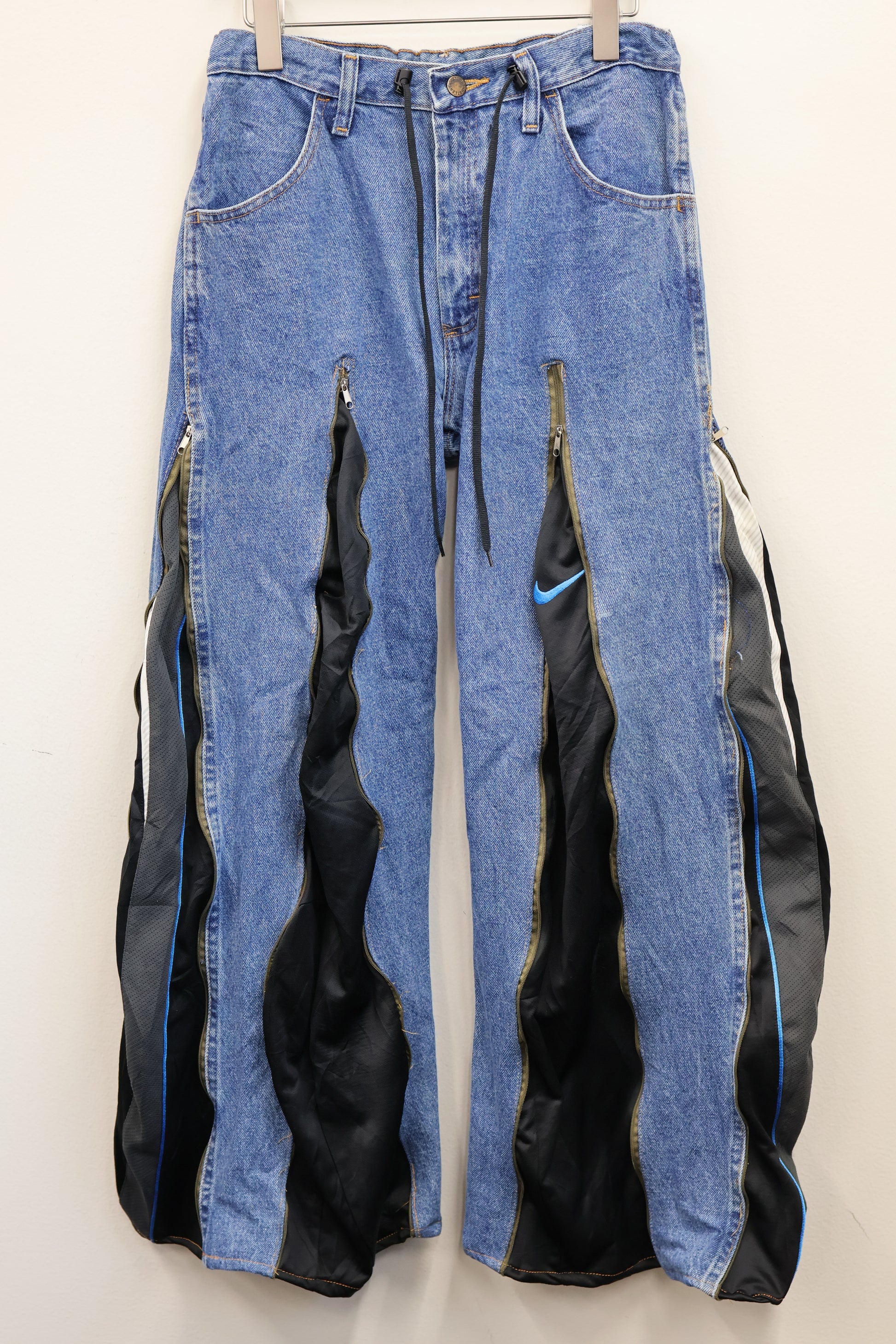 古着のデニムとジャージでリメイクされた1点もののパンツ。