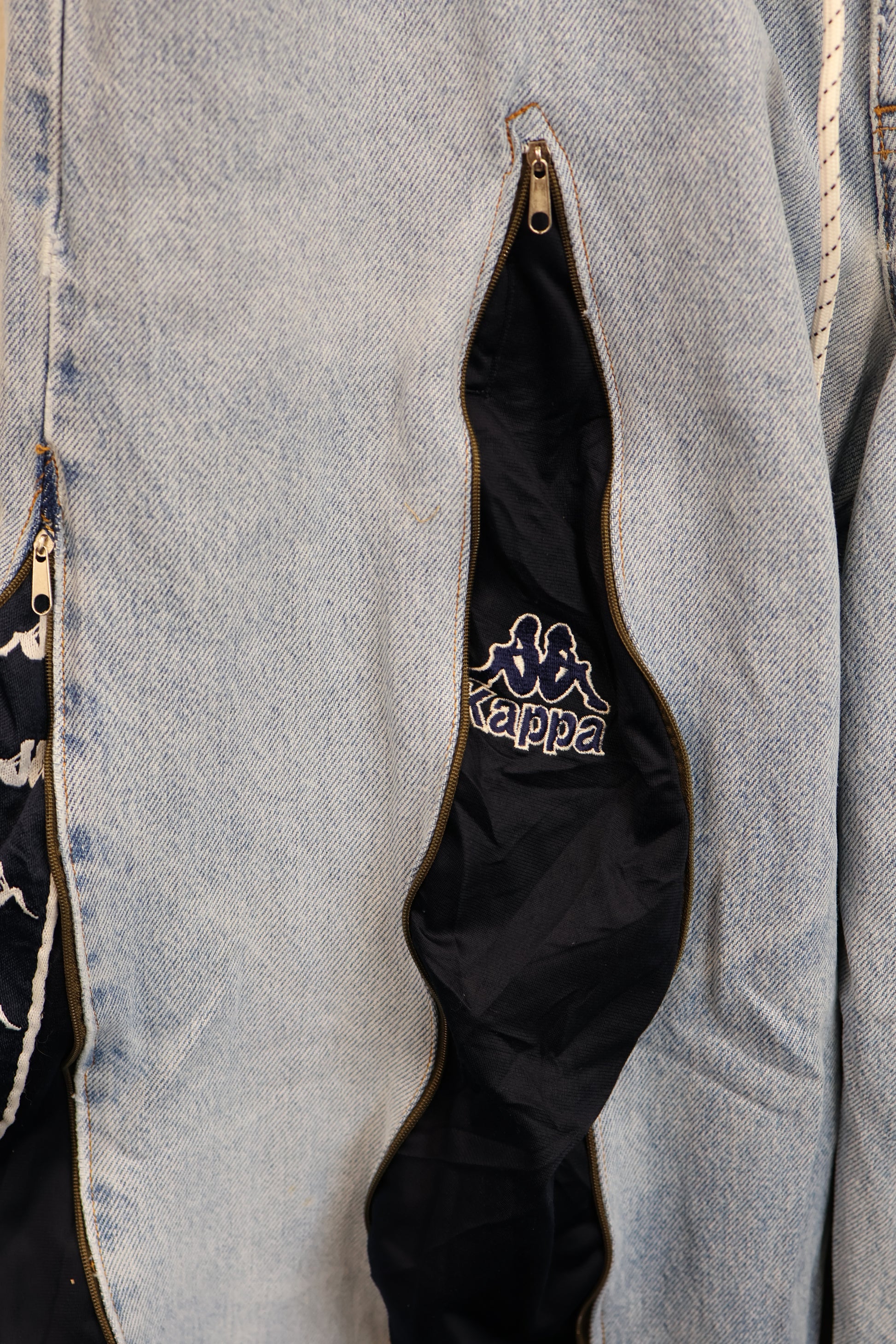 古着のデニムとジャージでリメイクされた1点もののパンツ。