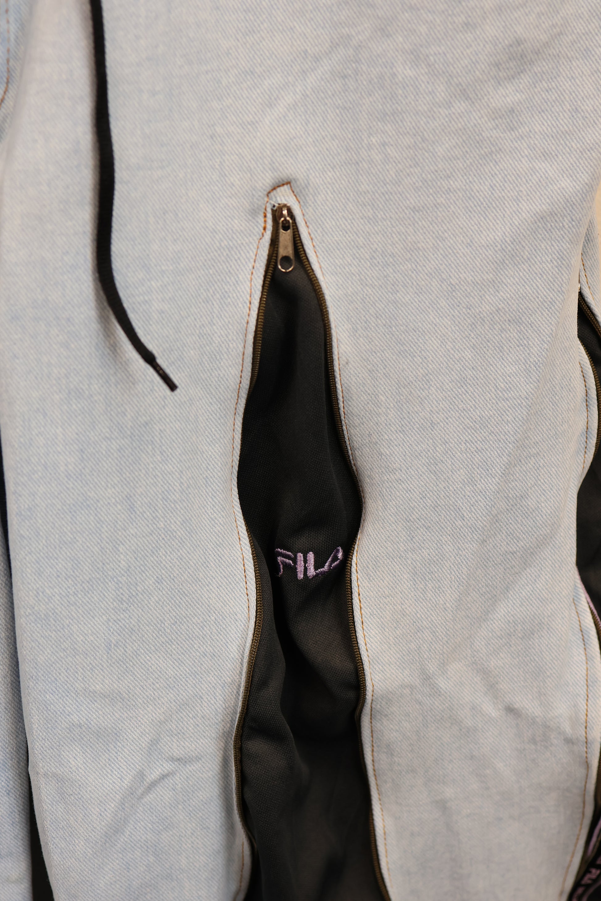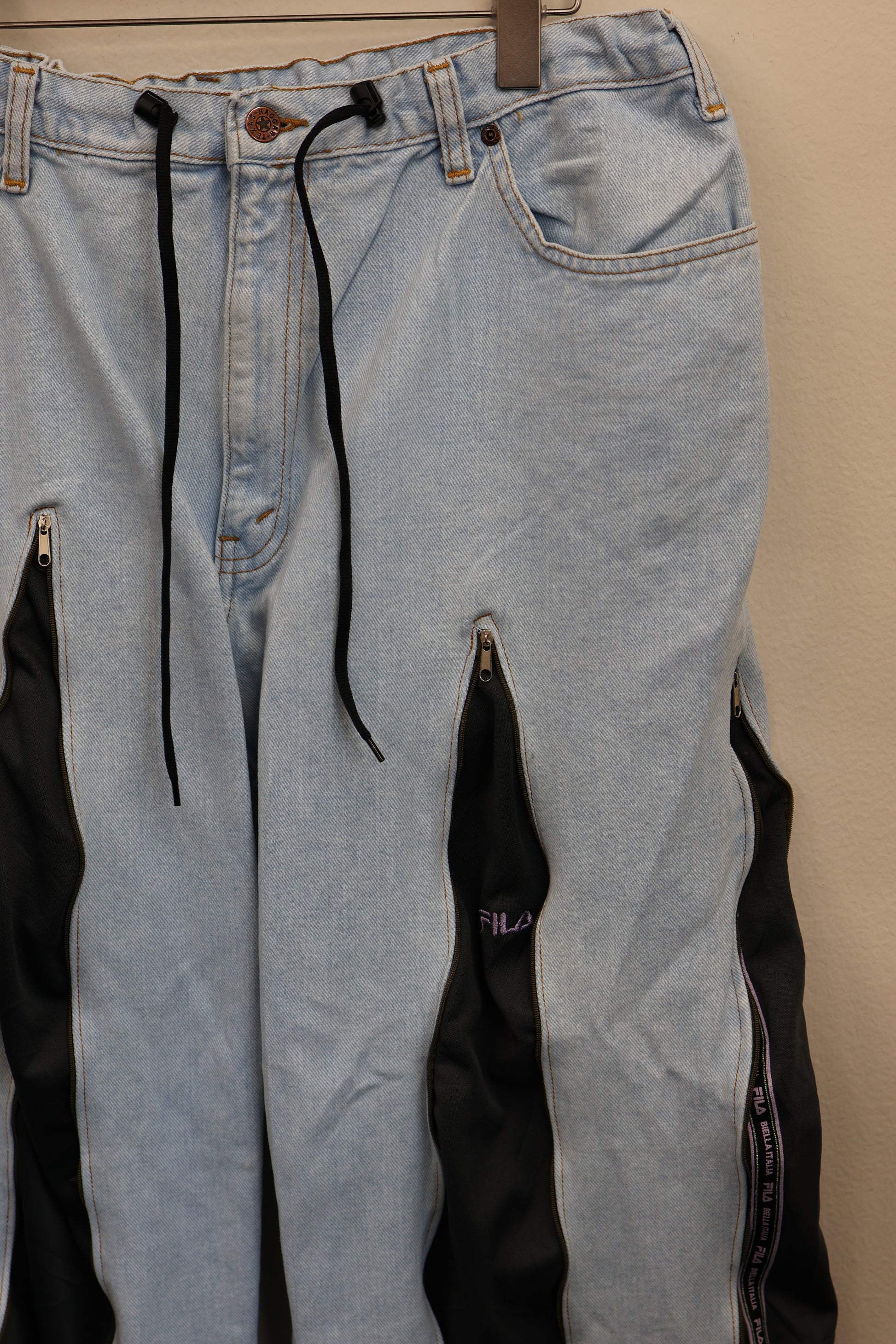古着のデニムとジャージでリメイクされた1点もののパンツ。