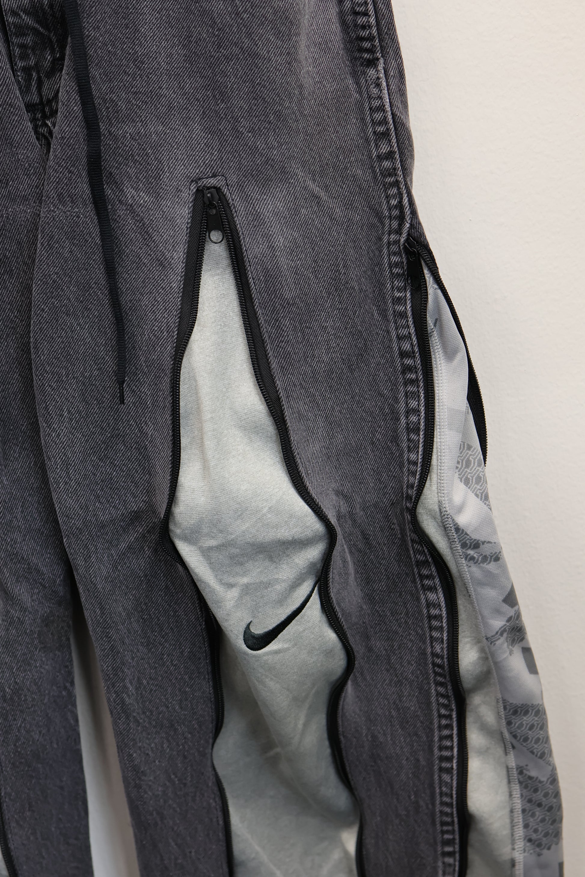 古着のデニムとジャージでリメイクされた1点もののパンツ。