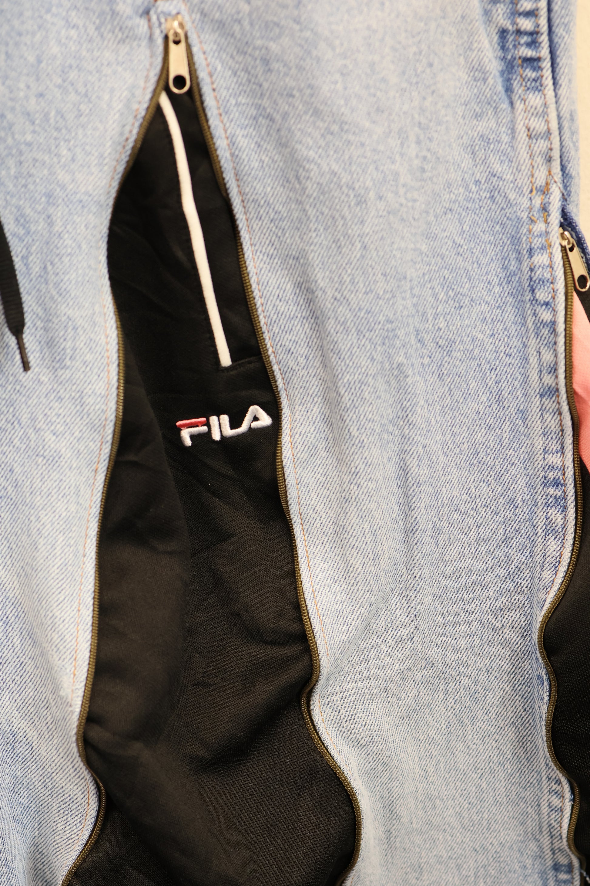 古着のデニムとジャージでリメイクされた1点もののパンツ。