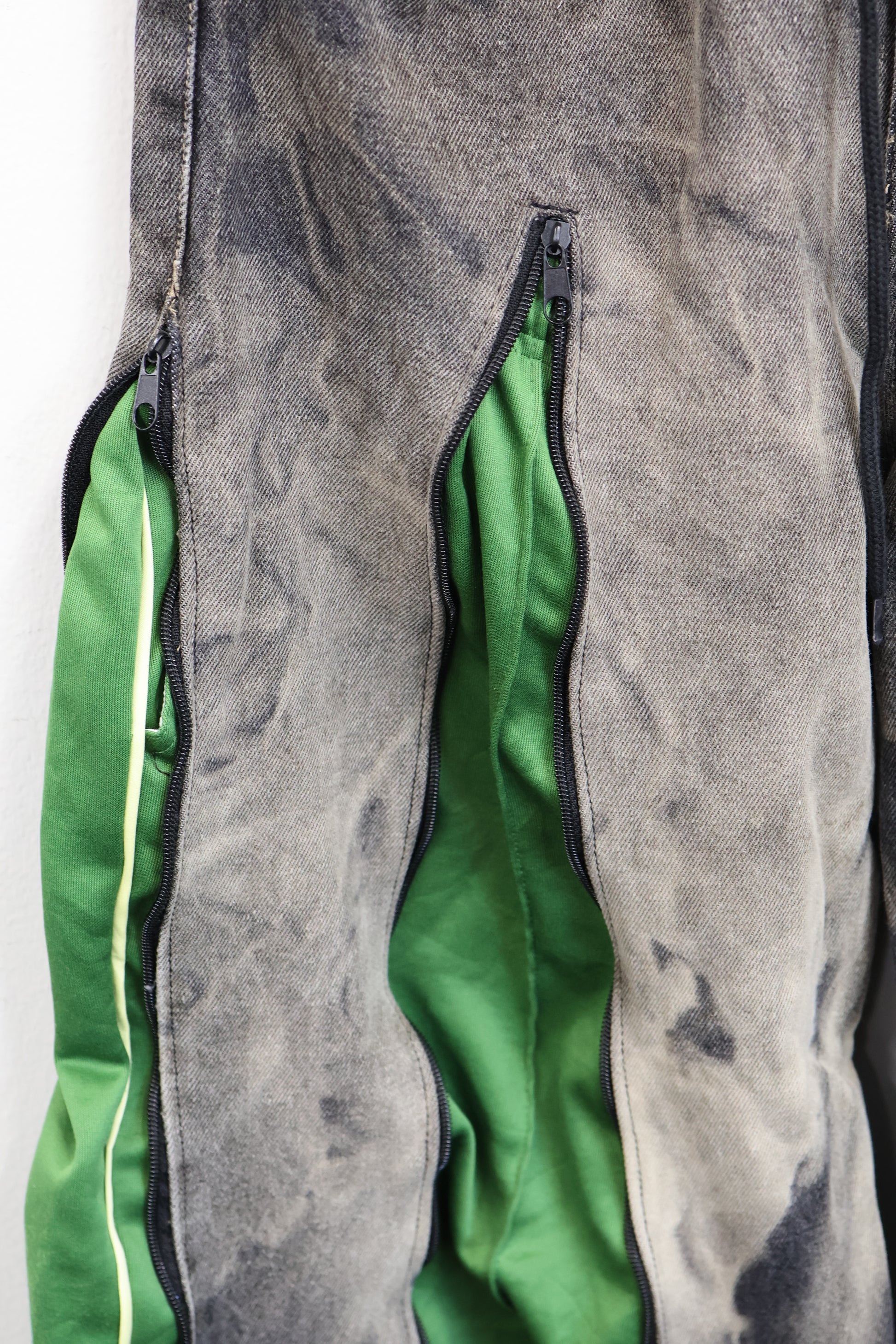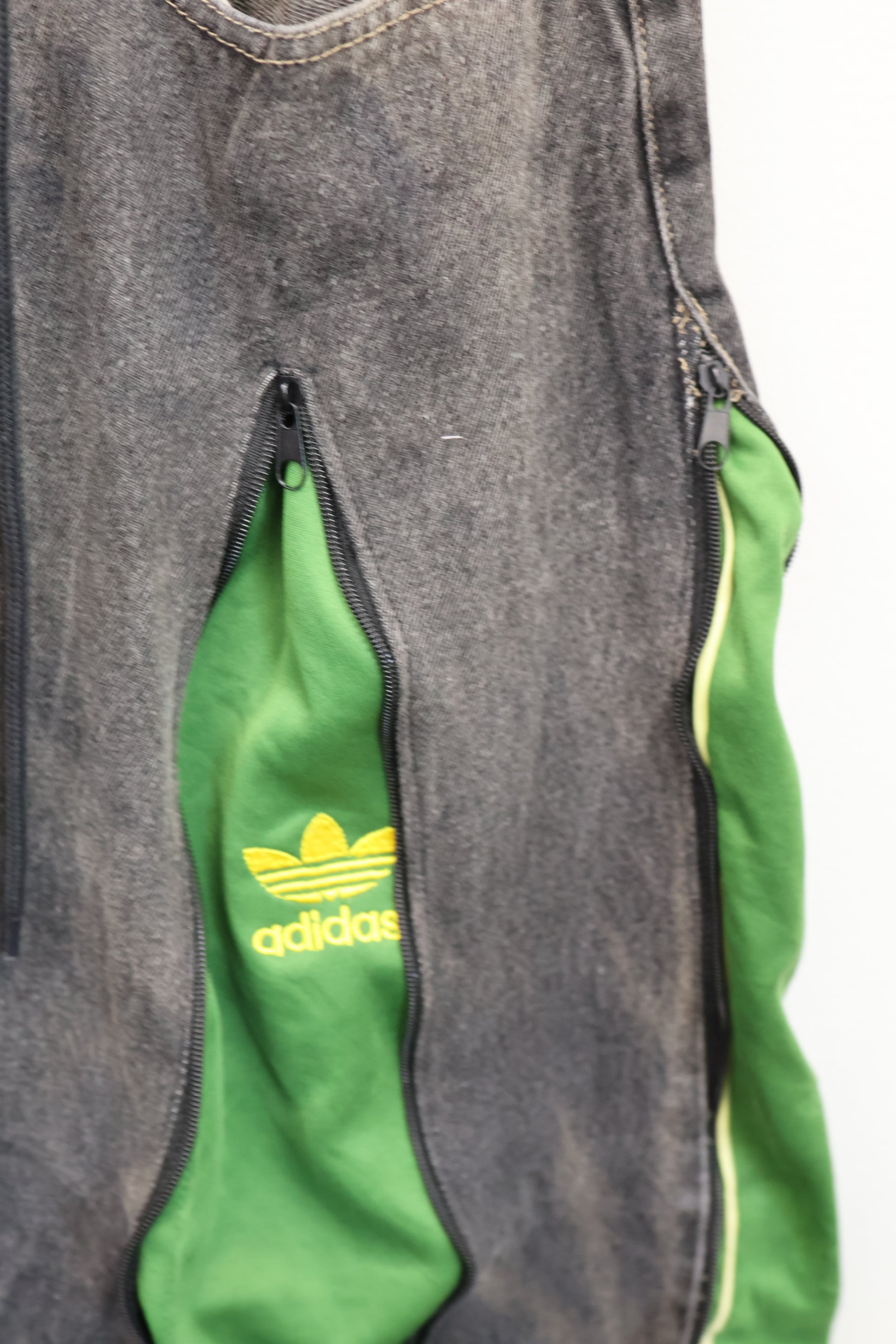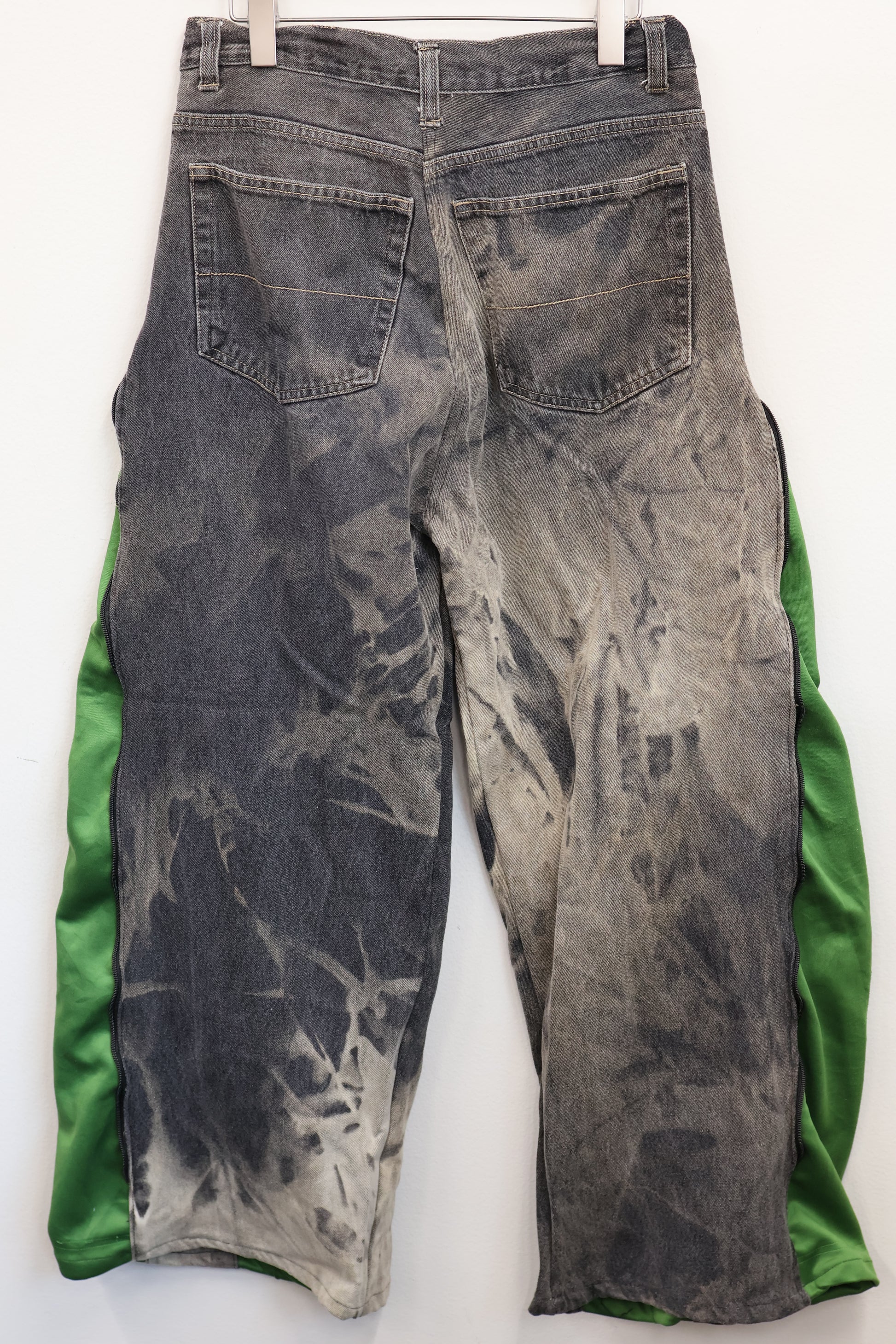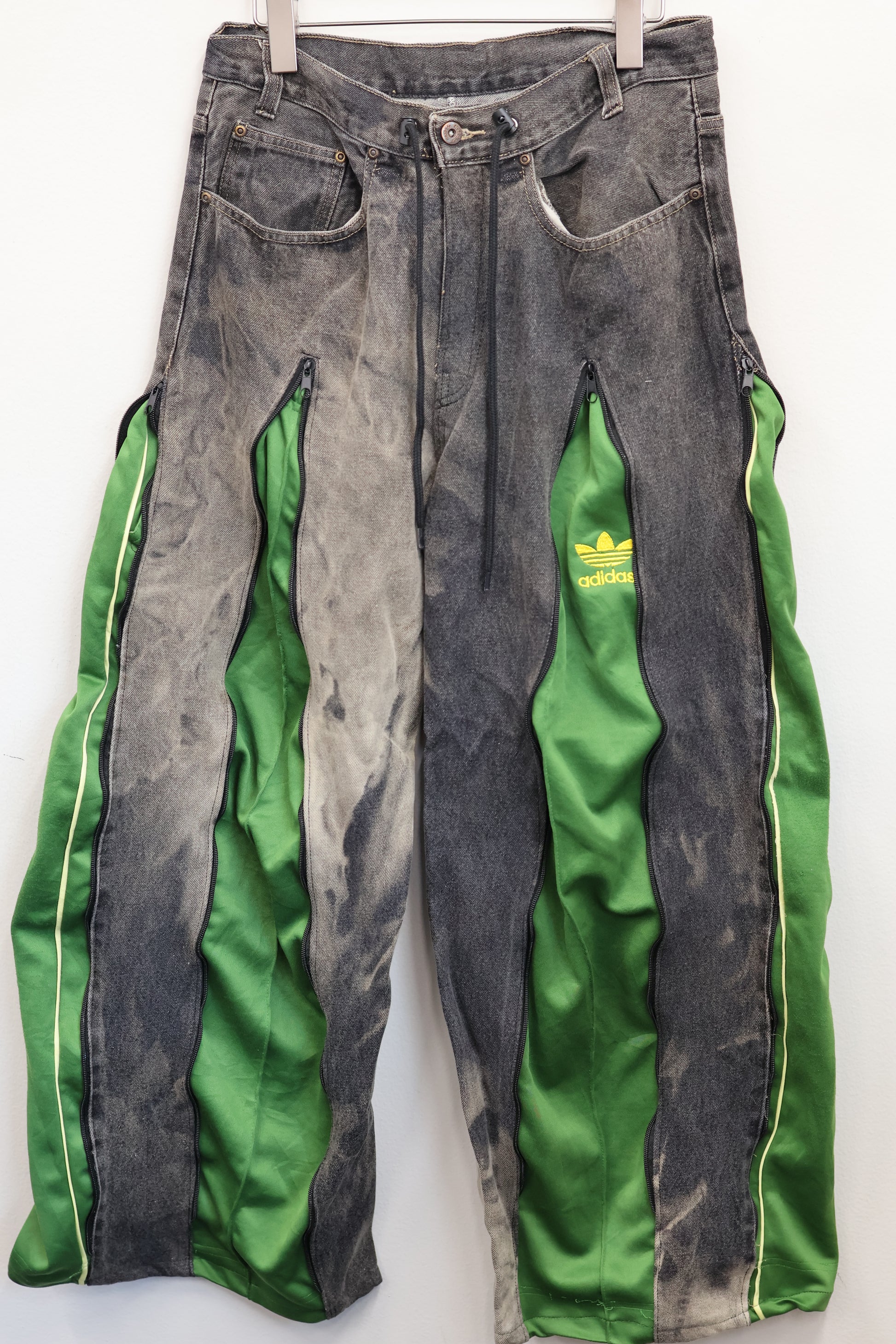 古着のデニムとジャージでリメイクされた1点もののパンツ。