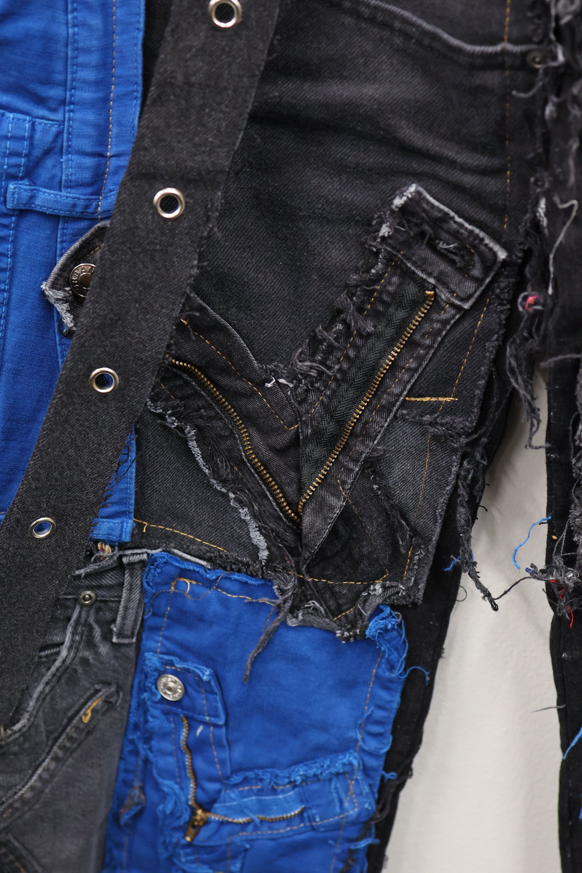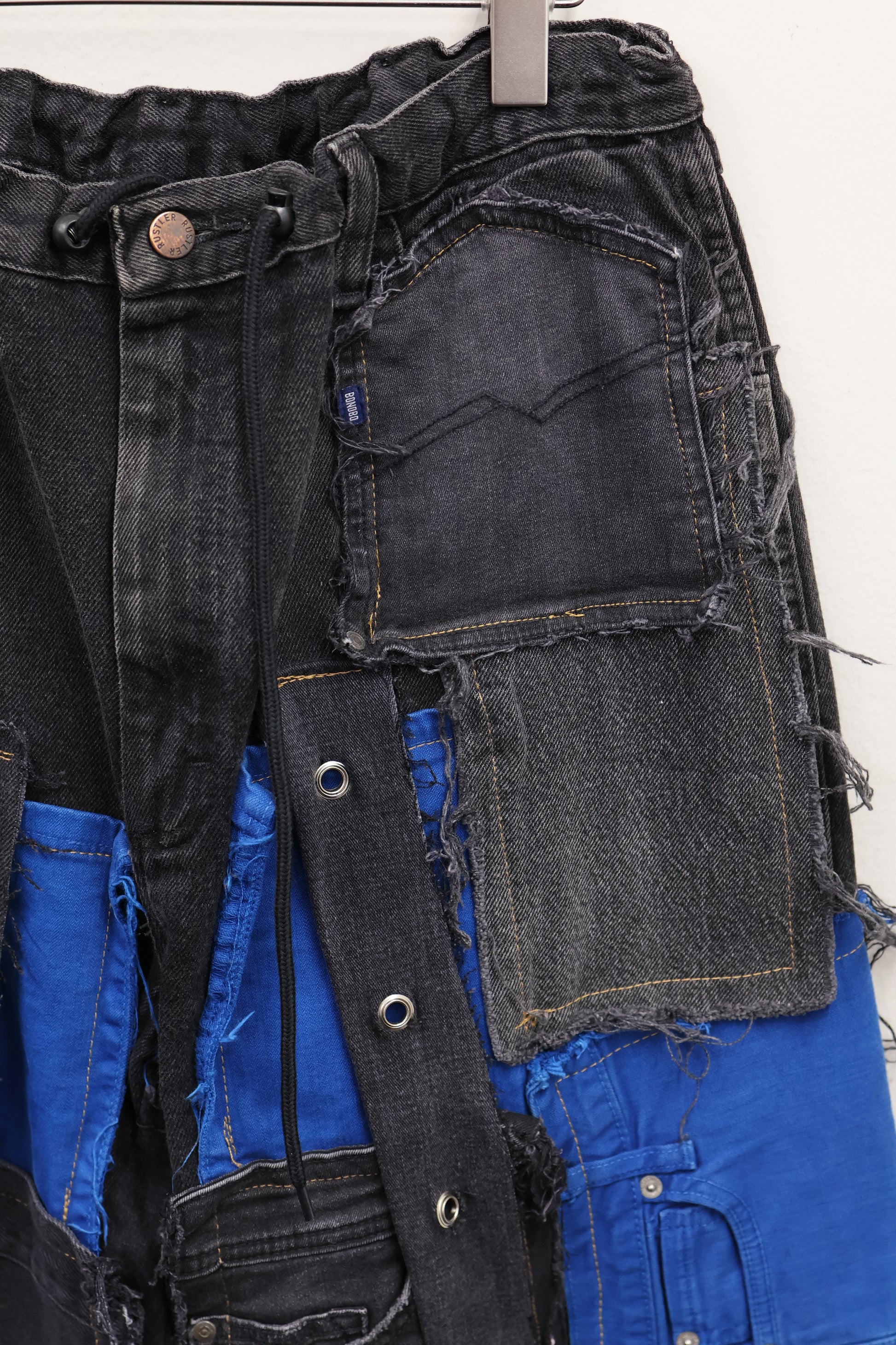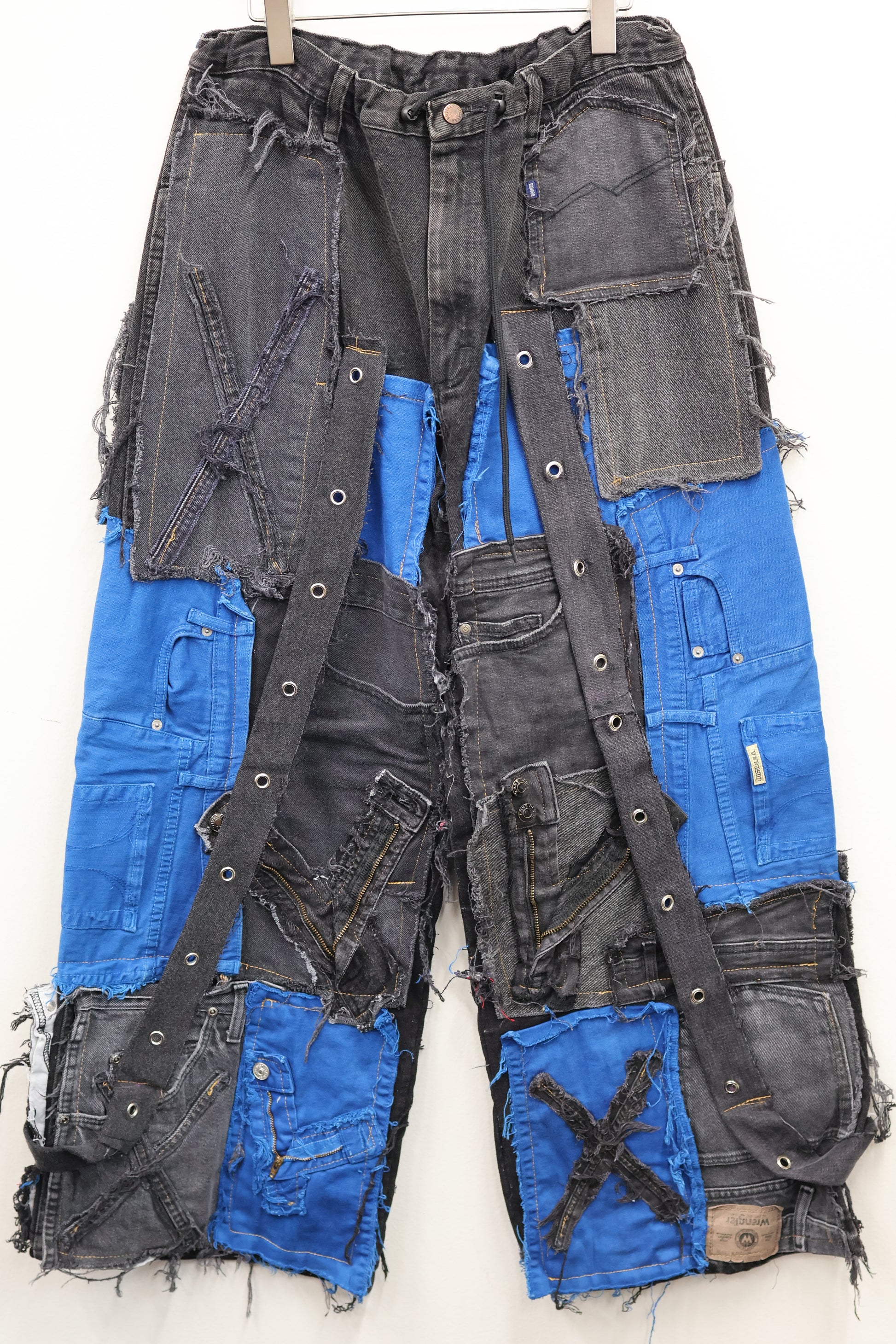 古着のデニムとジャージでリメイクされた1点もののパンツ。