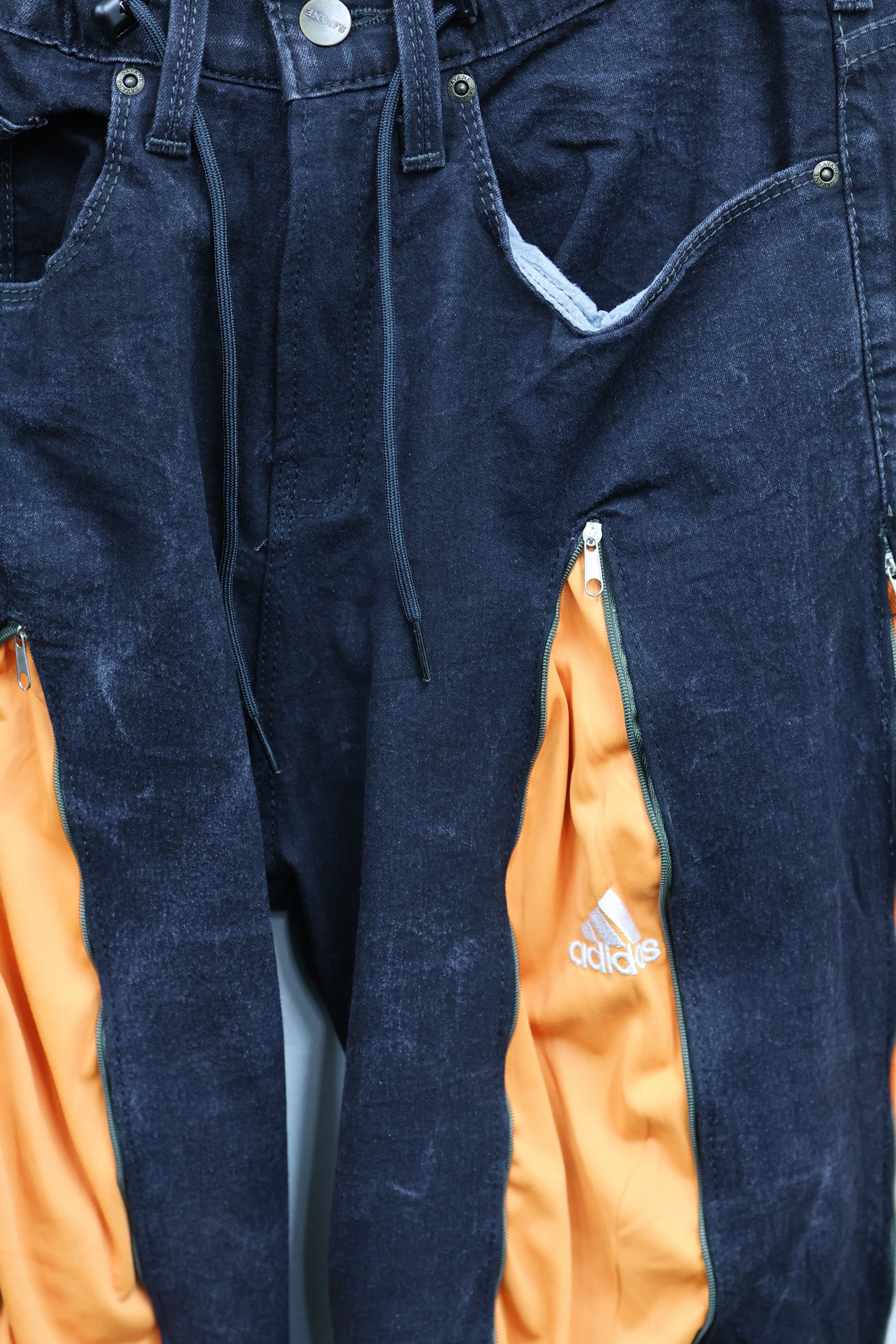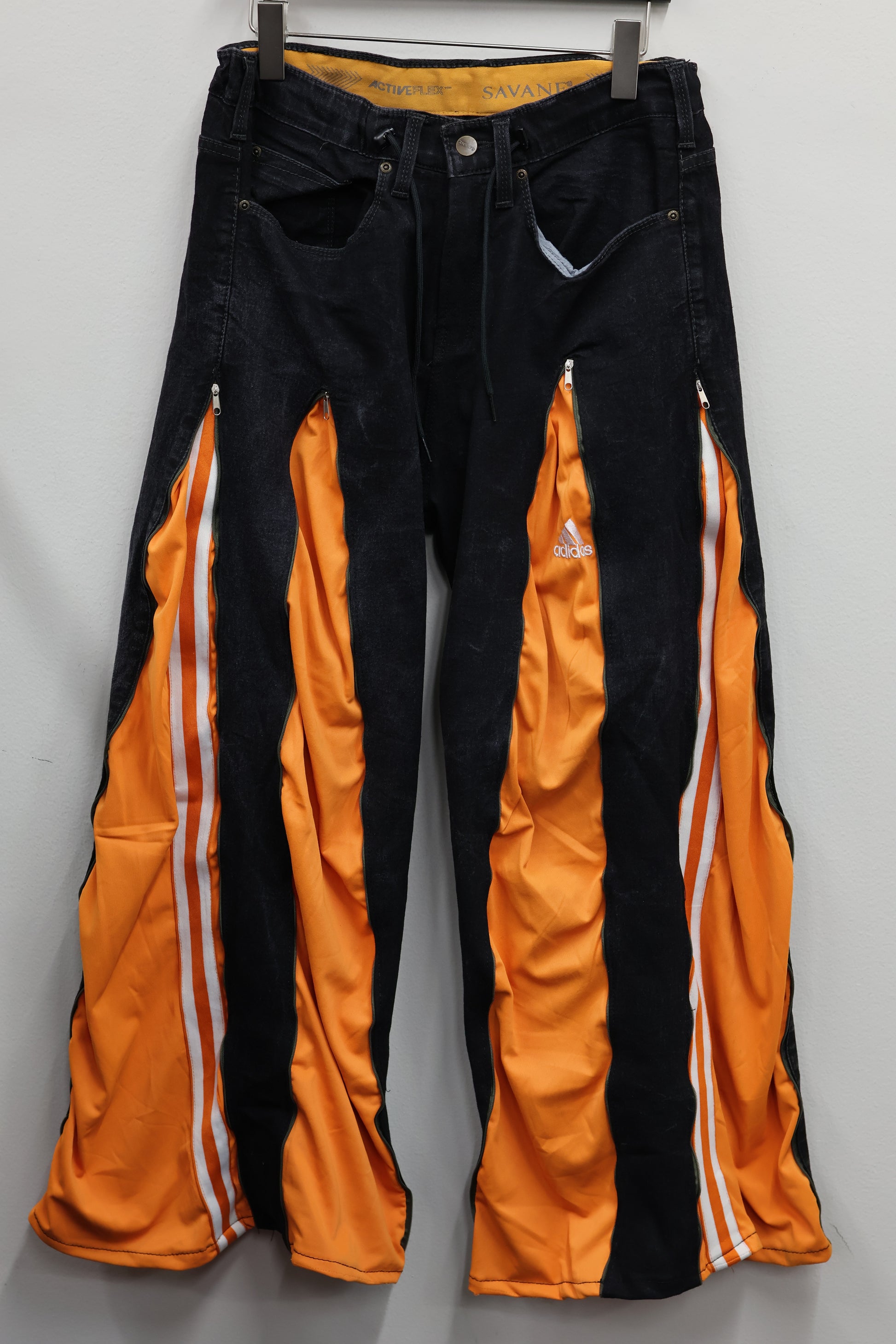古着のデニムとジャージでリメイクされた1点もののパンツ。
