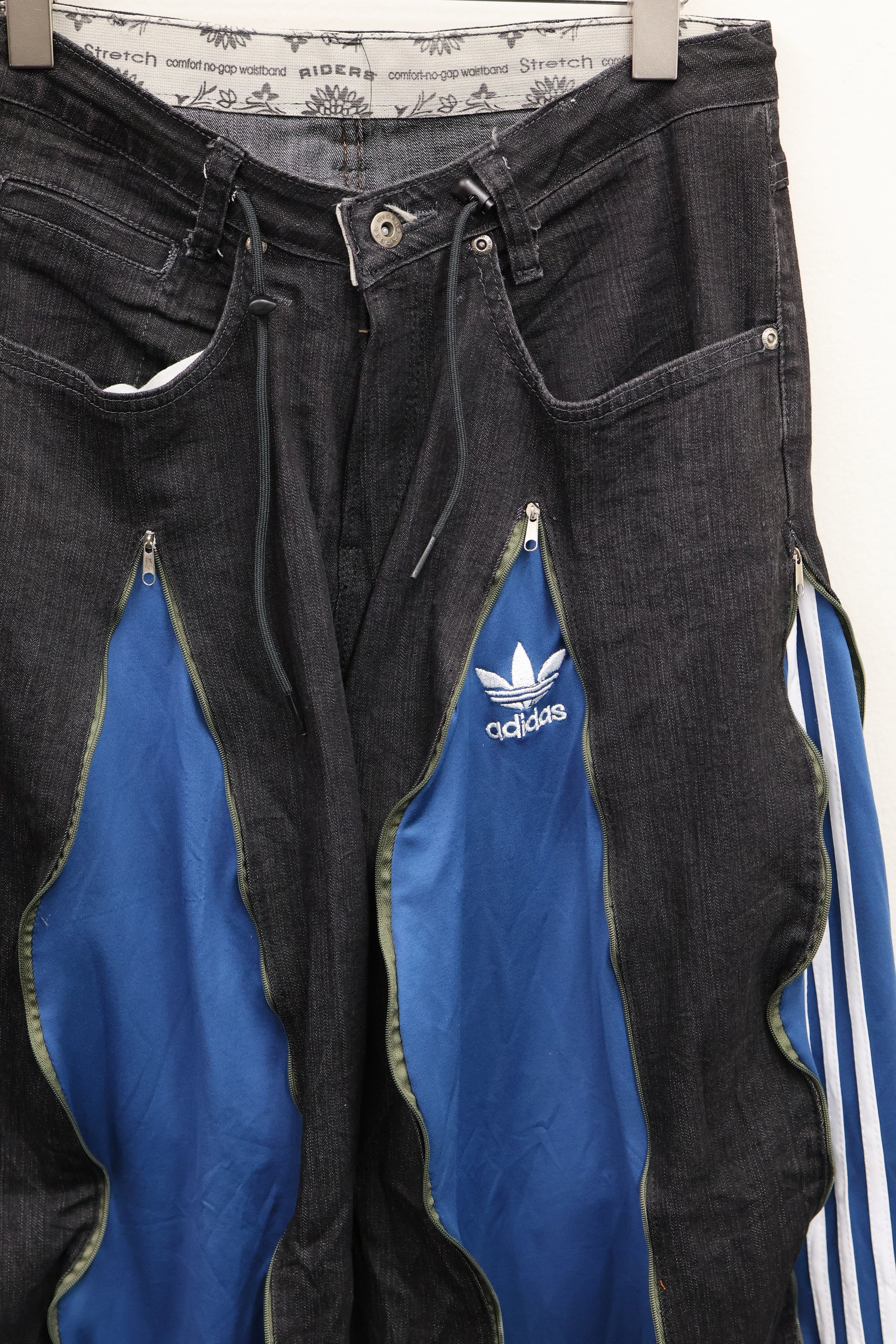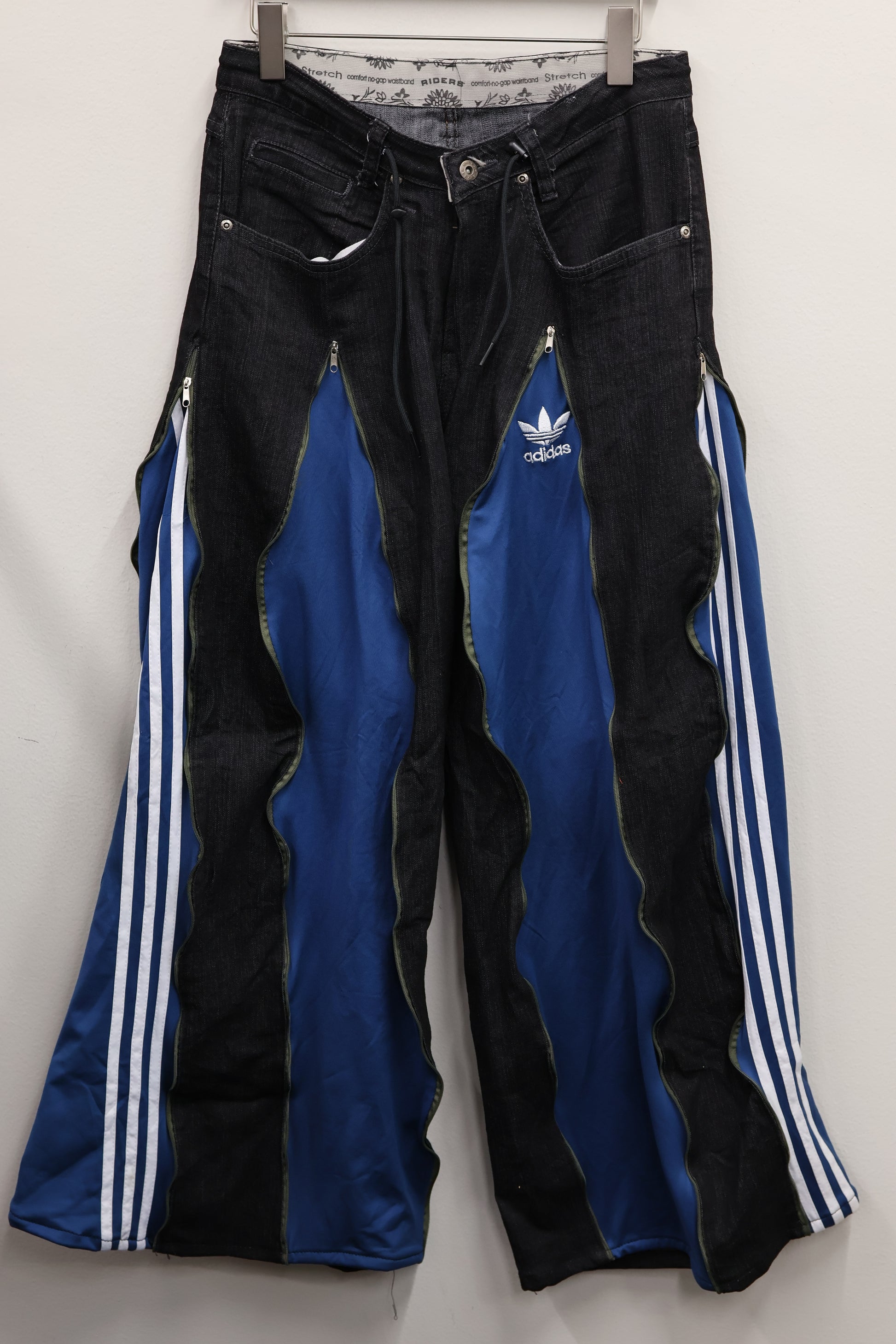 古着のデニムとジャージでリメイクされた1点もののパンツ。