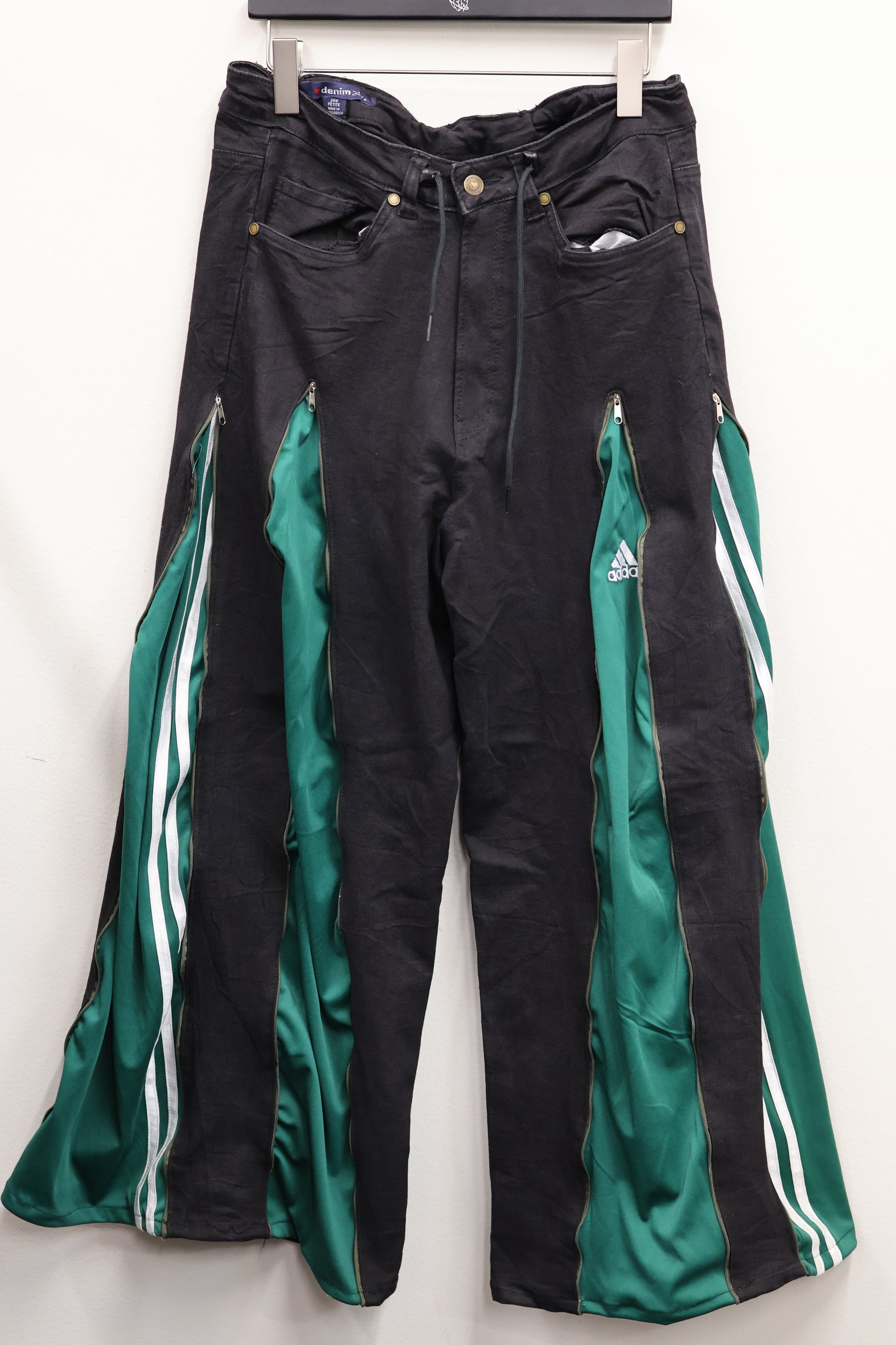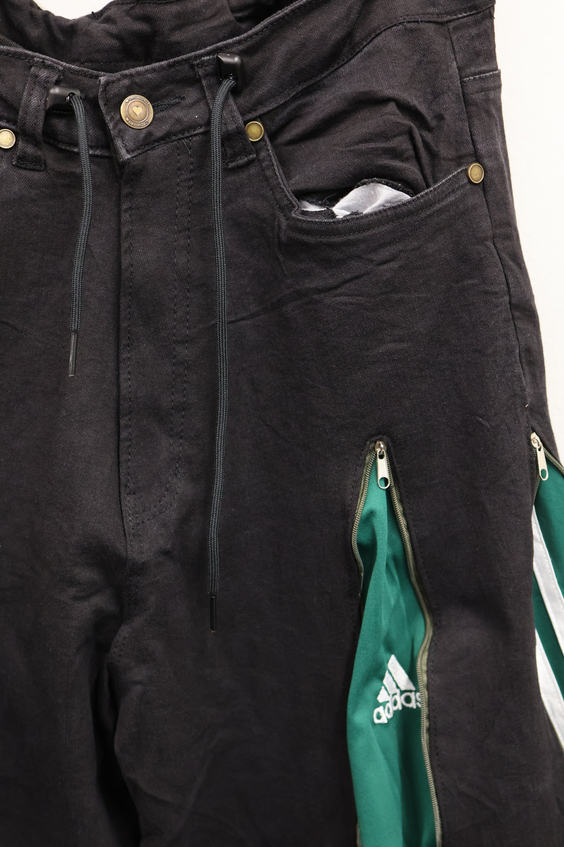 古着のデニムとジャージでリメイクされた1点もののパンツ。
