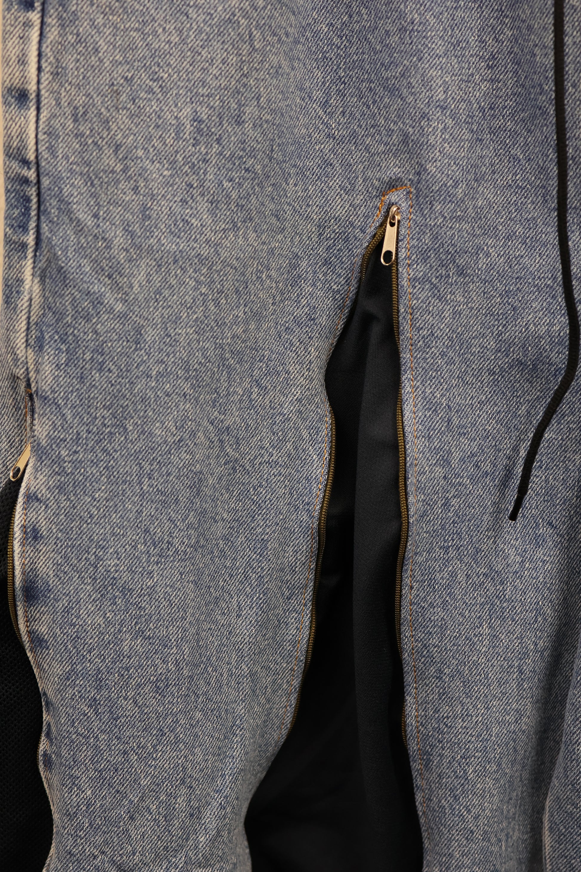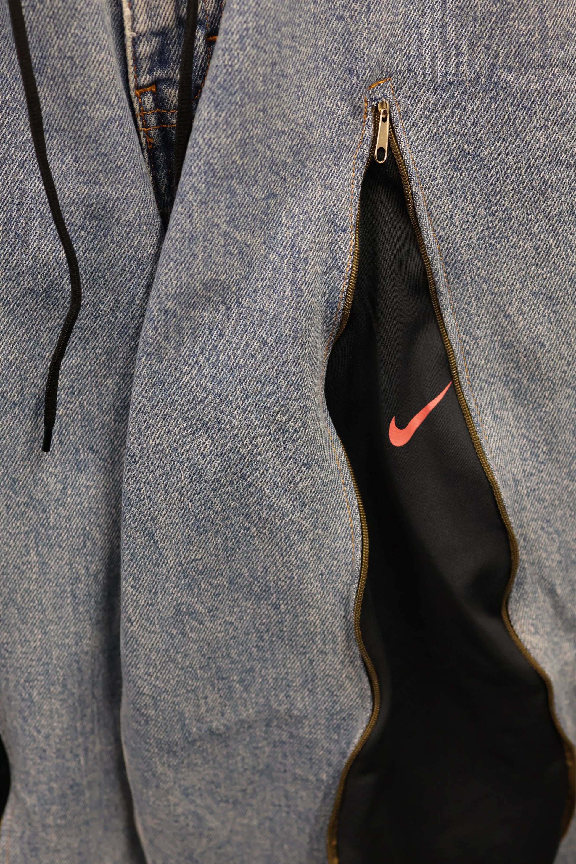 古着のデニムとジャージでリメイクされた1点もののパンツ。