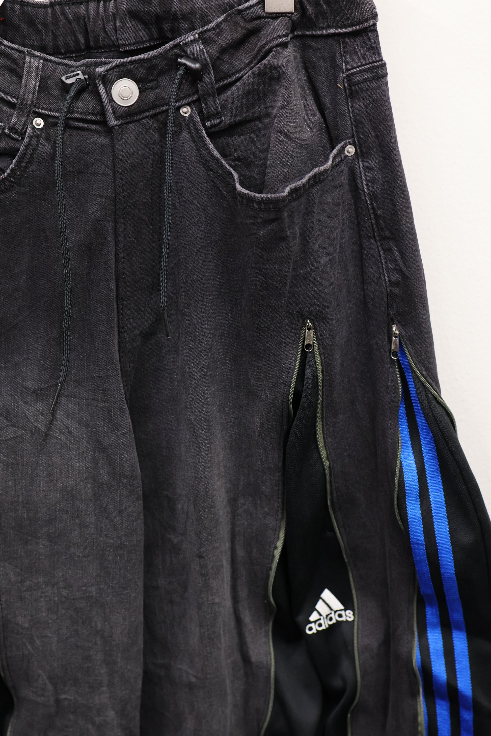 古着のデニムとジャージでリメイクされた1点もののパンツ。