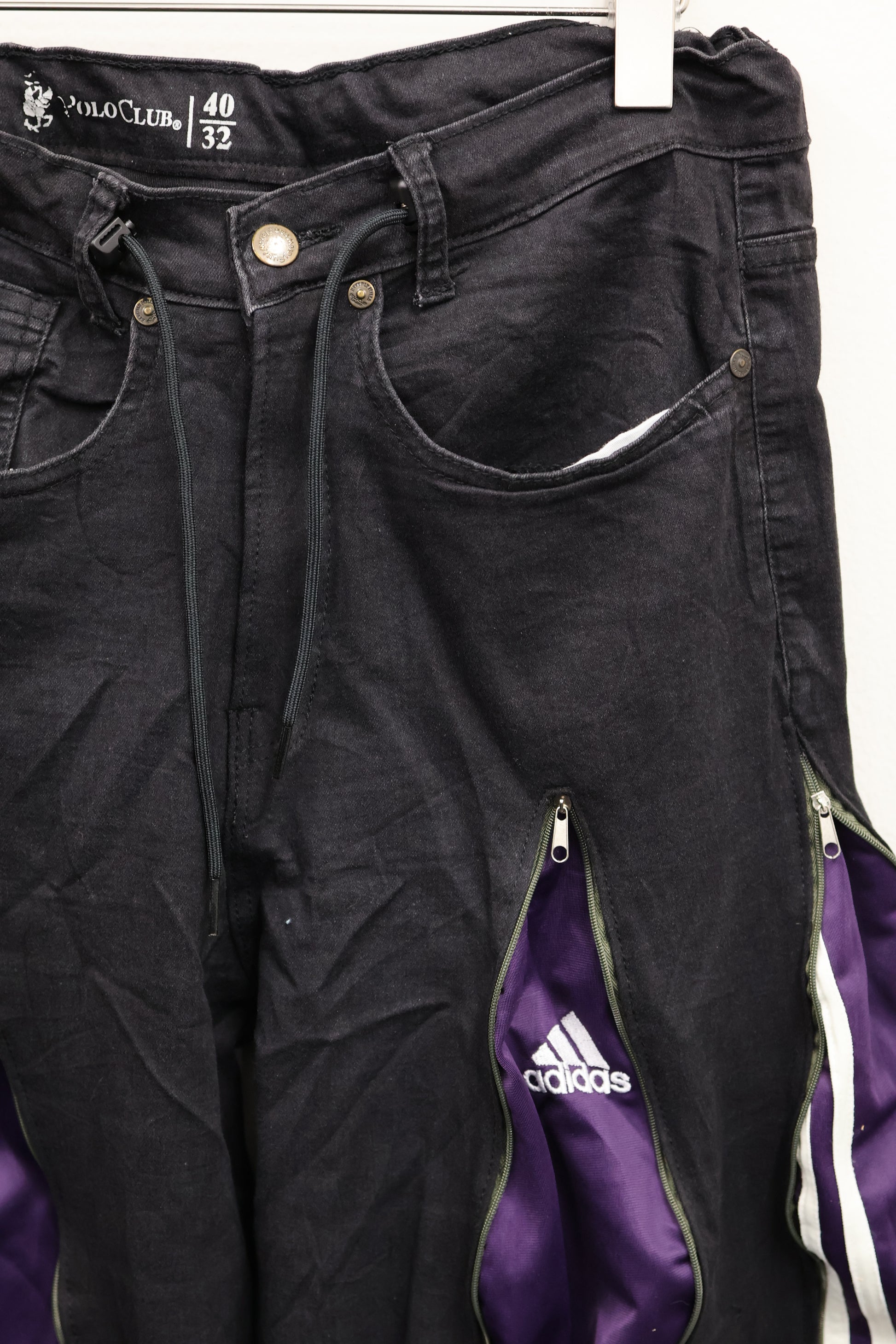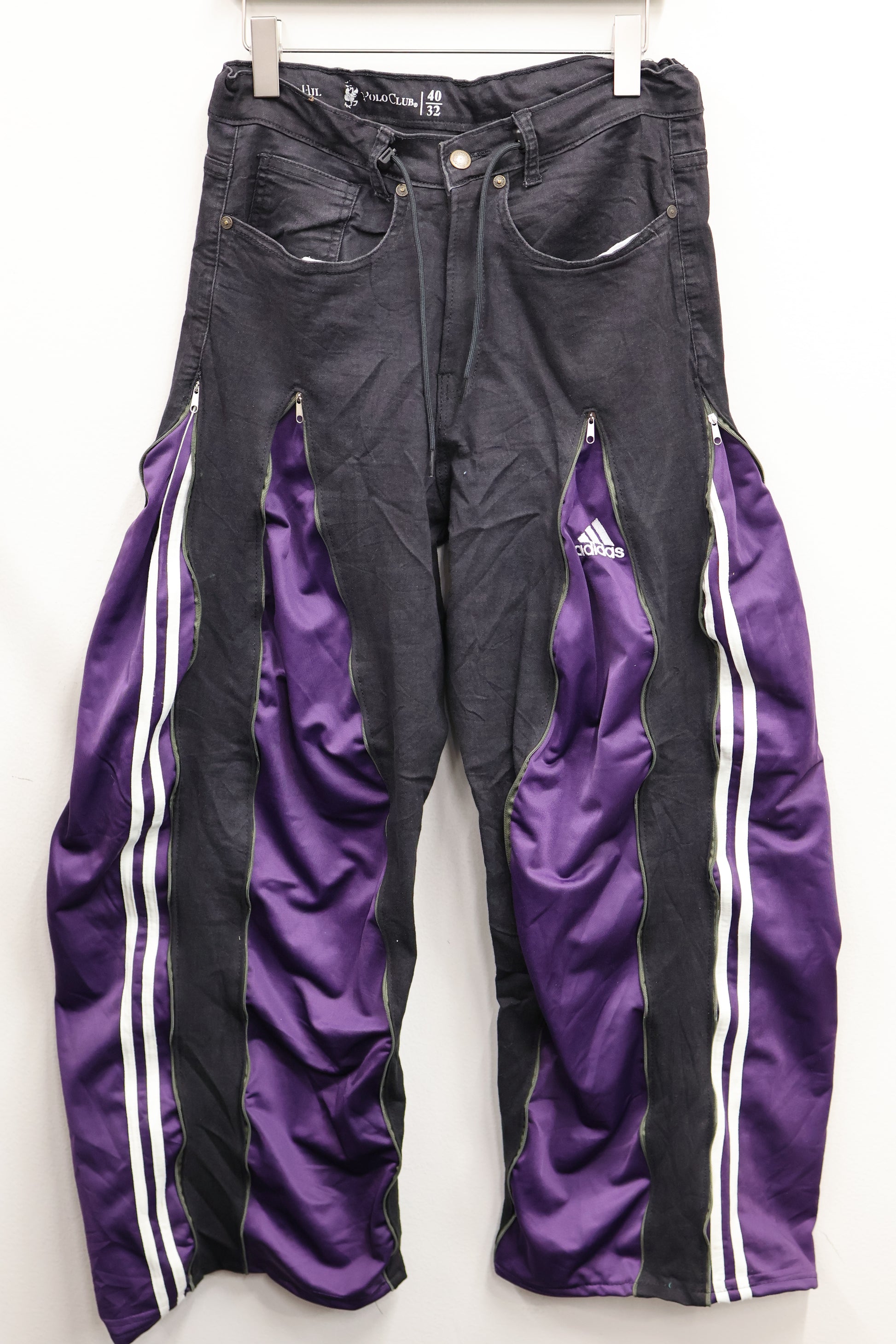 古着のデニムとジャージでリメイクされた1点もののパンツ。