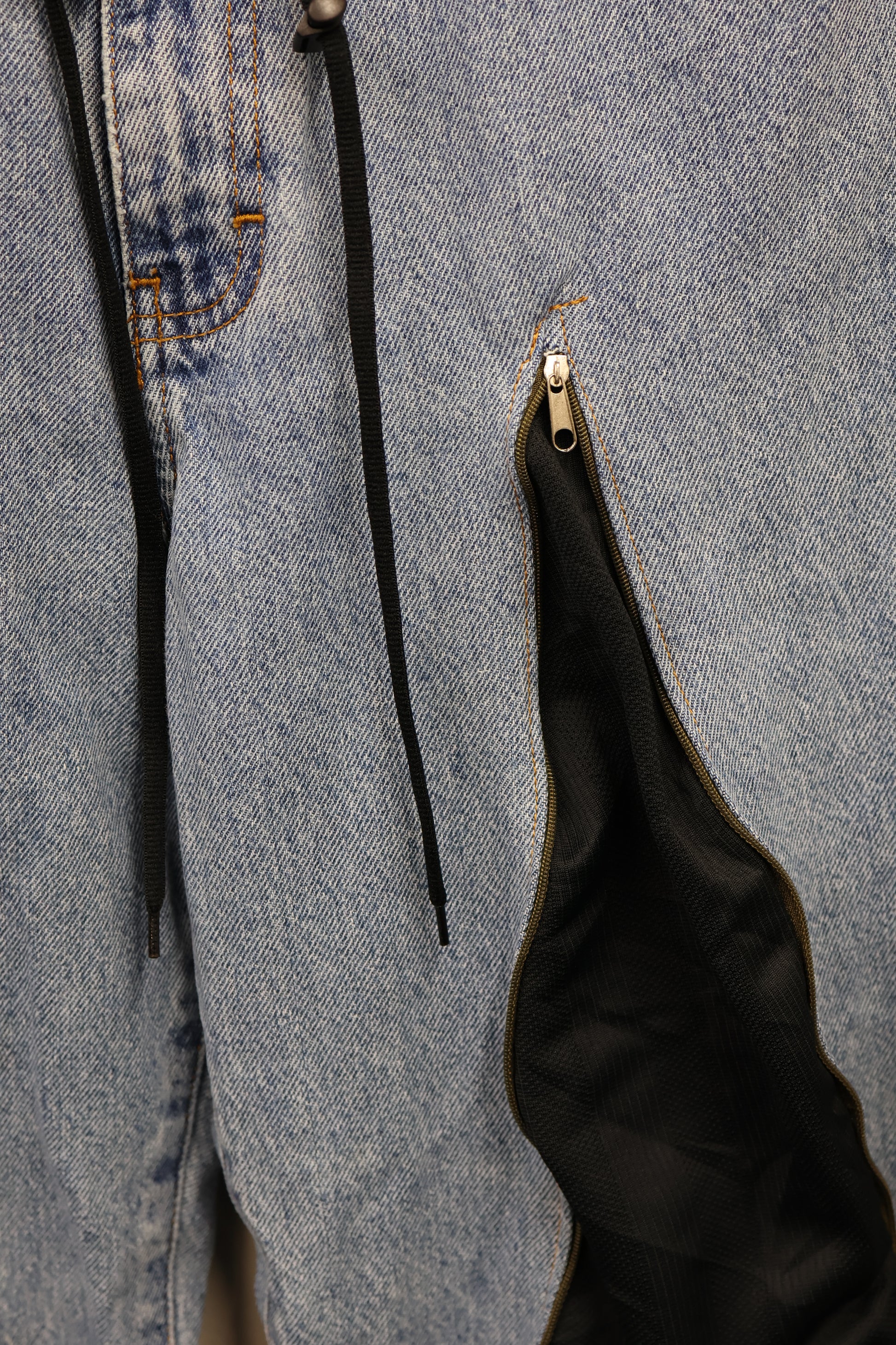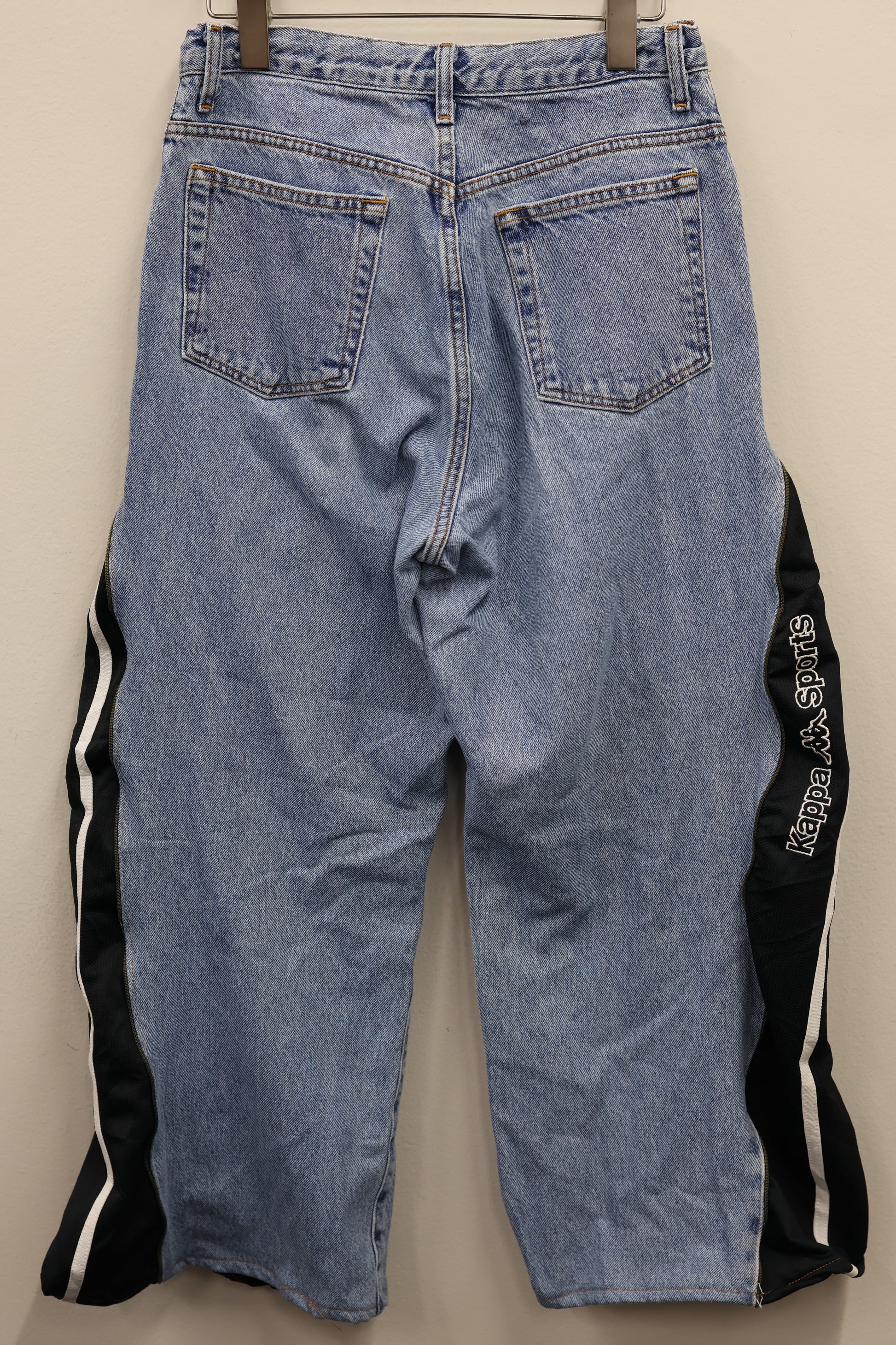 古着のデニムとジャージでリメイクされた1点もののパンツ。