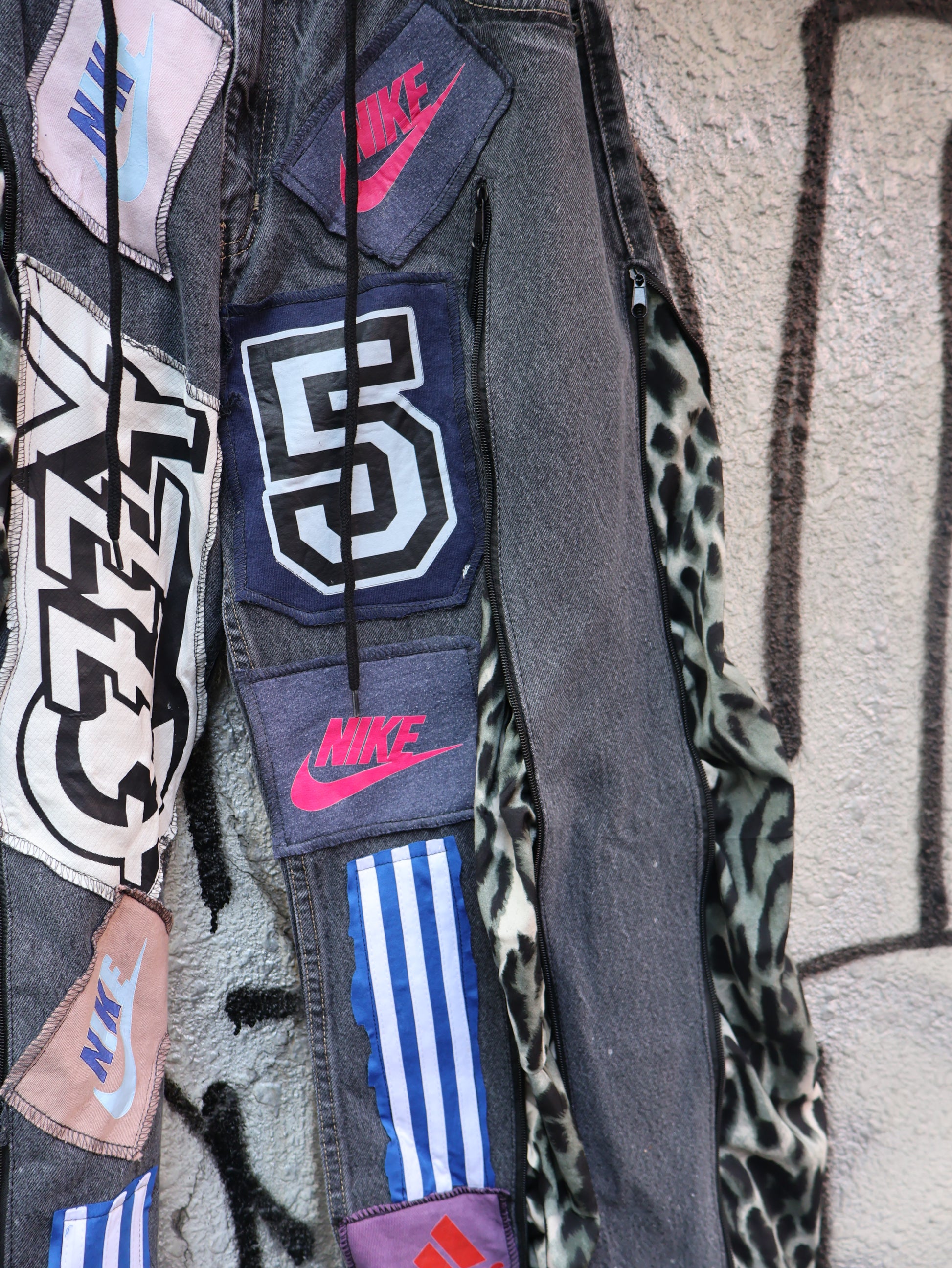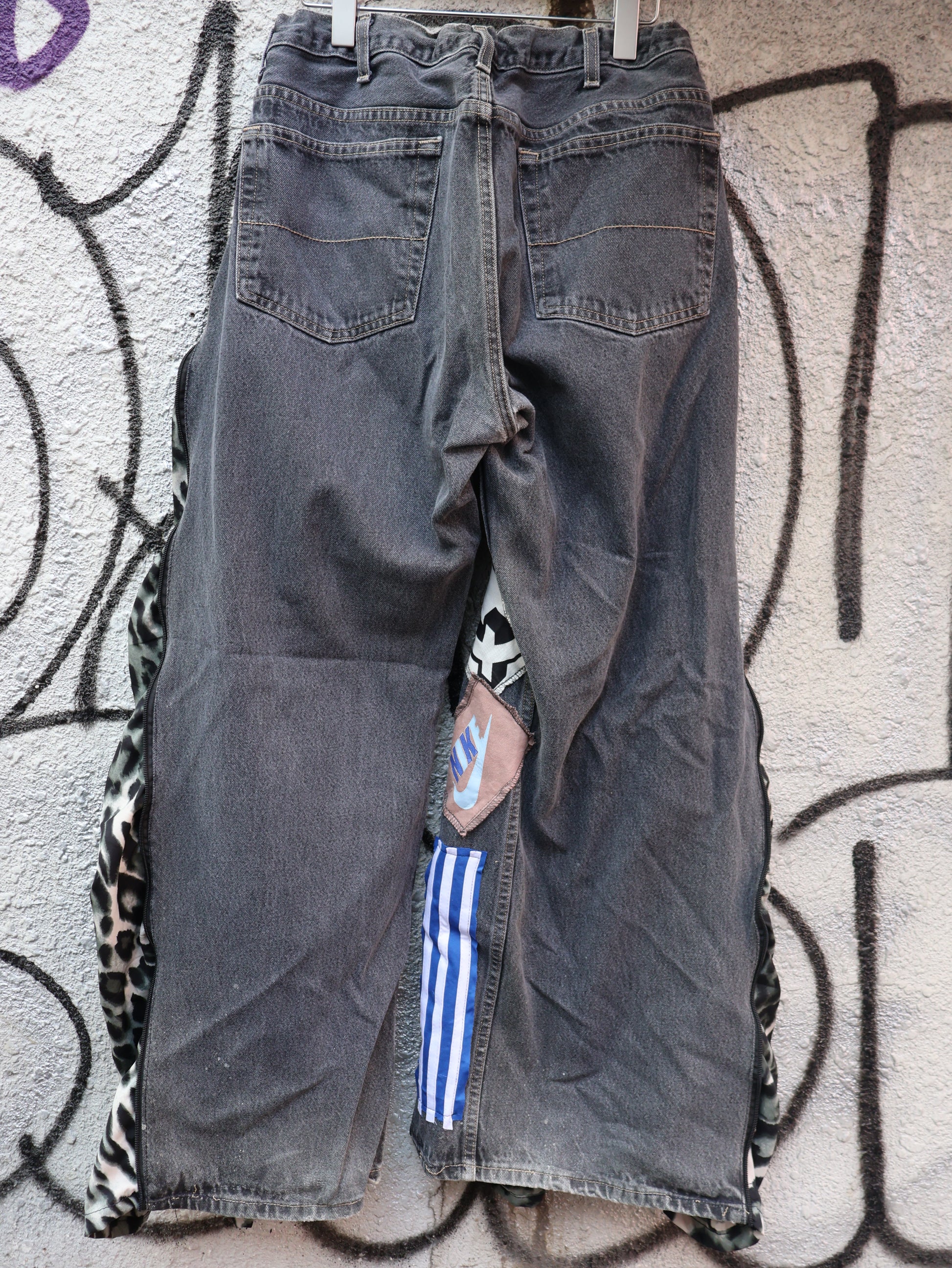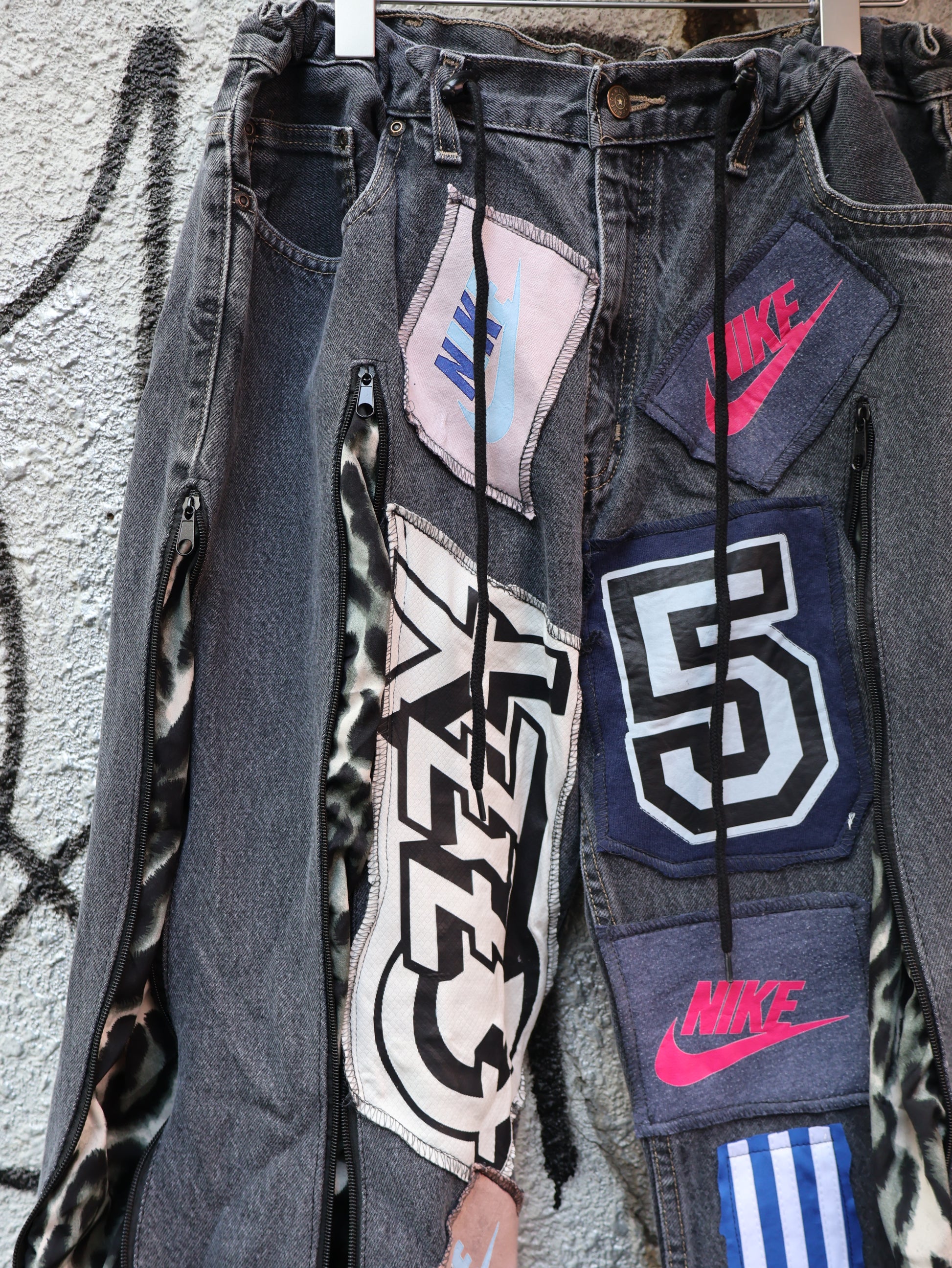 古着のデニムとジャージでリメイクされた1点もののパンツ。
