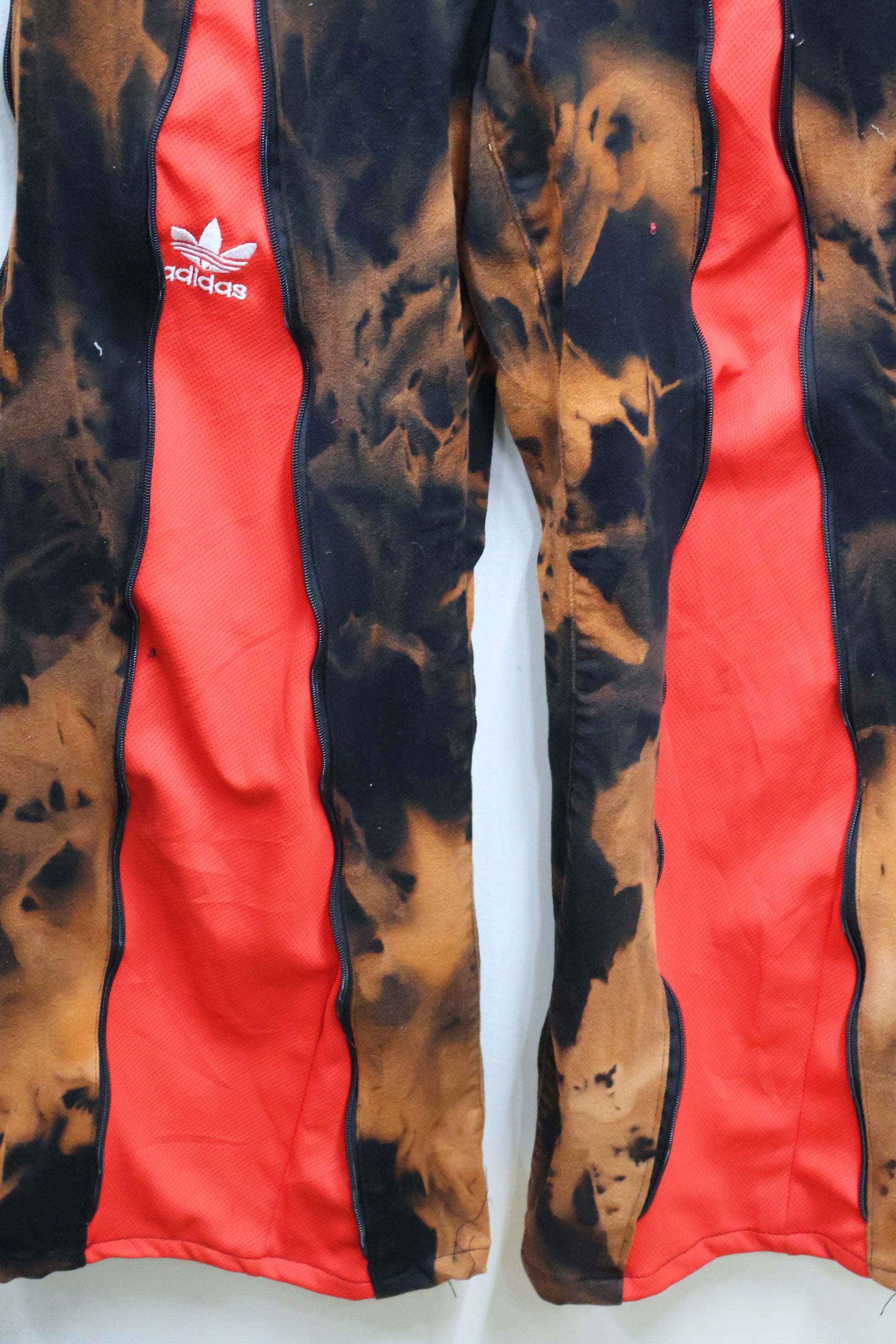ウォッシュ加工されたブラック〜グレーのデニムに、サイドにはトラックパンツのラインディテールを組み合わせたインパクトのあるデザインです。