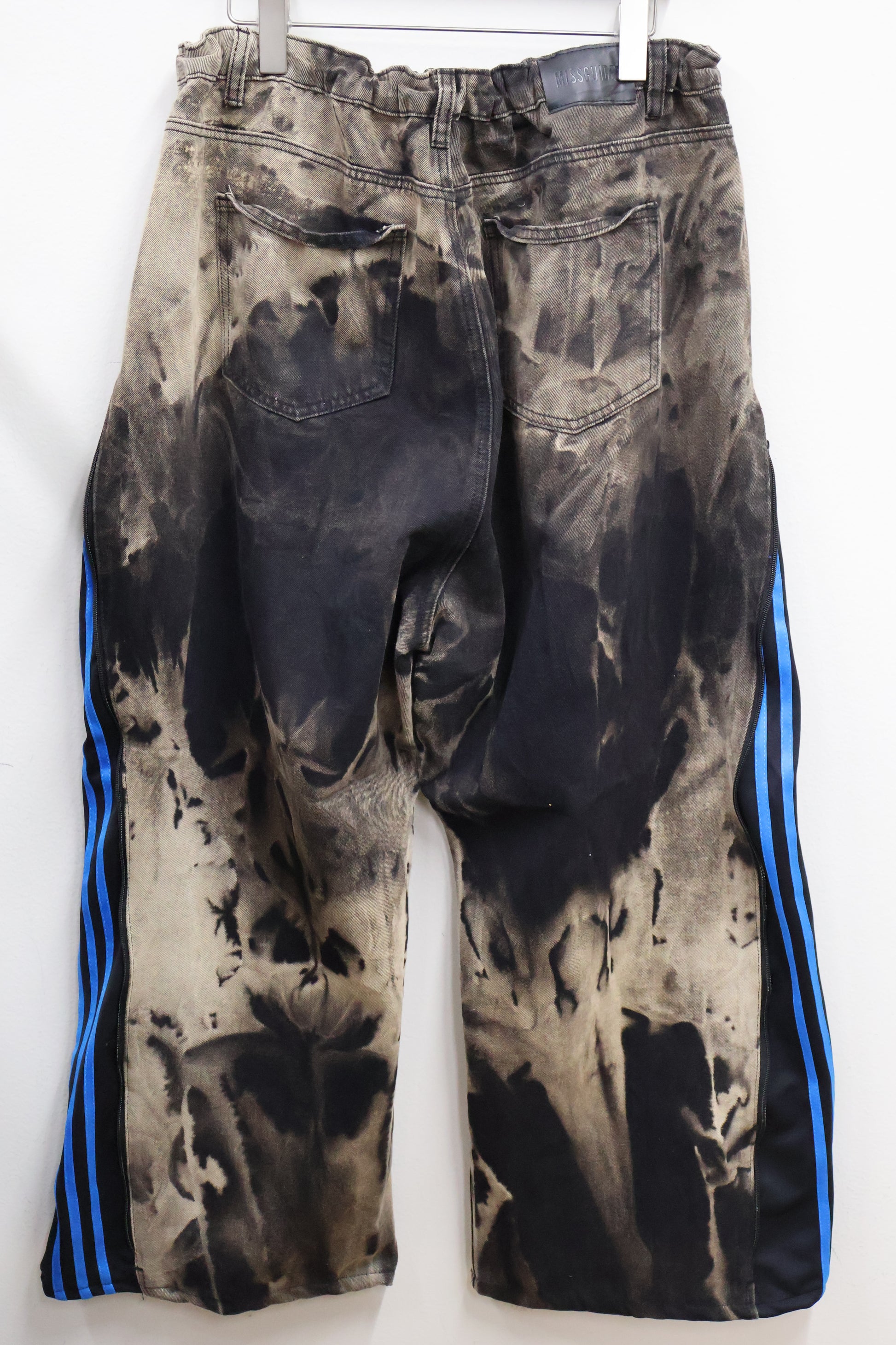 ウォッシュ加工されたブラック〜グレーのデニムに、サイドにはトラックパンツのラインディテールを組み合わせたインパクトのあるデザインです。