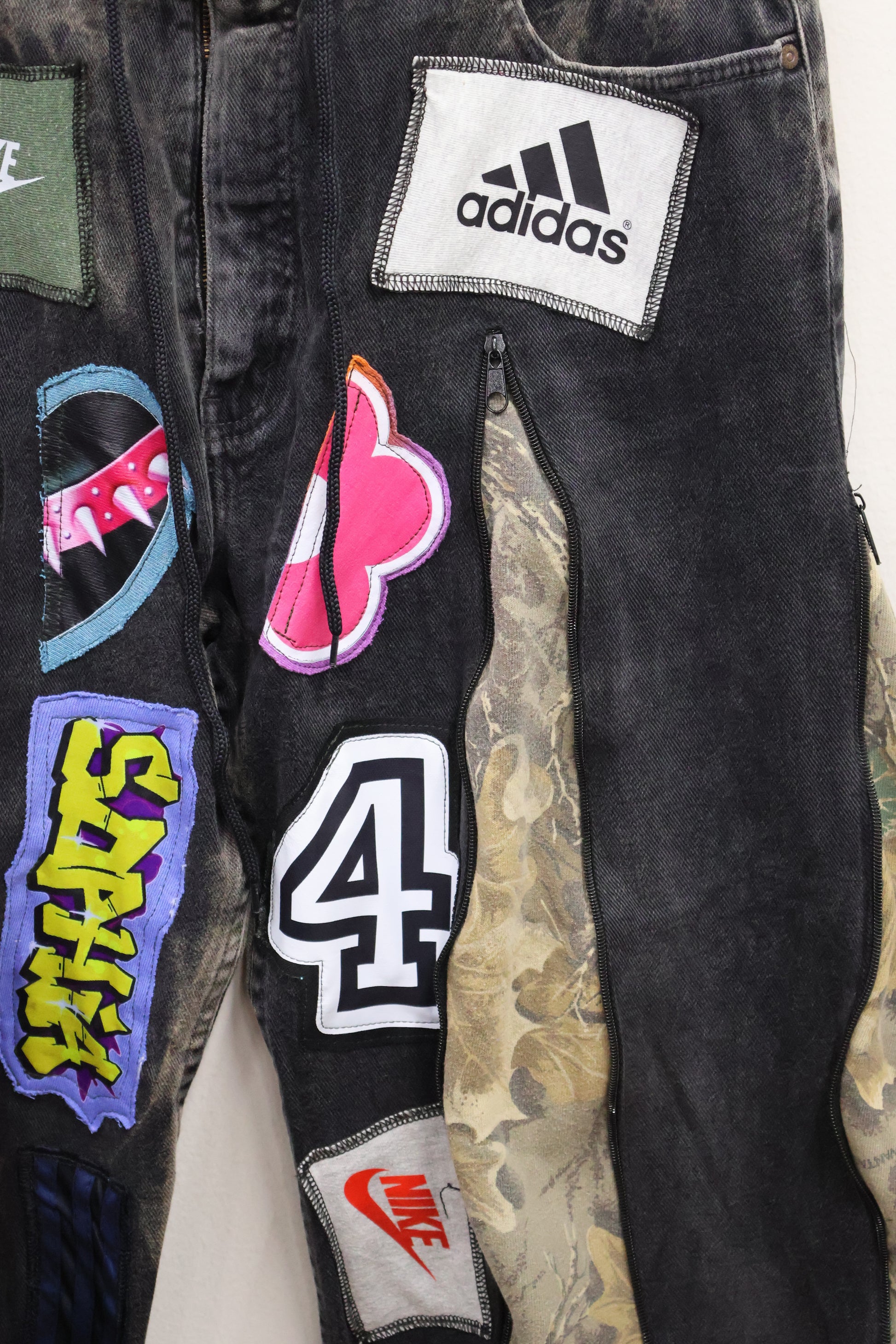 ウォッシュ加工されたブラック〜グレーのデニムに、サイドにはトラックパンツのラインディテールを組み合わせたインパクトのあるデザインです。