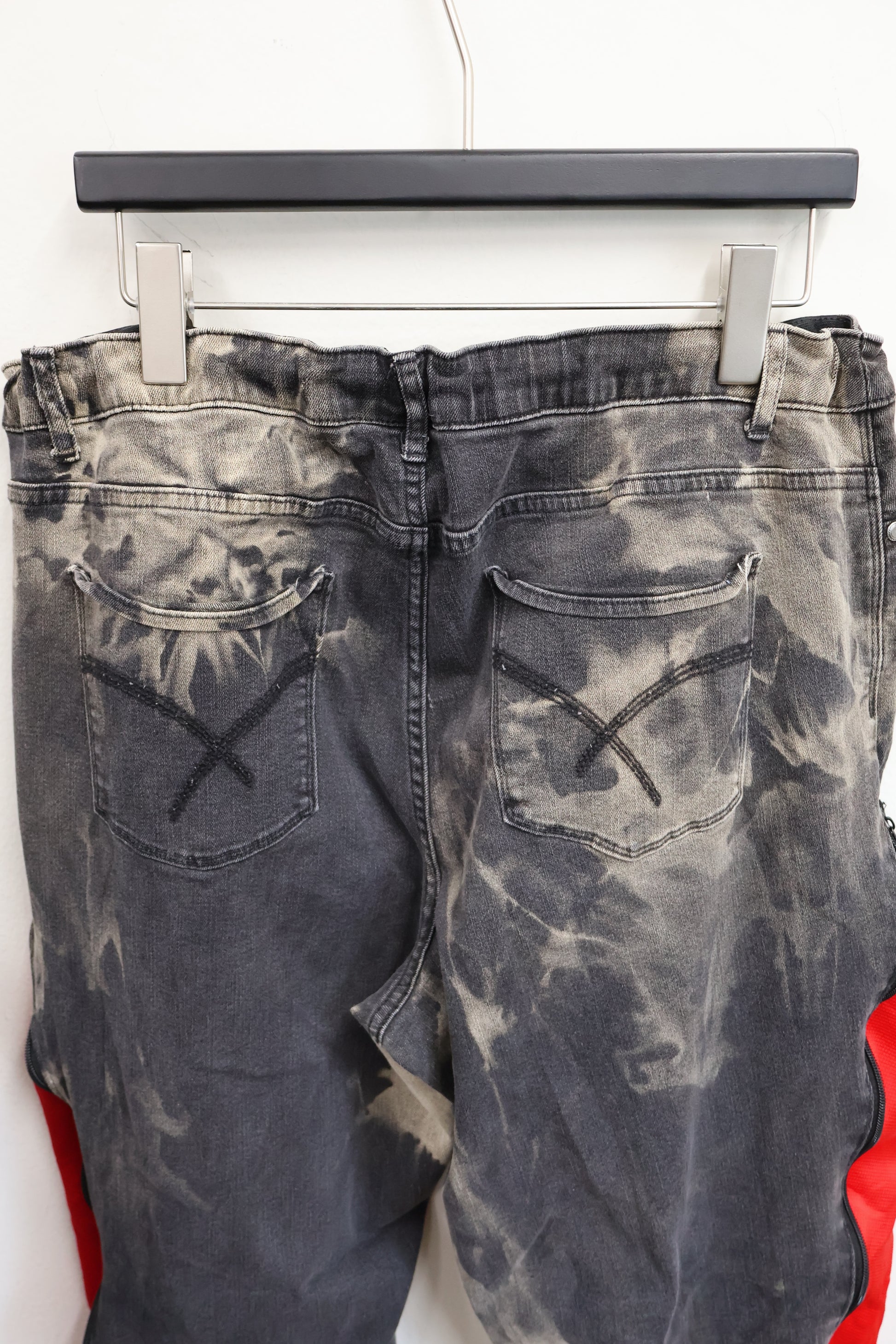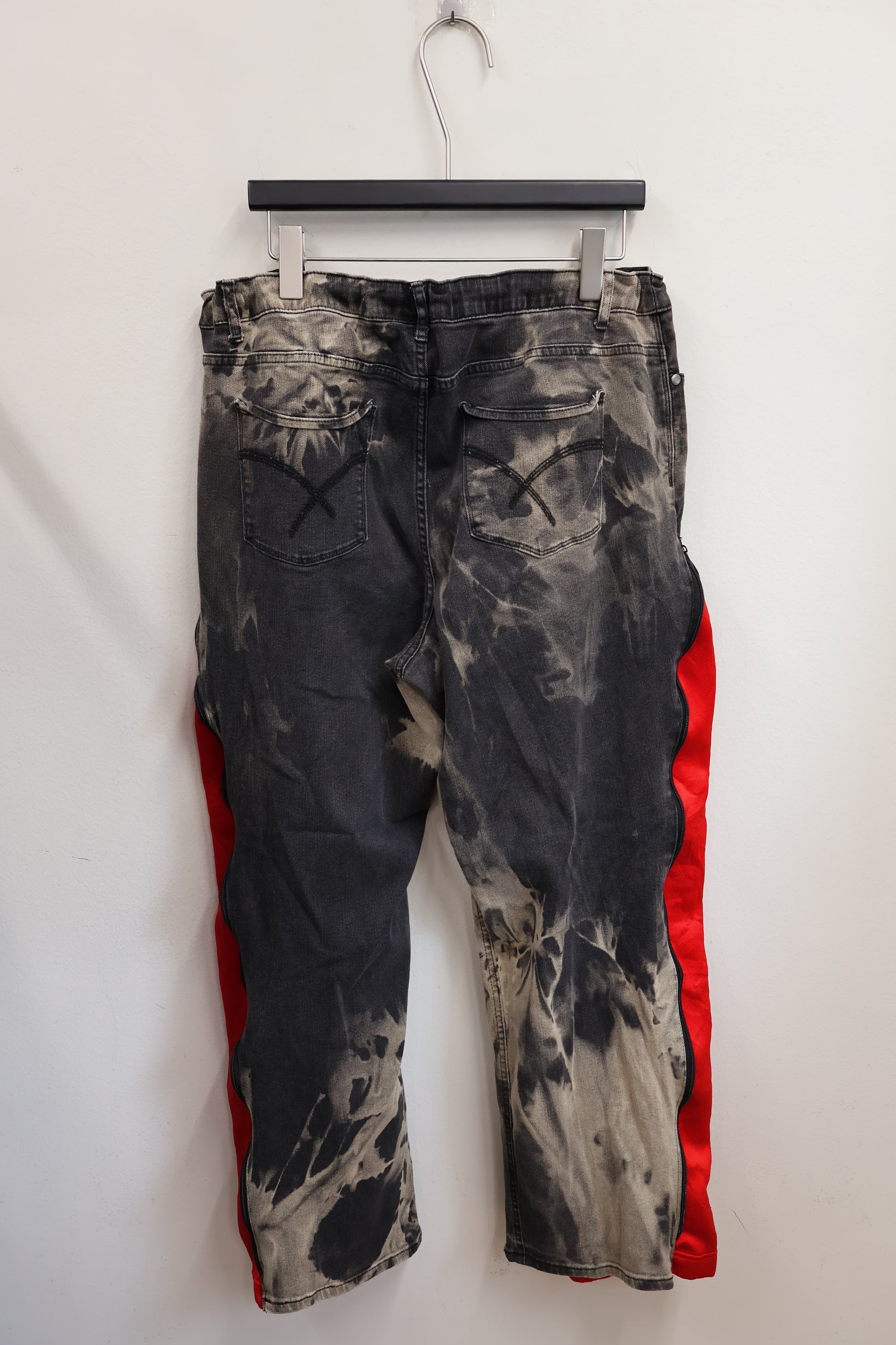 ウォッシュ加工されたブラック〜グレーのデニムに、サイドにはトラックパンツのラインディテールを組み合わせたインパクトのあるデザインです。
