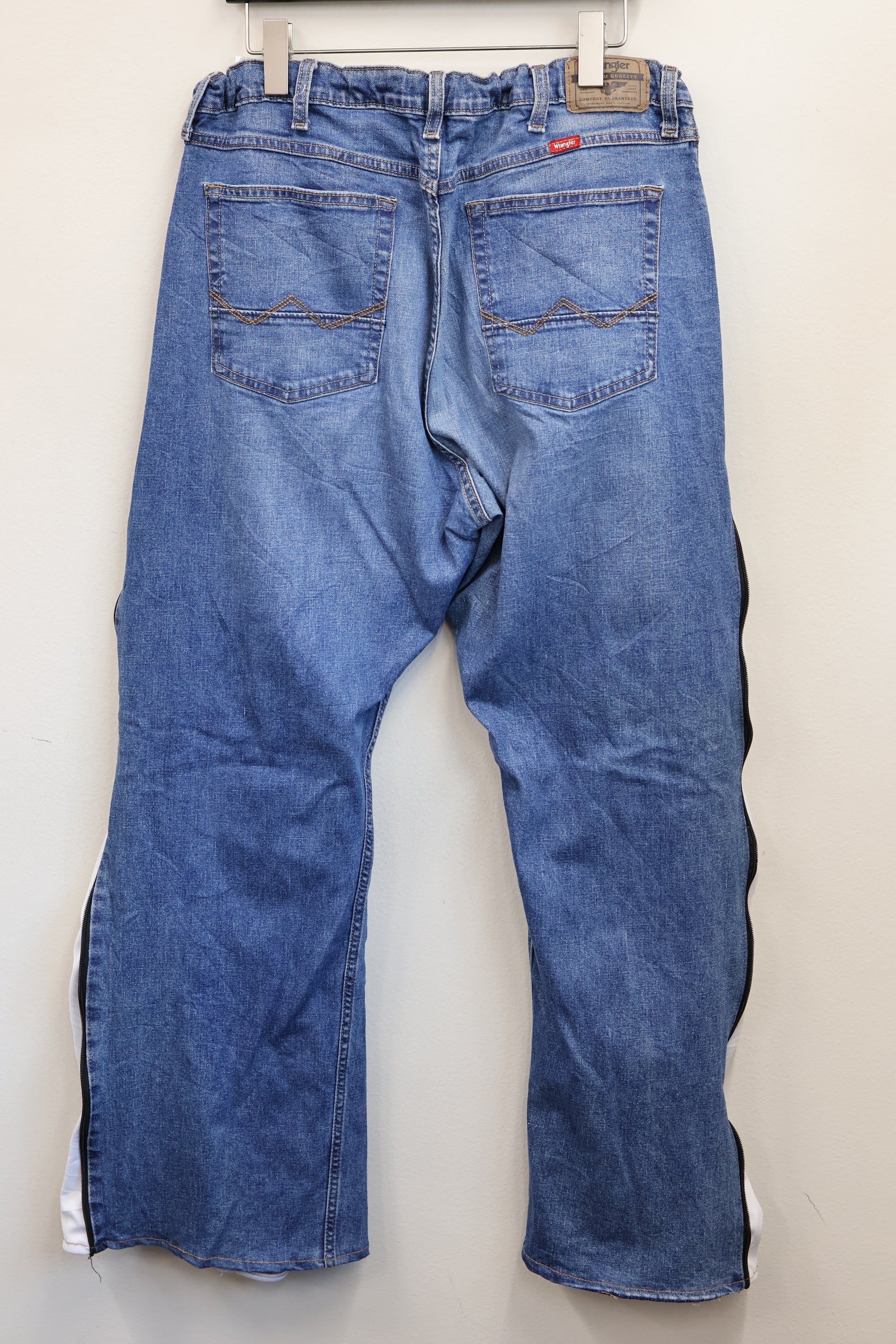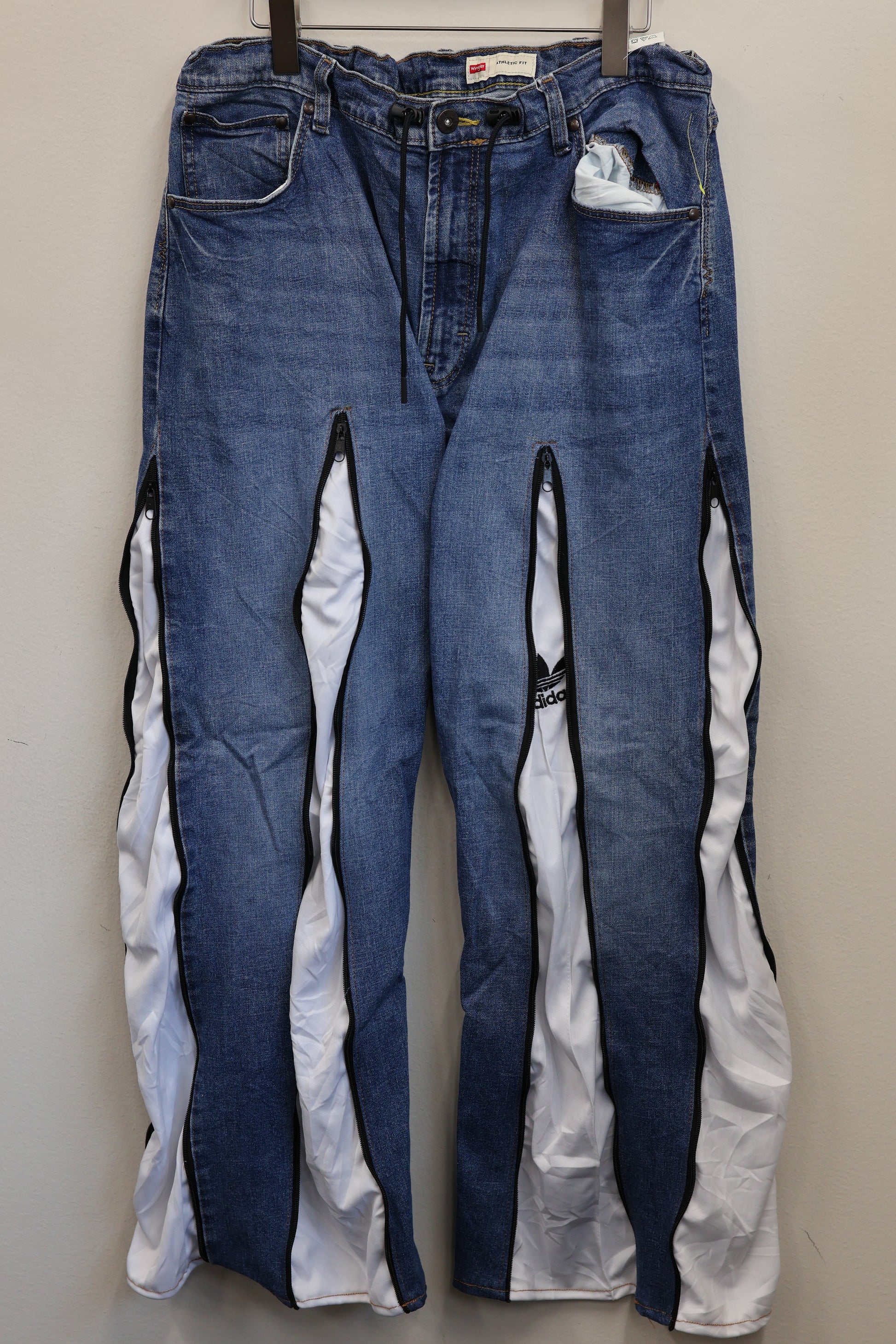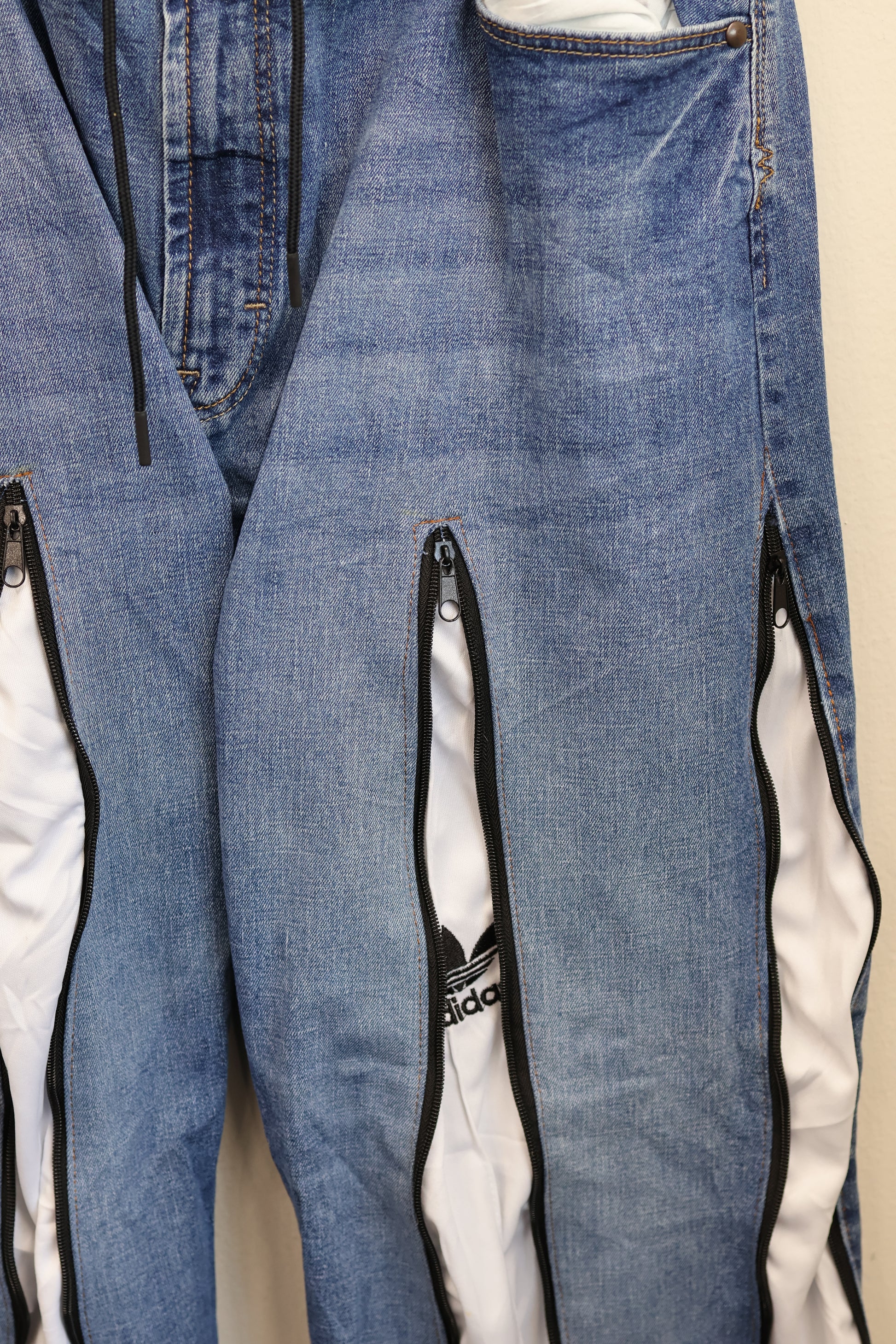 古着のデニムとジャージでリメイクされた1点もののパンツ。