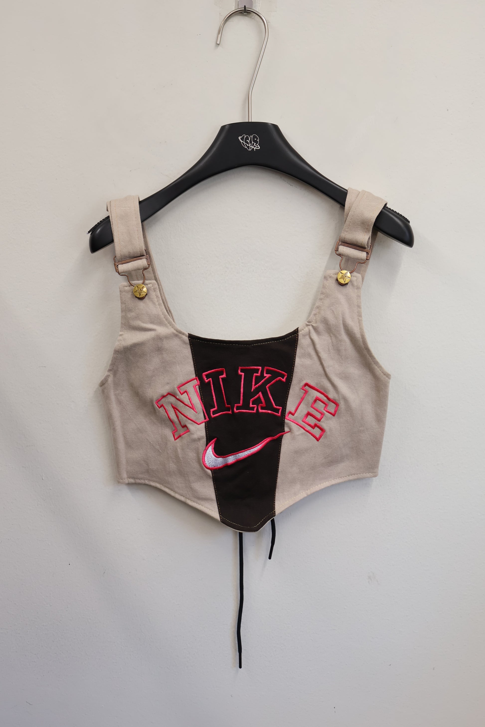 デニムとスポーツロゴを掛け合わせた、Y2Kムード全開のビスチェトップ。