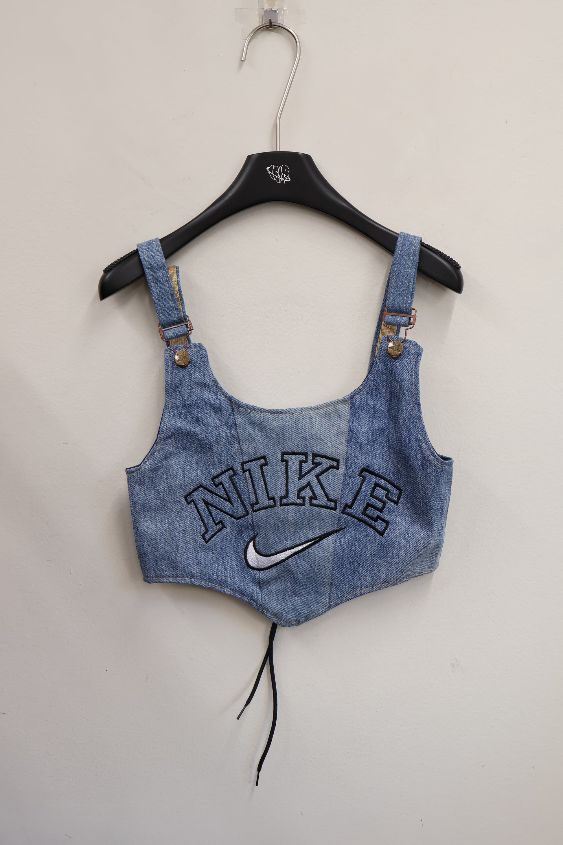 デニムとスポーツロゴを掛け合わせた、Y2Kムード全開のビスチェトップ。