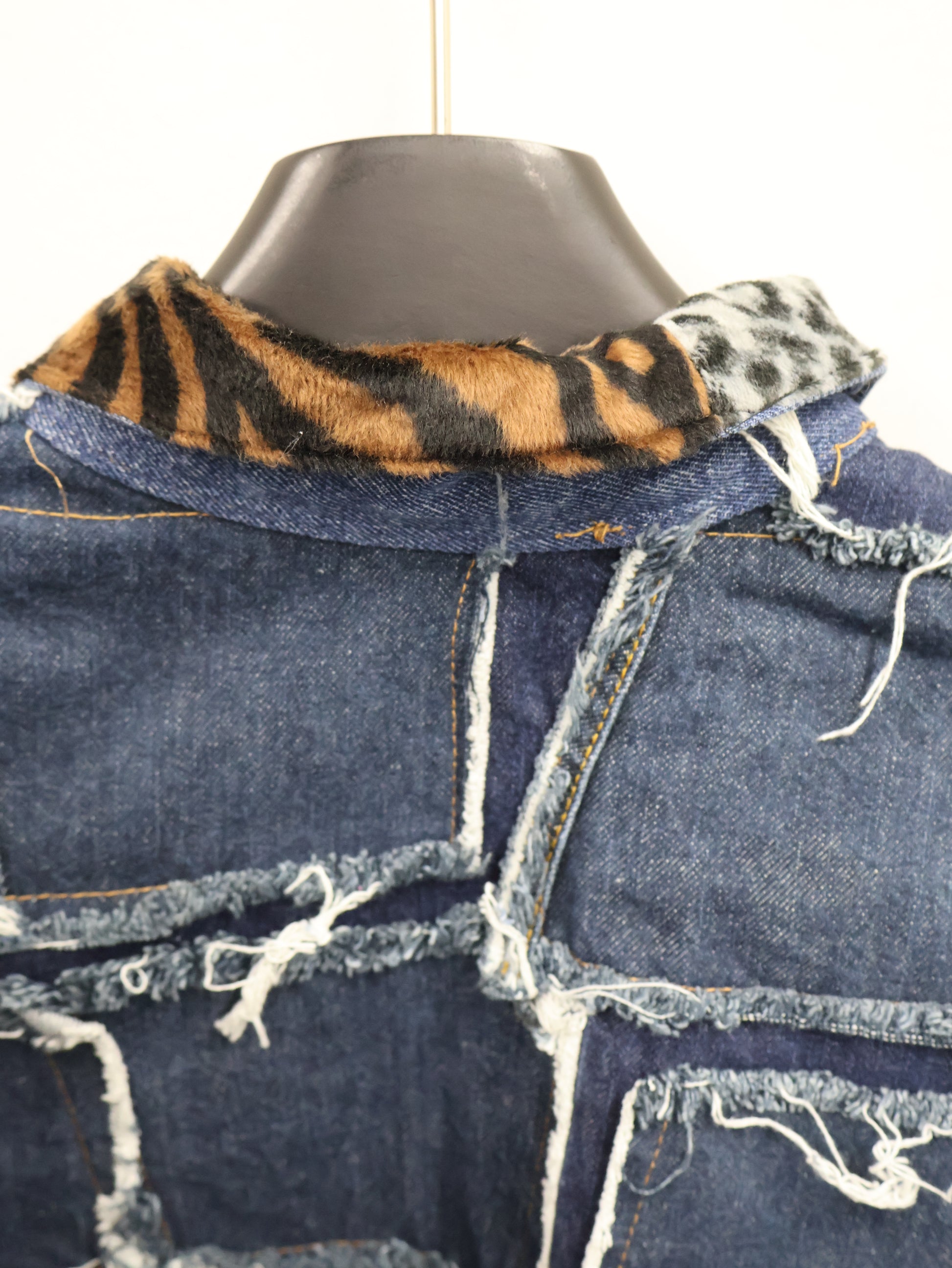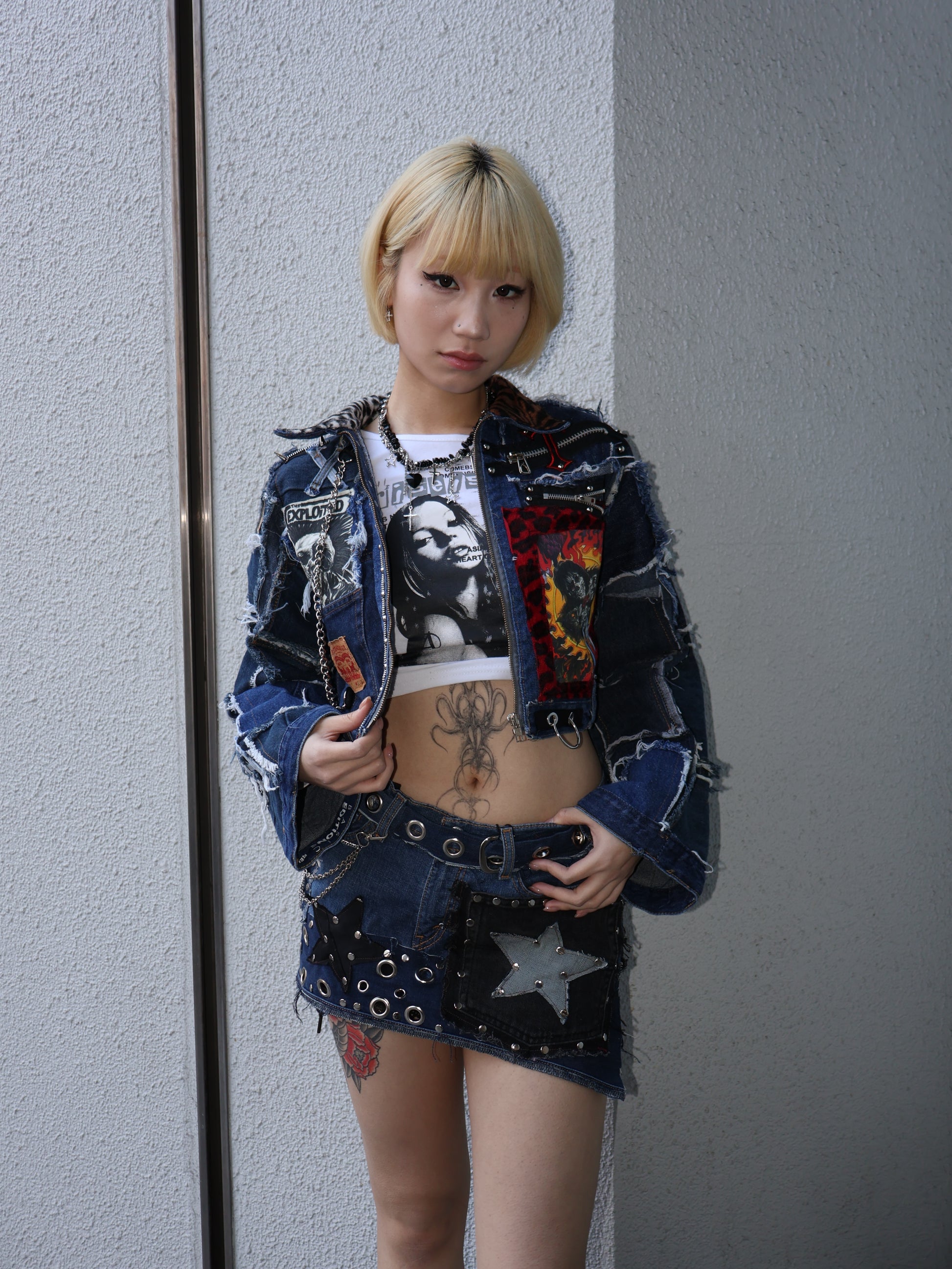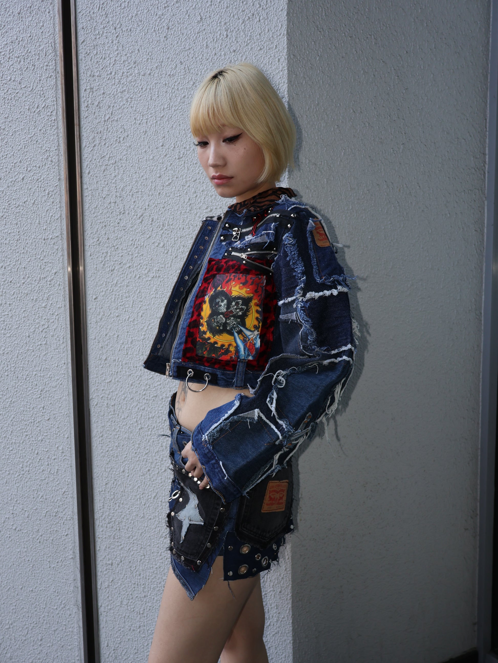 クラッシュ感のあるデニムをベースに、パッチ・ジップ・金具ディテールを重ねた存在感抜群のクロップドジャケット。