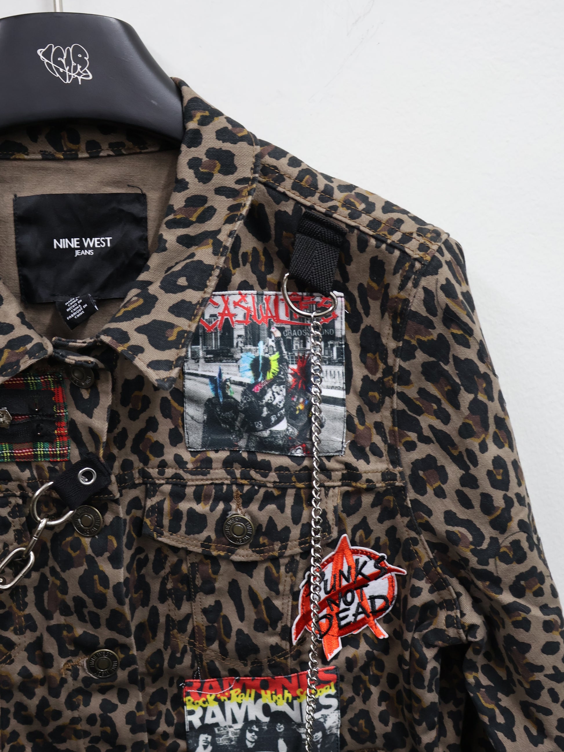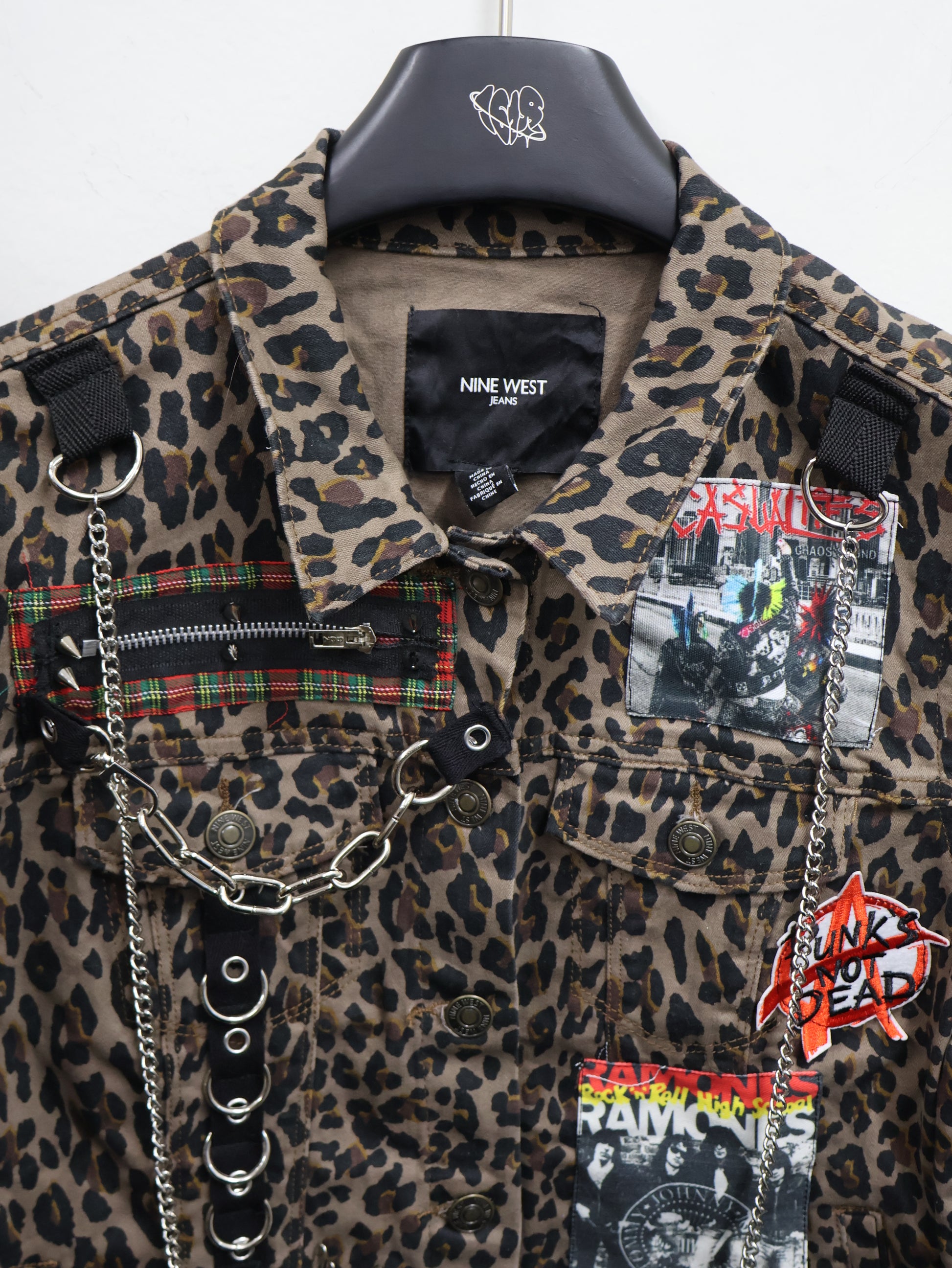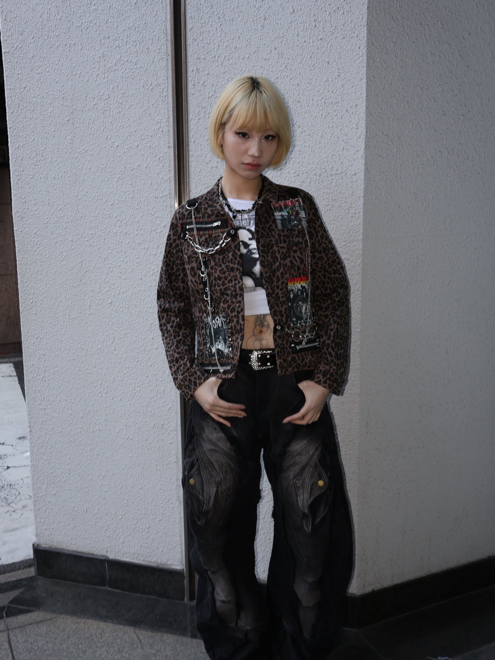 レオパード柄をベースに、チェーン・ジップ・パッチを重ねた一点物感たっぷりのショート丈ジャケット。