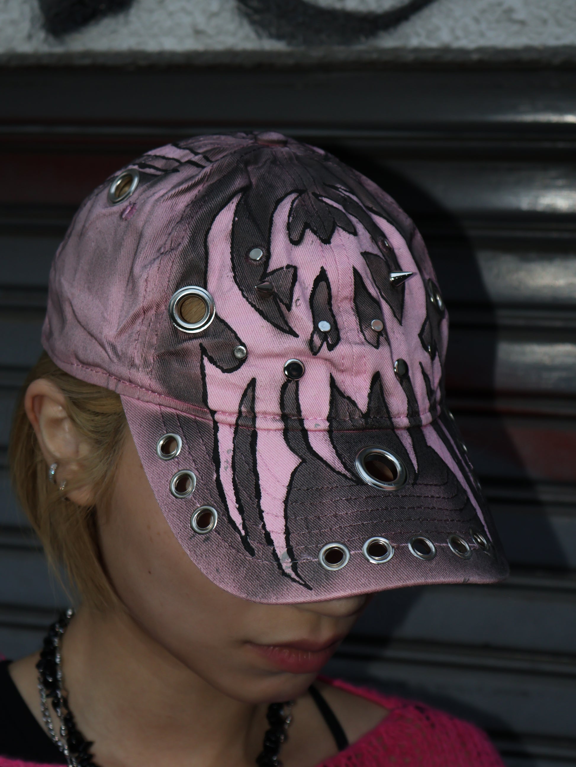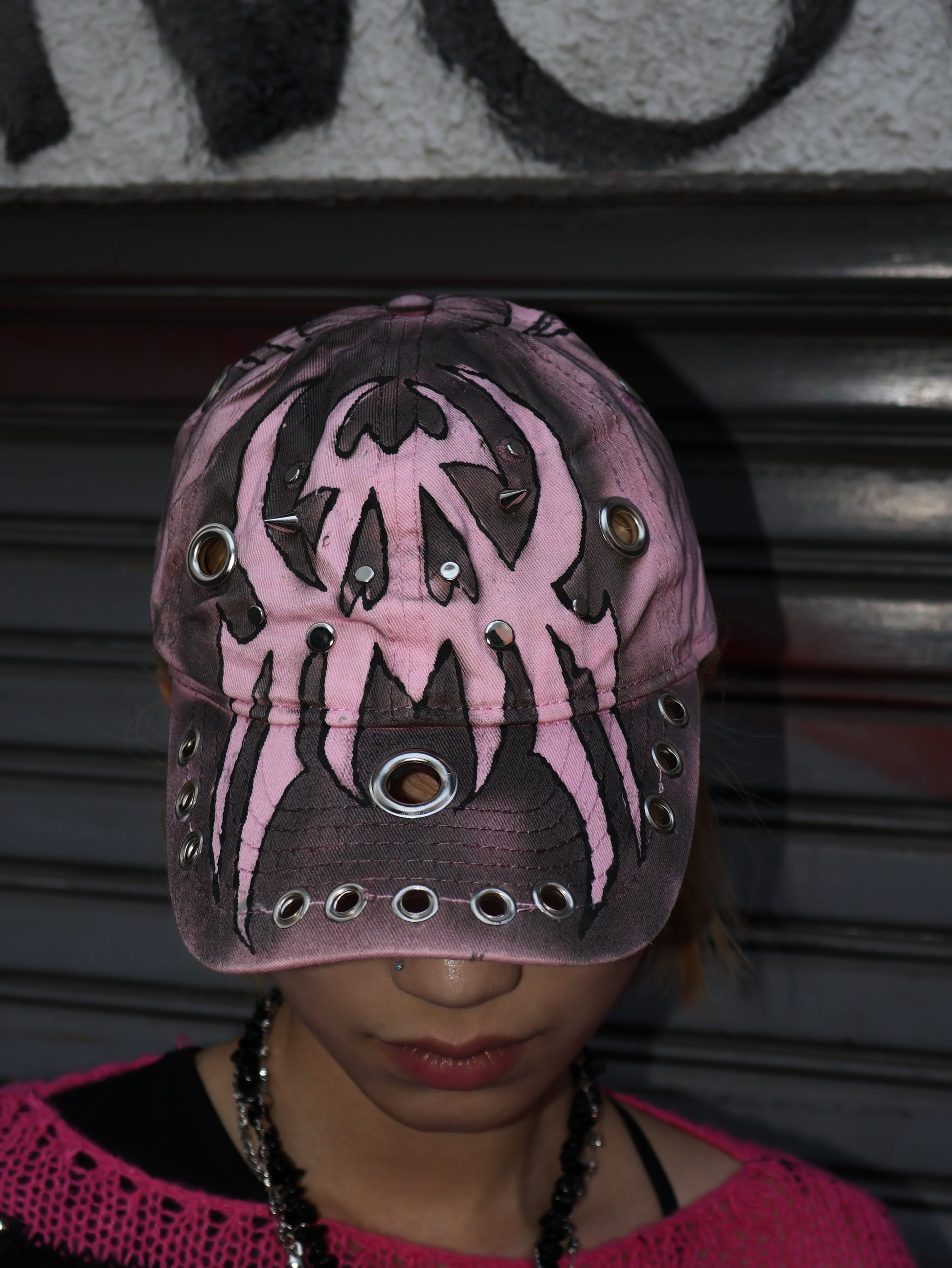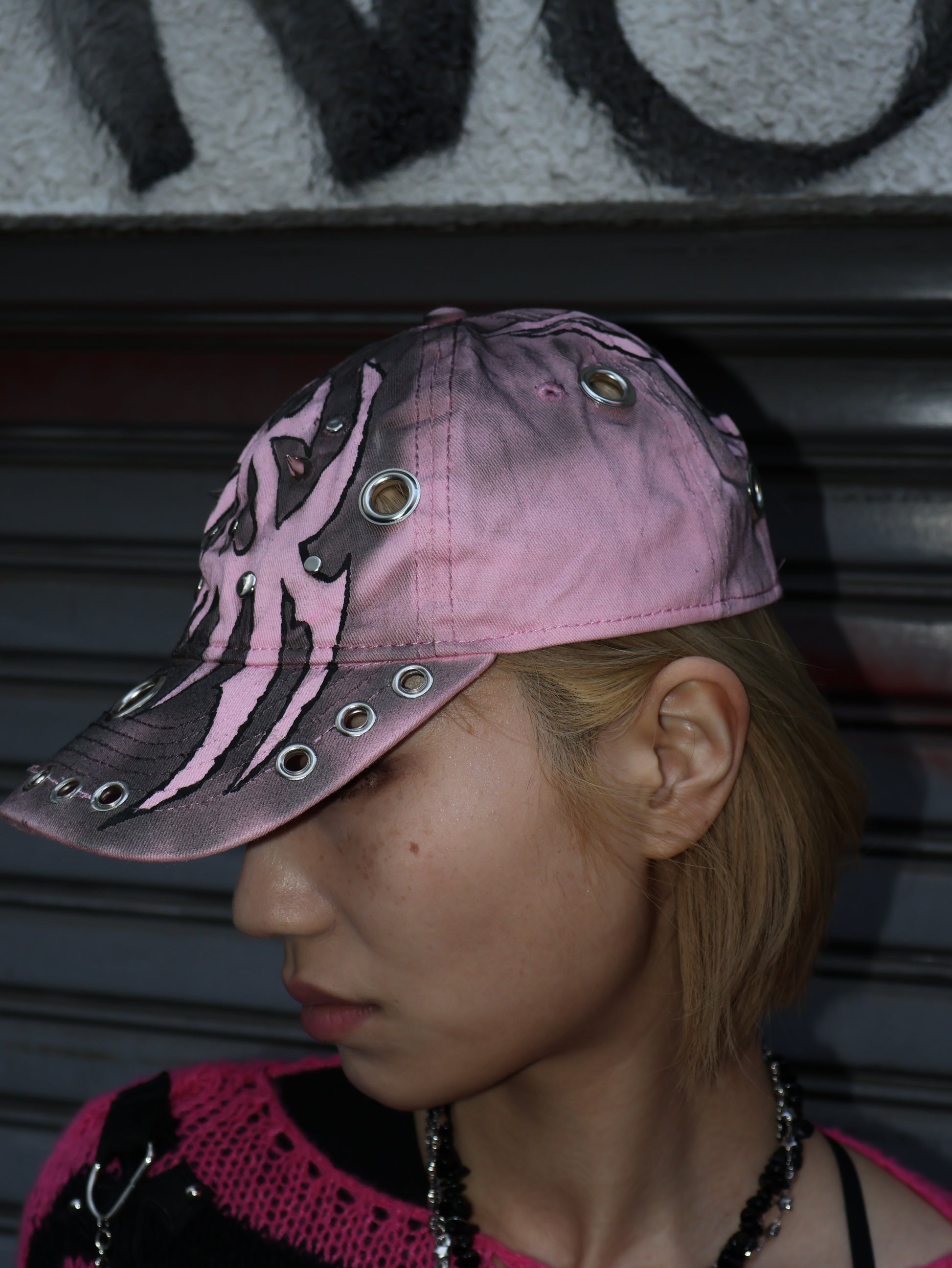 ハンドペイント×アイレット装飾で、被るだけでコーデにエッジと盛れ感をプラス。甘さも強さも振れる万能アクセ。