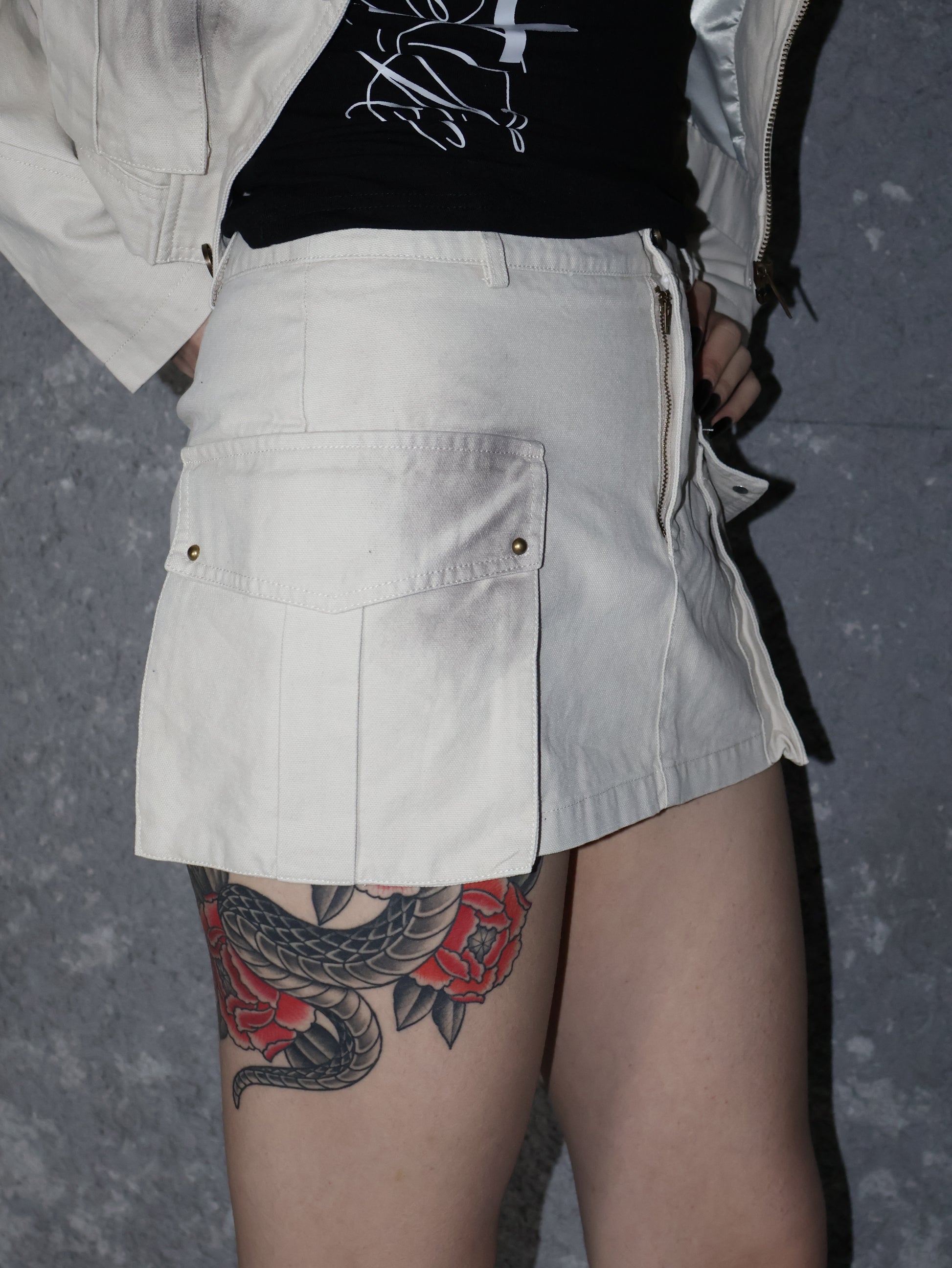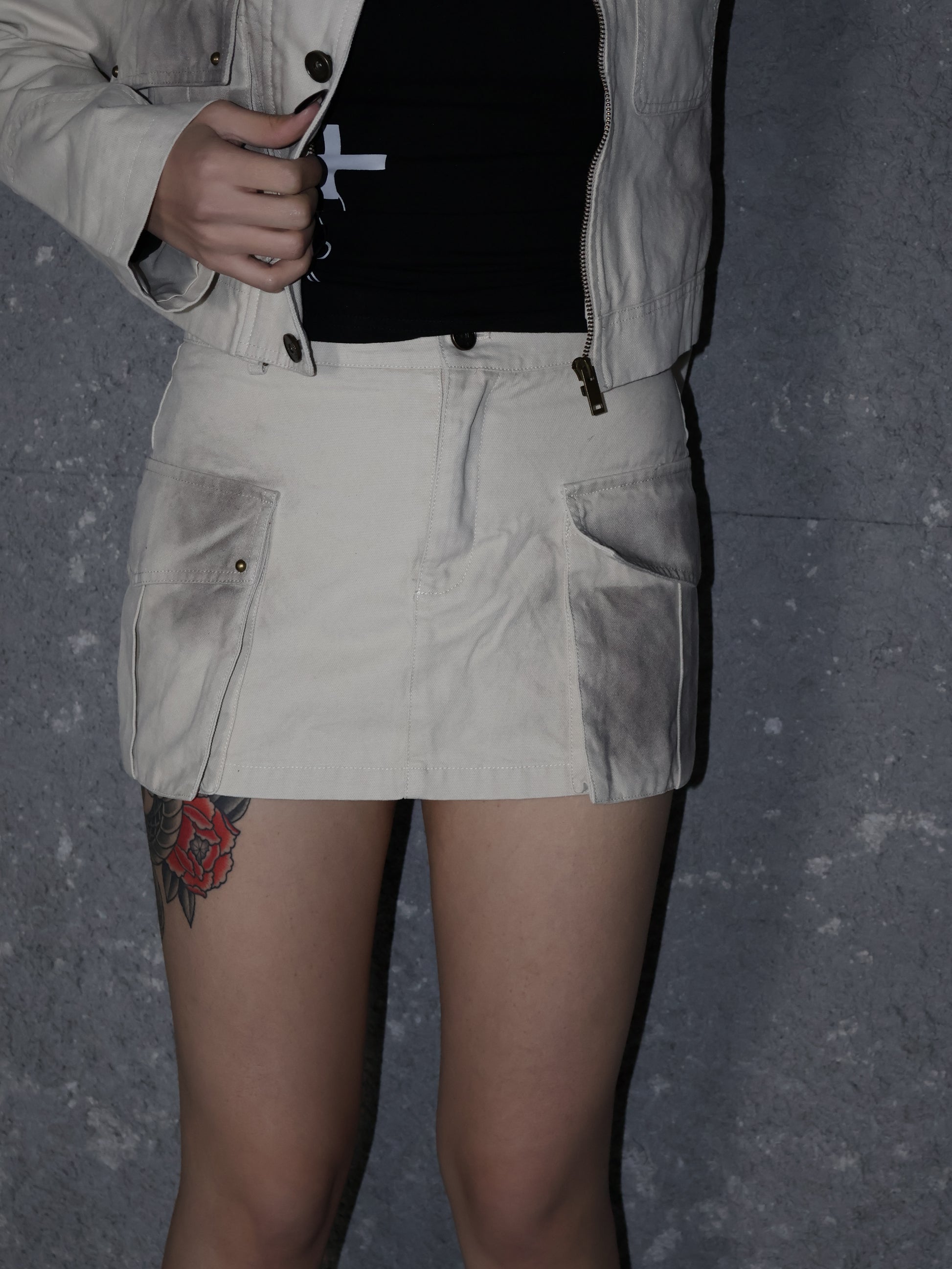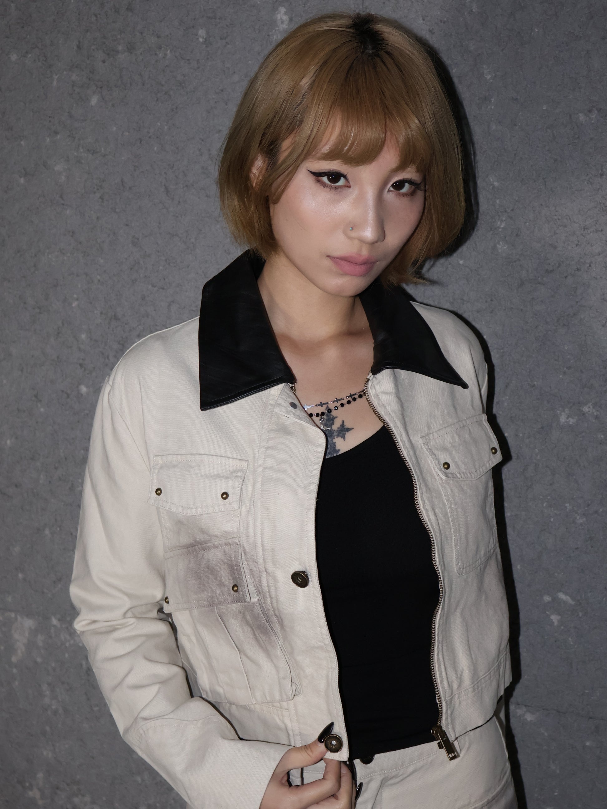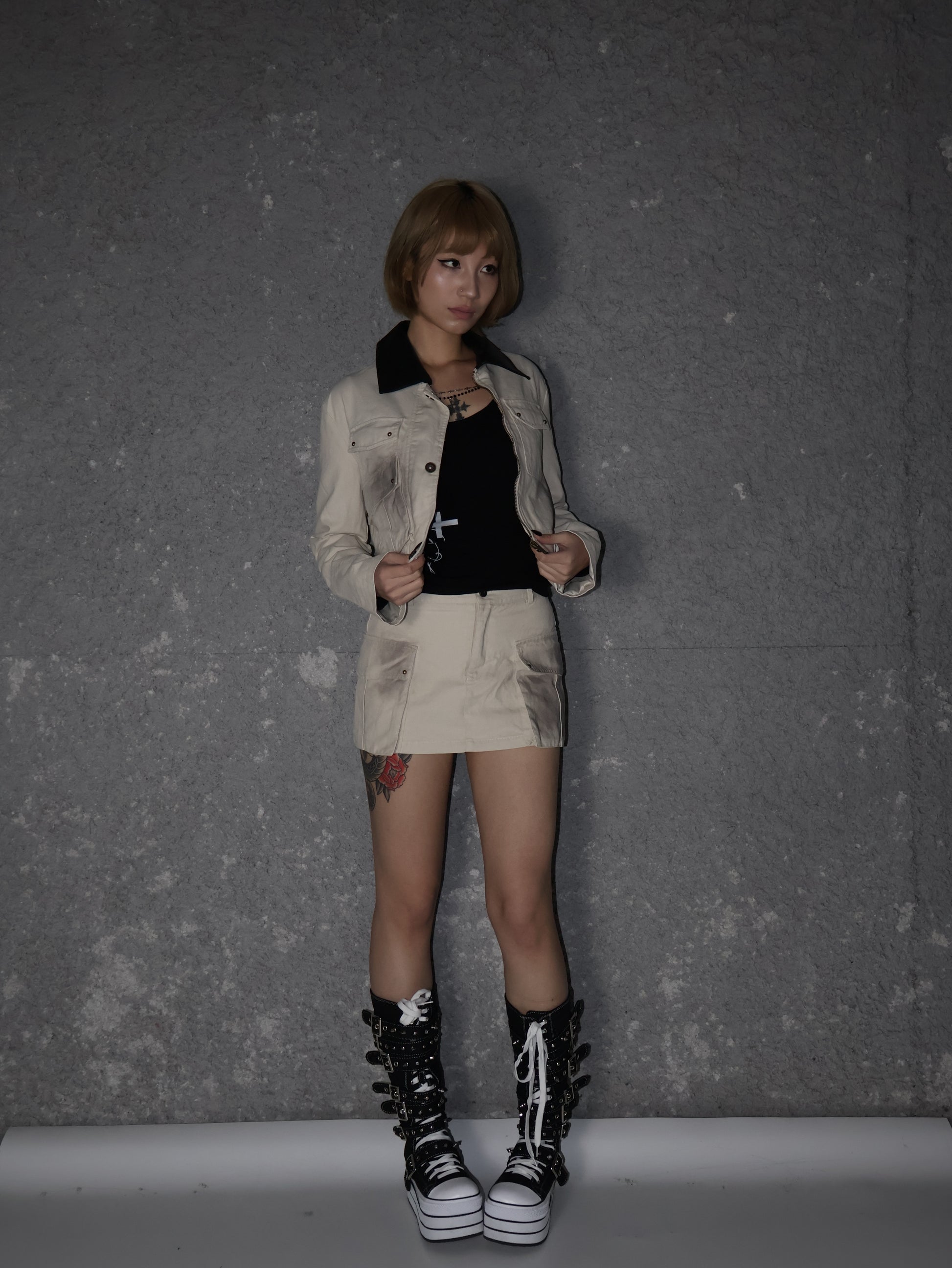 くすみベージュに立体フェードを効かせた、Y2Kストリート感強めのセットアップ。ジャケットはコンパクトに、スカートはミニシルエットで脚のラインを綺麗に見せてくれる“盛れバランス”がポイント。セットでも単品でも使いやすく、韓スト〜平成ギャルまで幅広くハマる主役級アイテム。