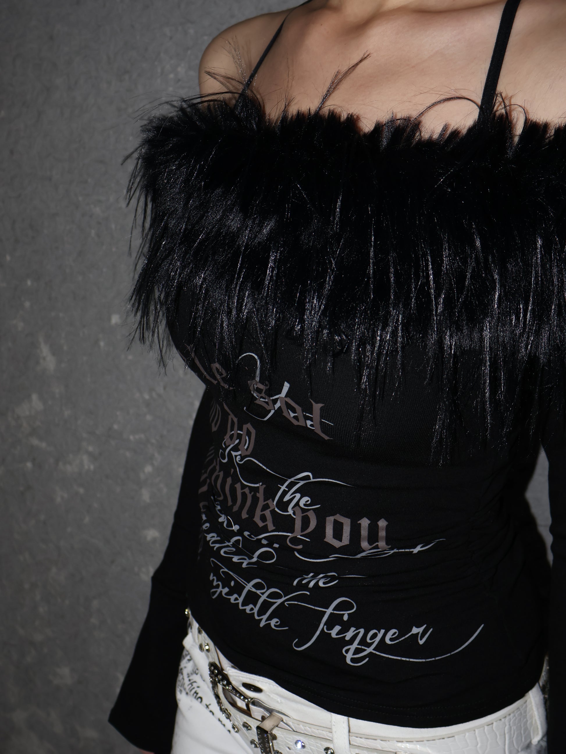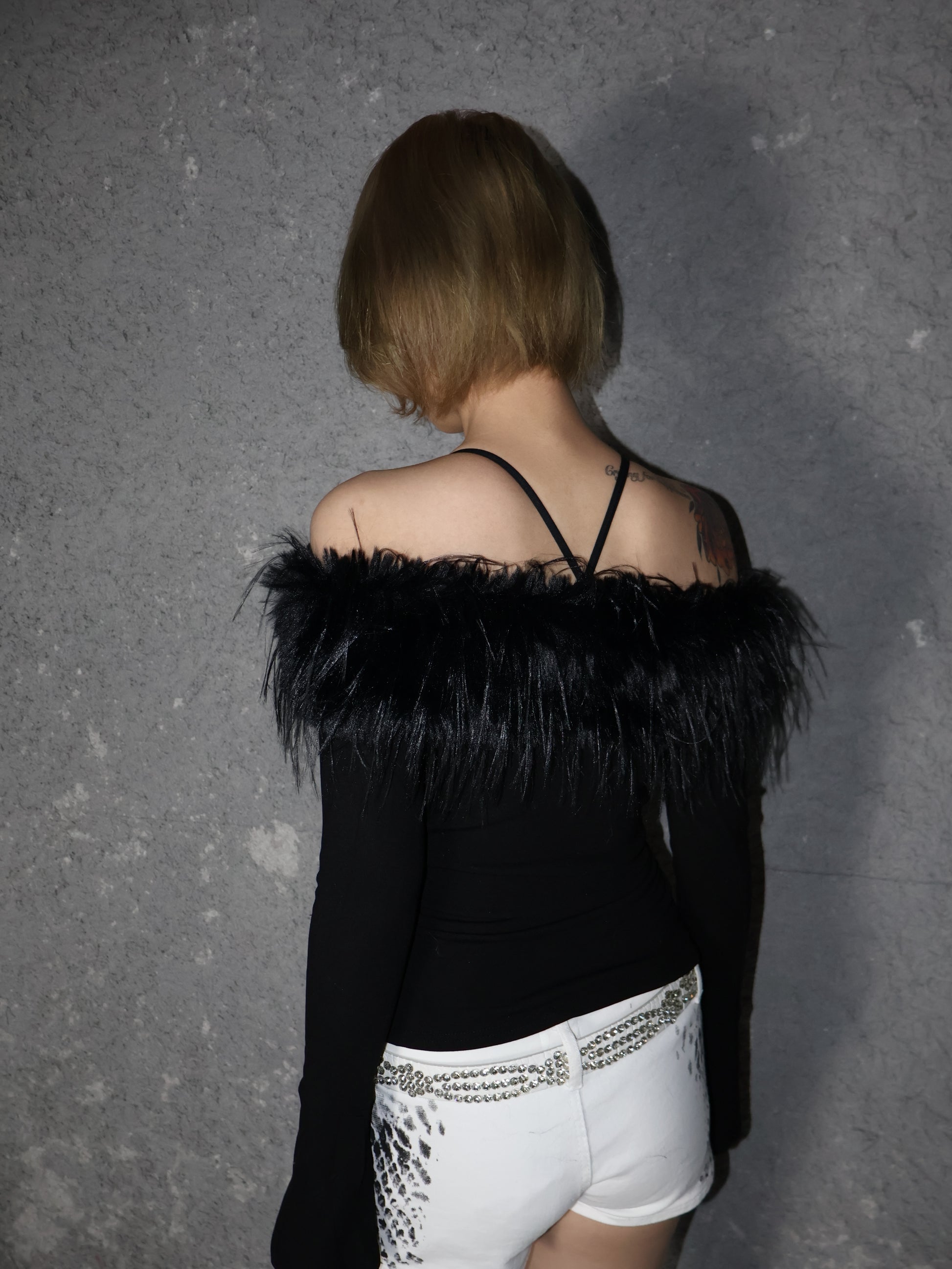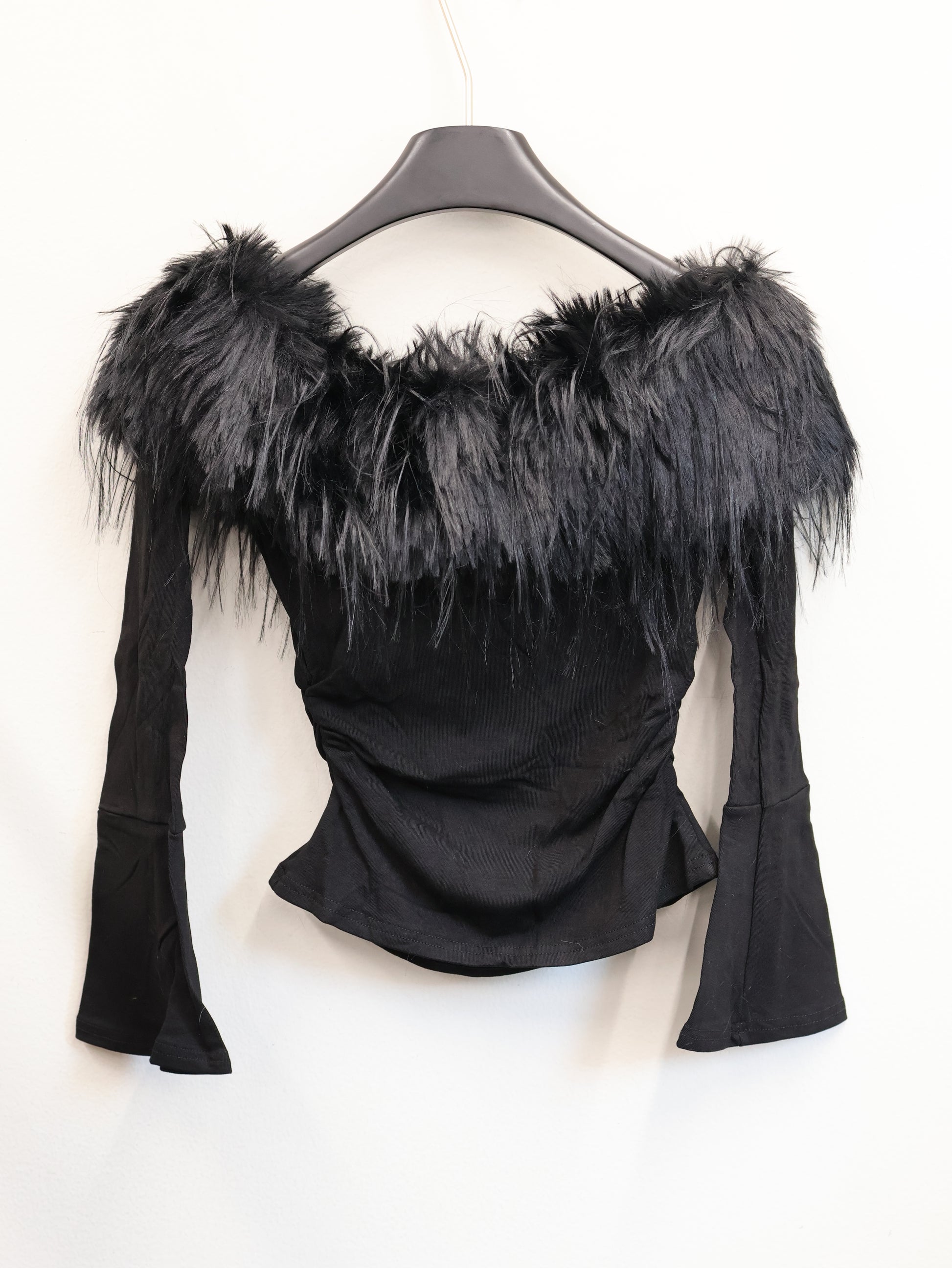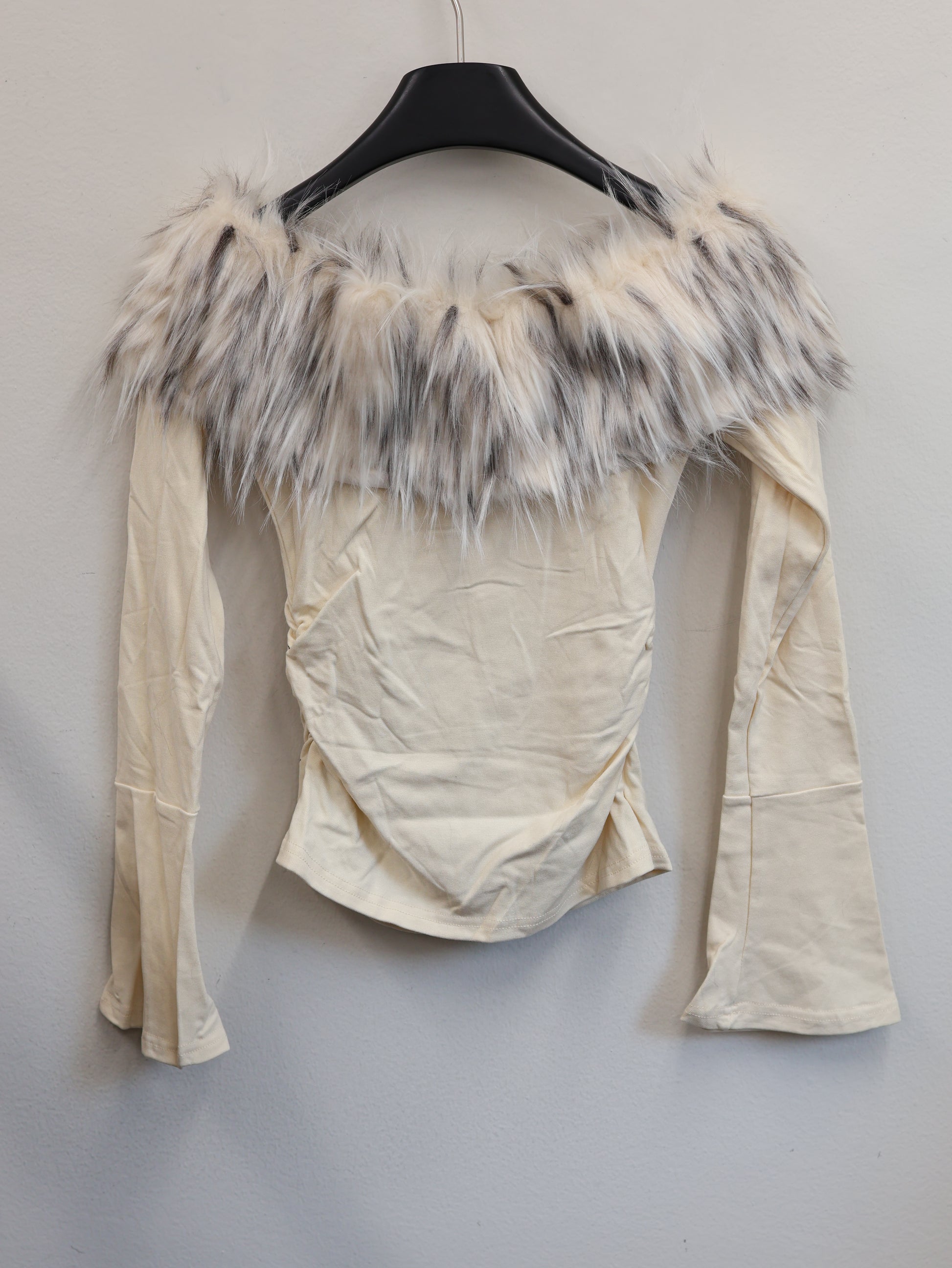 肩まわりに大きめフェイクファーをぐるっと配した、インパクト抜群のオフショルダートップス。